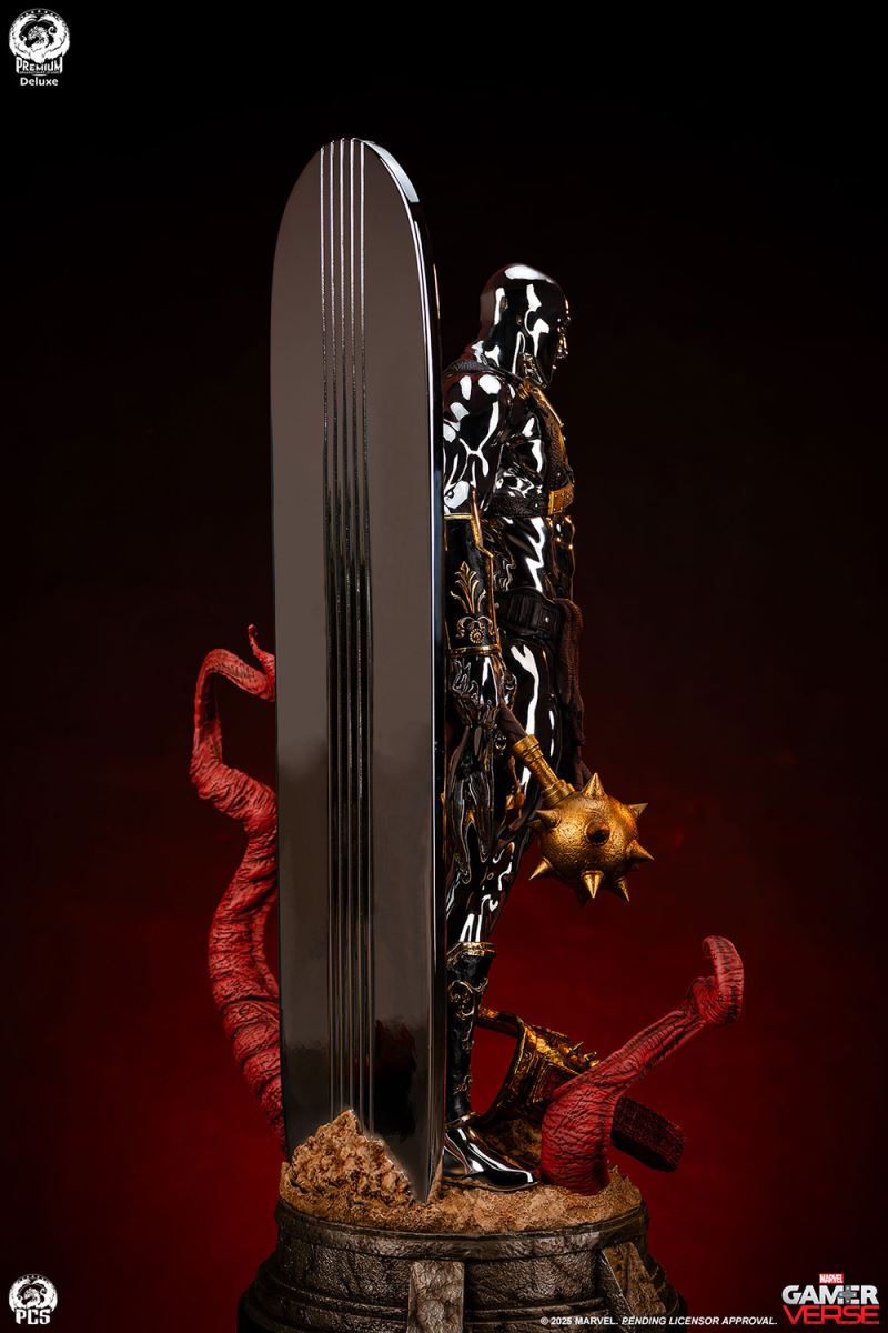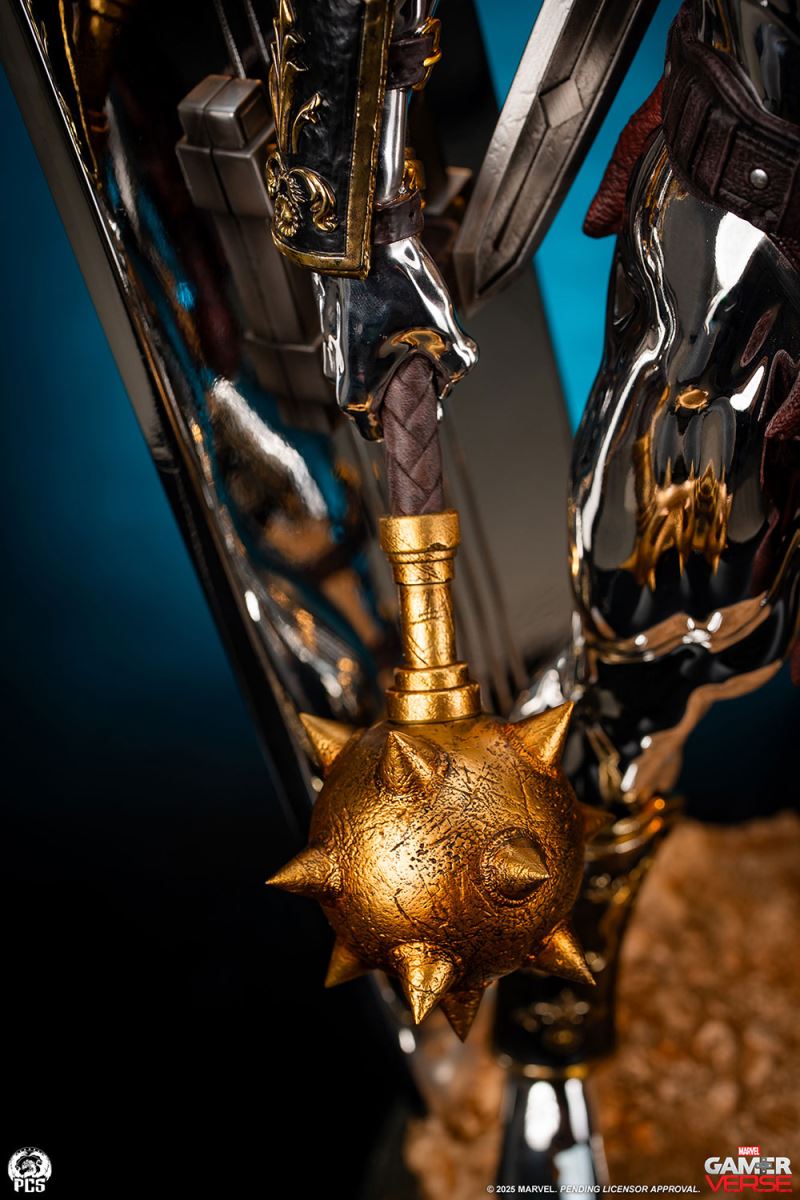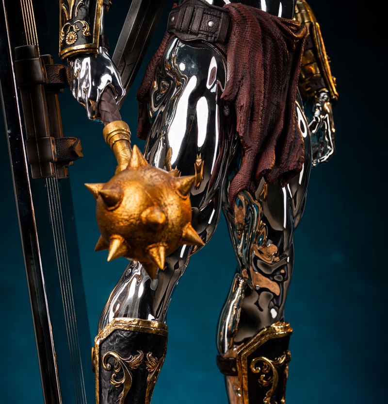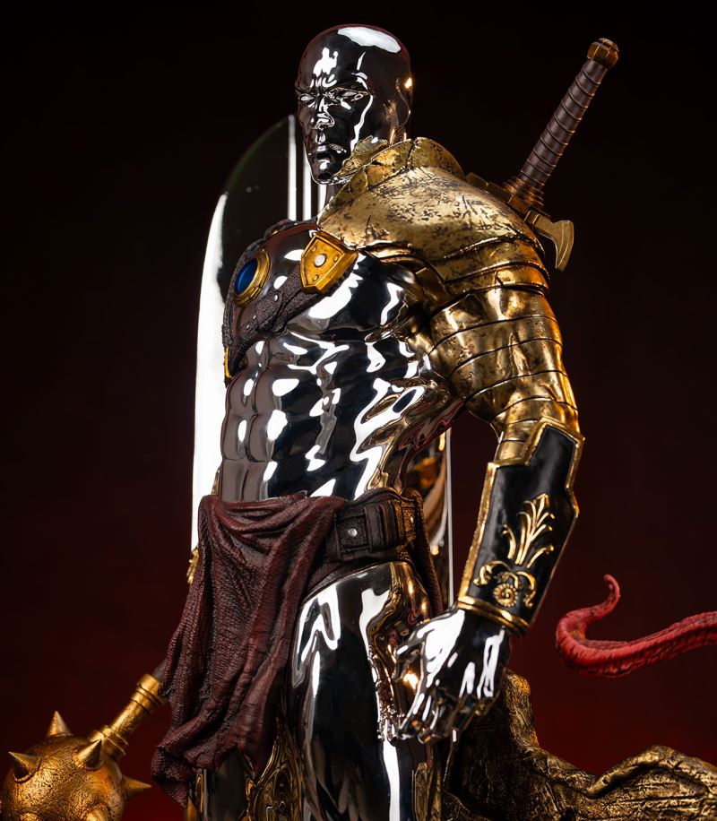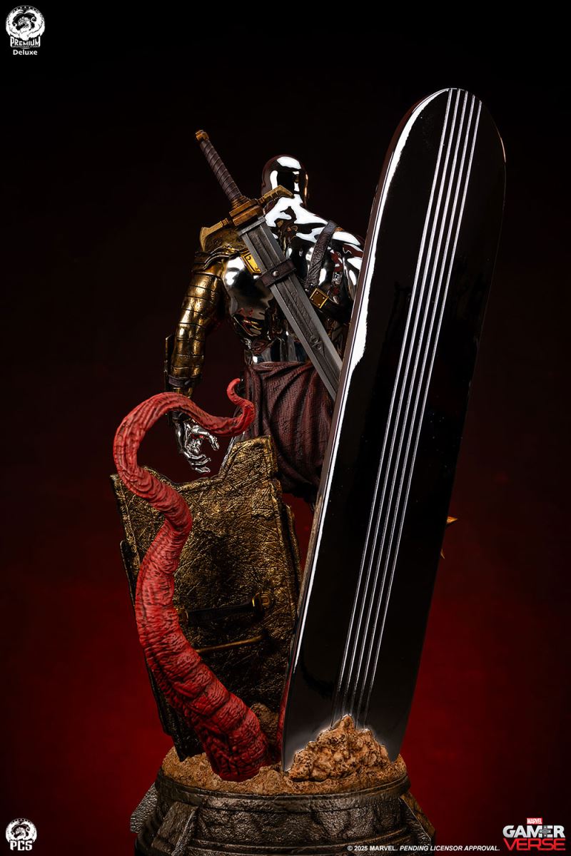 Sideshow and Premium Collectibles Studio proudly present the Silver Surfer - 1:3 Scale Statue, inspired by the interstellar herald’s gladiator variant in the smash hit mobile game, Marvel Snap! Standing an impressive 30.5“ tall, this beautiful collectible captures the stoic intensity of the Silver Surfer armed to battle against his will, (thanks to the blue control disc fixed to his chest) in the fighting pits of Sakaar. This popular rendition of the classic Marvel character is decked out in an assortment of armor and weapons cobbled together from the arena’s makeshift arsenal. The bulky bronze pauldron on his left shoulder is pitted with damage and connects to an array of straps that also acts as a sheath for the massive great sword on his back. His ornately decorated gauntlets and greaves, along with a reddish-brown loincloth give this galactic traveler a distinctly Roman look, fitting for the massive arena he’s held captive in. The Silver Surfer himself is covered in a dazzling, reflective chrome finish from head to toe. The finish appears even brighter when set against the battle worn armor and weapons he is adorned with. In his right hand he wields a spiked mace while behind him his iconic surfboard, fashioned into a makeshift shield, juts out from the base which has been sculpted with a realistic sand-like texture to recreate the feel of the harsh terrain. Set a course for adventure and add the Silver Surfer 1:3 Scale Statue by PCS to your Marvel Gamerverse collection today!Product SizeHeight: 30.5 (77 cm)Width: 15.5 (39 cm)Depth: 12.5 (32 cm) *