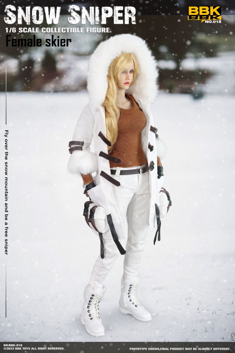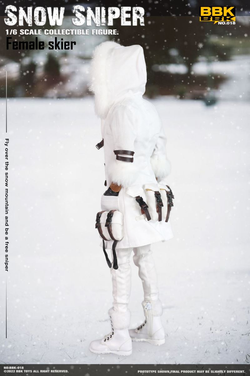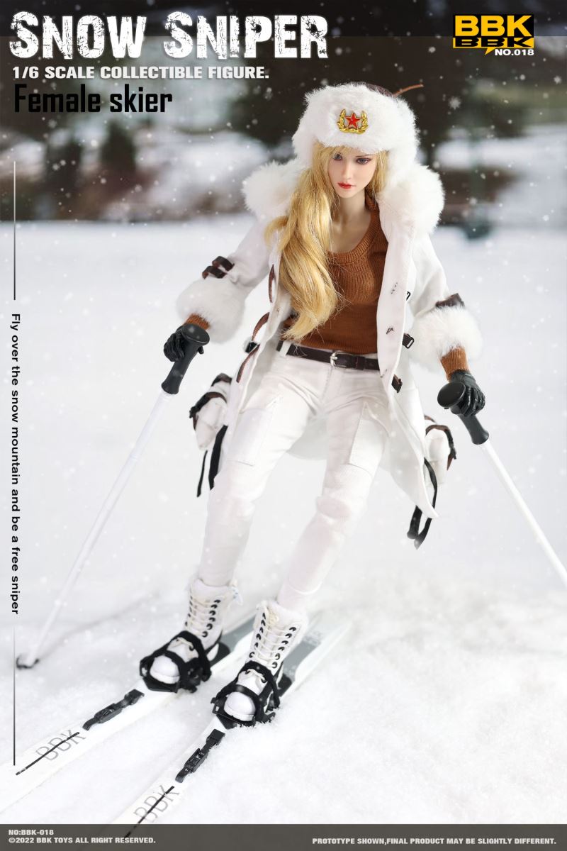 BBK: 1/6 #BBK018 Snow Sniper - Skier Snow Sniper action figure model Product List: 1. The head 2. body 3. Sports underwear 4. The coat 5. The pants 6. Snow Boots 7. hat8. Belt 9. the skis 10. The gun belt 11. M1911 pistol 12. The sniper rifle 13. One pair of skiers holding their poles 14. One pair of natural hands 15. Capture shooter 1 pair 16. Sniper rifle scope