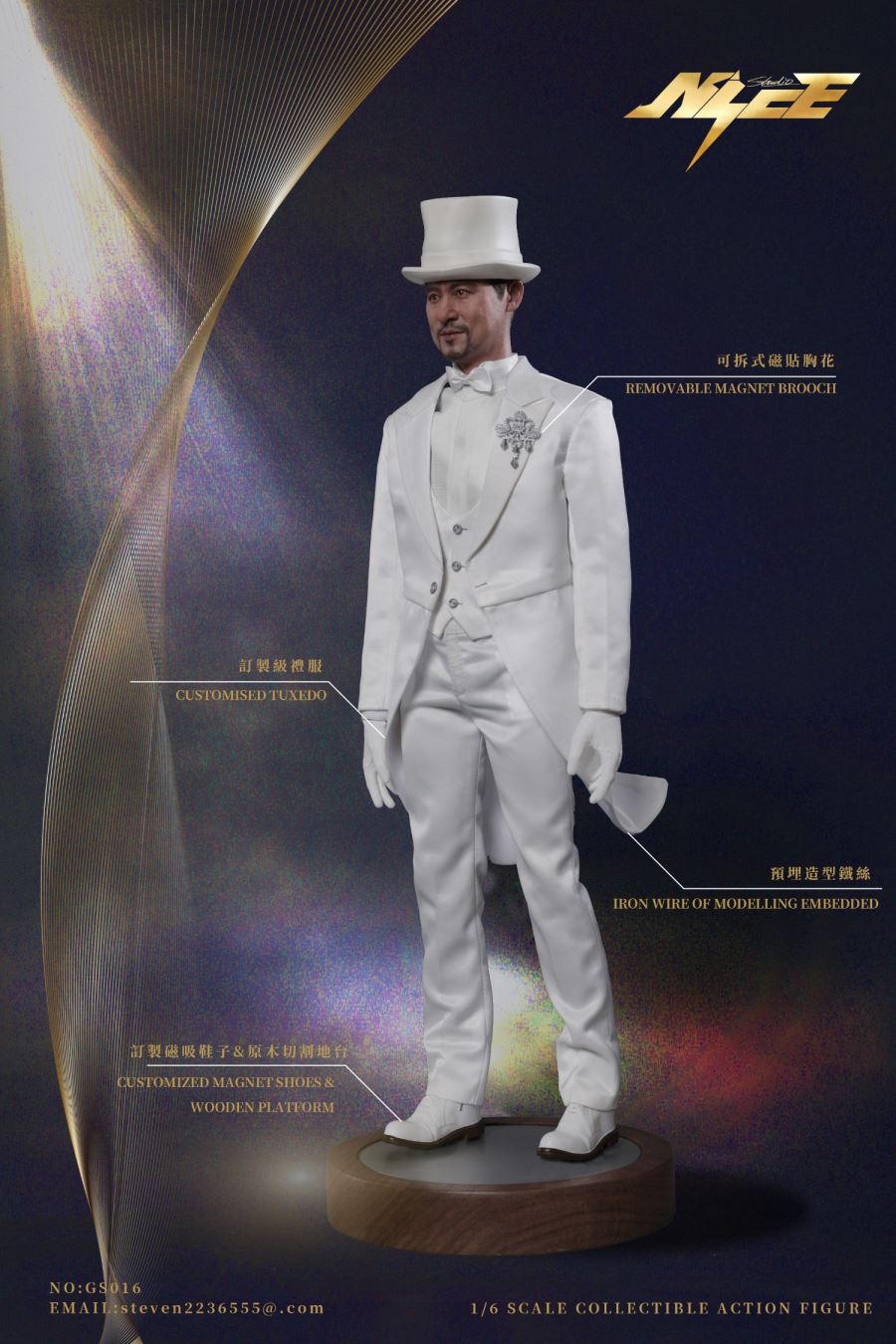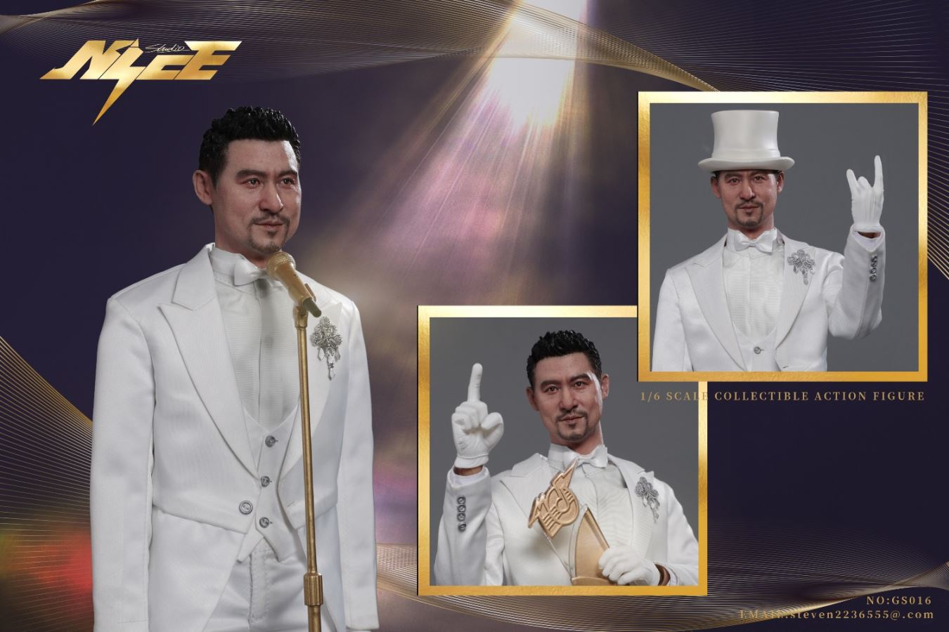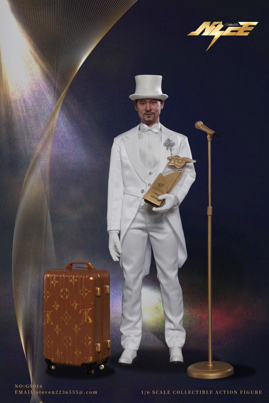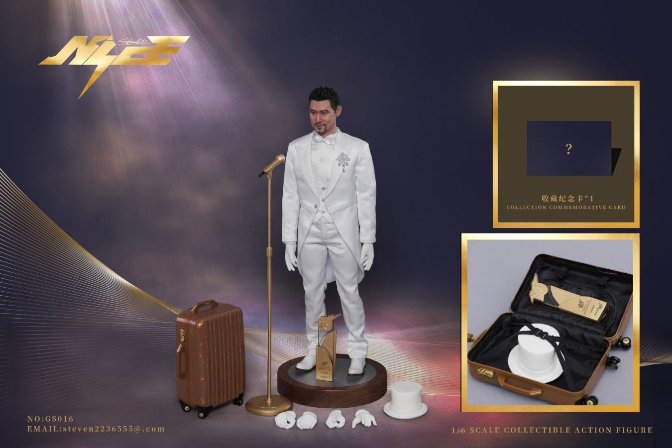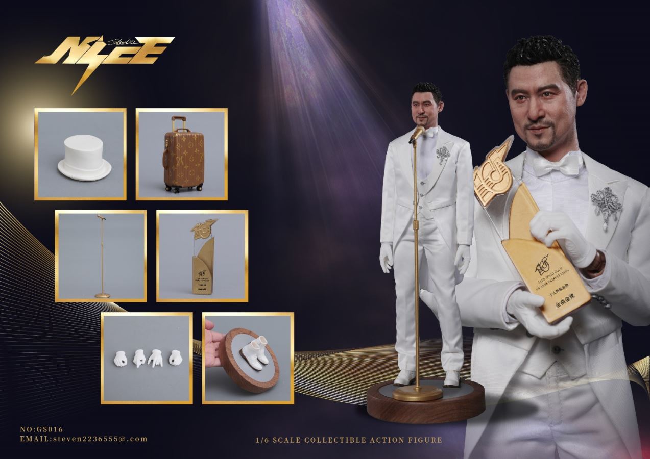 NICE STUDIO NO:GS016 Limited Edition Songs Of God 1/6 Scale Action FigureMaterials: Plastics、Alloys、ClothList:Head *1 1/6 Active body *1 Replace the hand type *6 Iron wire of modelling embedded white tuxedo *1 White pants *1 White vest *1 White shirt *1 White bow tie *1 White formal hat *1 Removable magnet brooch *1 Microphone stand *1 Microphone *1 Trophy *1 Magnet shoes *1 Wooden platform *1 suitcase *1 Collection commemorative card *1