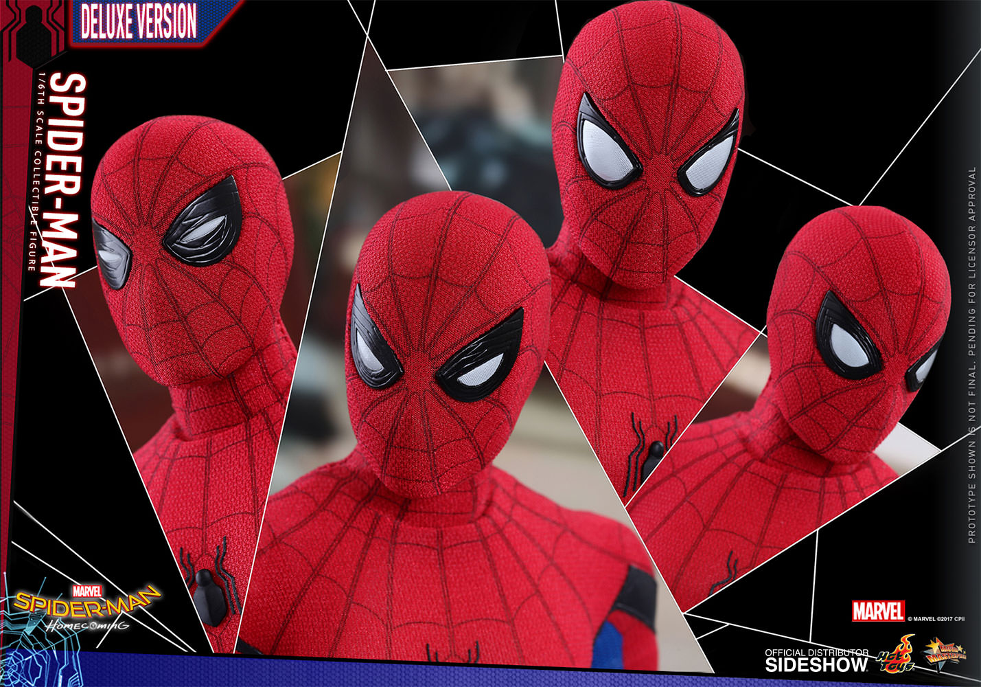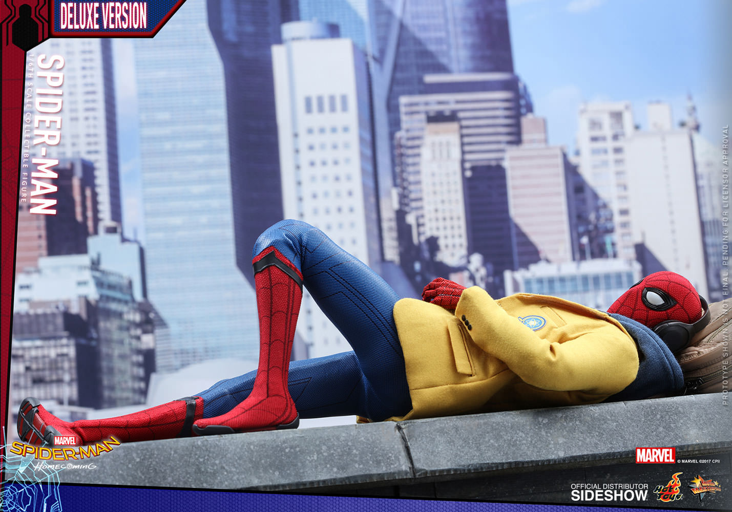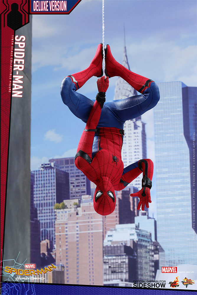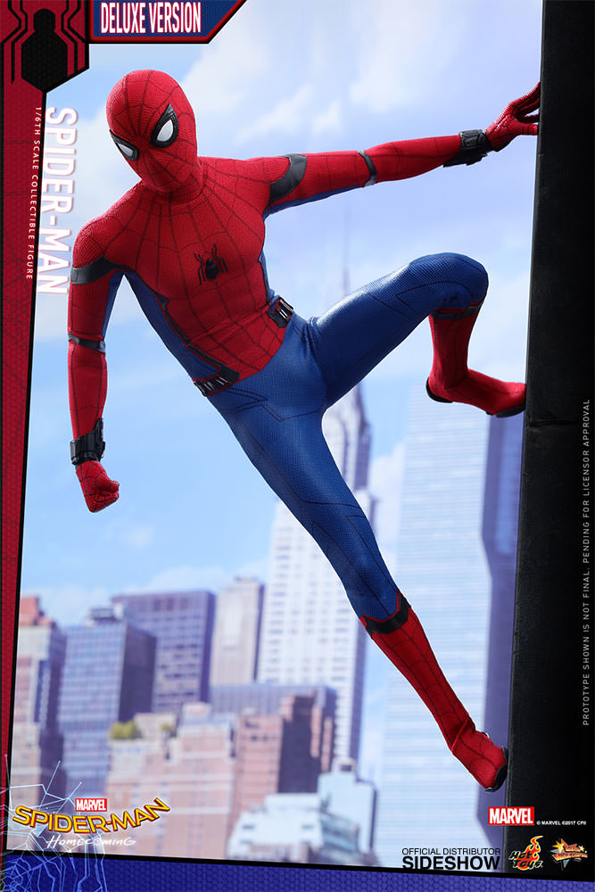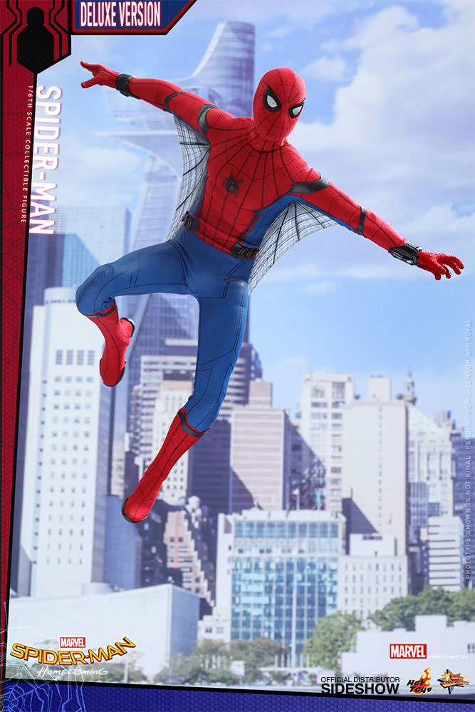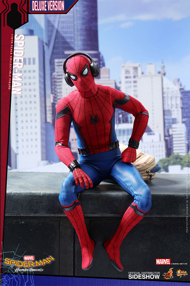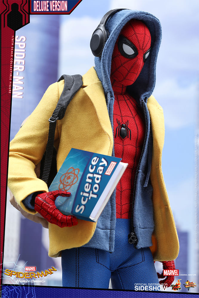ABOUT THIS SIXTH SCALE FIGUREThis is my chance to prove myself.After the events of Captain America: Civil War, the young Spider-Man, Peter Parker, is trying to strike a balance between his normal routine life as a high school student and the crime-fighting superhero life under Tony Stark’s mentorship.Sideshow and Hot Toys are ecstatic to reveal the highly anticipated brand new sixth scale Spider-Man Collectible Figure (Deluxe Version).Based on the new battling suit given to Peter Parker by Tony Stark, the figure features a newly developed masked head sculpt with four pairs of interchangeable eye pieces to create numerous combinations of Spider-Man’s expressions. The figure also features a newly crafted interchangeable head sculpt featuring likeness of Tom Holland, a newly developed specialized body, an expertly tailored and greatly detailed costume, a pair of magnetically attachable web-wings, a variety of spider-web shooting effect parts, and a Spider-Man themed dynamic figure stand. This Deluxe version exclusively comes with an additional school blazer, a zip-up hoodie, plus a highly detailed Vulture’s helmet! The suit’s fine details have been remarkably transferred onto this Spider-Man collectible figure, make sure you have reserved a space in your display for this impressive masterpiece.LicenseMarvelTypeSixth Scale FigureManufacturerHot ToysArtistsYulli (Head Sculpt)Da-hye, Kim (3D Design)E-Lee (Paint)JC. Hong (Head Art Direction)WHAT'S IN THE BOX?The Spider-Man (Deluxe Version) Sixth Scale Collectible Figure specially features:An authentic and detailed likeness of Spider-Man in Spider-Man: HomecomingA newly developed interchangeable head sculpt with authentic likeness of Tom Holland as Peter ParkerFour (4) pairs of interchangeable Spider-Man eye pieces that can create numerous combinations of expressionsA newly developed body with 30 points of articulationApproximately 28.5 cm tallTen (10) pieces of interchangeable hands with black cobweb pattern including: • One (1) pair of fists • One (1) pair of relaxed hands • One (1) pair of palms for cobweb shooting • One (1) pair of palms for cobweb swinging • One (1) pair of open handsEach head sculpt is specially hand-paintedCostume:One (1) newly developed red and blue colored Spider-Man suit embossed with grayish black trims, cobweb pattern and black spider emblem on chestOne (1) pair of red-color boots embossed with grayish black cobweb patternOne (1) pair of magnetic web-wingsOne (1) blue zip-up hoodie***One (1) yellow blazer with badge***Accessories:One (1) Spider-Man mask (not wearable on figure)One (1) Vulture’s helmet (not wearable on figure)***One (1) open spider web effect accessoryFive (5) strings of spider web in different shapes and lengths, attachable to the web-shootersOne (1) beige backpackOne (1) pair of headphonesOne (1) Science textbookTwo (2) piece of Spider Signal stickersDynamic figure stand with Spider-Man nameplate and the movie logo *** Exclusive to Deluxe VersionADDITIONAL DETAILS & DIMENSIONSExpected to ShipJul 2018 - Sep 2018Item shown is a prototype. When shipped, the final production piece may differ in appearance.Product Size11.22 H (284.99mm)*Dimensional WeightTBDInt'l Dim. WeightTBD* Size and weight are approximate values.SKU903064UPC4897011183466© MARVEL © 2017 CPII. All Rights Reserved.© 2017 Hot Toys Limited. All Rights Reserved.
