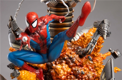 A Complex and detailed Polystone Statue featuring a destroyed street base scene with the Villainous Spider-Bot and Iconic Spider-Man featuring his wrap around web design.