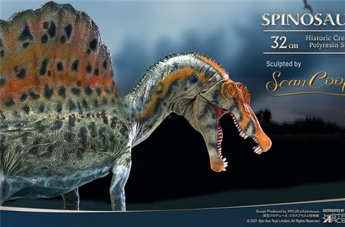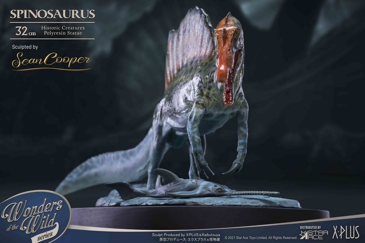 Product SpecificationsProduct No. SA5011 / SA5012 / SA5013 Spinosaurus 1.0 (Ocean Edition and Spinosaurus Fossil)(Spinosaurus 1.0 & Fossil Replica)Product Name Spinosaurus 1.0 (Ocean Edition) Spinosaurus 1.0Scale 32cm StatueSeries Wonders of the Wild Series32cm Wonder Wild Series Statue Spinosaurus 1.0 Statue includes:Spinosaurus 1.0 & Fossil ReplicaStar Ace’s “Wonders of the Wild” series brings collectors the Spinosaurus, the largest carnivore of the early Jurassic period. It was similar to the Tyrannosaurus Rex except for a longer snout and large spine protrusions, indicating that it would have had a large sail-like feature on its back. This version is based on recent discoveries that the Spinosaurus had shorter front arms than previously thought. This dinosaur may have been as long as 15 meters and weigh over 13 tonnes. There is evidence that it hunted in the water and may have been an accomplished swimmer. Famed dinosaur sculptor Sean Cooper has re-created this amazing ancient creature based on the fossil evidence. This unique paint job depicts the creature hunting partially submerged in a lake or river. The polyresin base is the lakebed with a saw-nosed fish swimming along the bottom. This polyresin statue has been hand painted by the artisans at Kaibutsuya and is 32 cm long. It is mounted to an environment base with a name plate identifying the scientific name and habitat.The Deluxe set includes a sculpted replica of the fossil as it was found by paleontologists. The fossil replica is also available separately.SA5011 Spinosaurus 1.0 Statue棘龙 (普通版)SA5012 Spinosaurus + Fossil Replica (Deluxe version)棘龙 (豪华版)SA5013 Spinosaurus Fossil Replica32cm Long Historic Creatures Polyresin statue32cm Long Prehistoric Animal Resin StatueSculptor : Sean Cooper Sculptor :Sean CooperPainter : Kaibutsuya Monster House & Yoshio MasatakaColorist : Kaibutsuya Monster House & Yoshio MasatakaProduct Code/ Product No. : SA5011 Spinosaurus 1.0 StatueSA5012 Spinosaurus 1.0 Statue + Fossil Replica (Deluxe version)SA5013 Spinosaurus Fossil Replica ProductMaterial:Resin Statue (NON-SCALE) 32 CM LengthFossil Replica : Wall Hanging or Table Top displayProduct Size / Product SizeDragon Statue: Approximate: L 320mm W 130mm H 250mmFossil: Approximate: L 310mm W 190mm D 30mmProduct Weight :Statue : Approximately : 3.0 Kgs (including Diorama & Package)Dimension (Shipping Box) :Approximately 350H x 260W x 250D mm(Dimension and weight could change later.) Per Box: 4Pcs / carton : 2 set (inner) / 4 sets (outer)Packing : Closed BoxDate of sale: Q4 2022EAN Code : SA5011 4 89705 788511 9SA5012 4 89705 788512 6SA5013 4 89705 788513 3(C) 2022 Star Ace Toys Limited. All Rights Reserved.