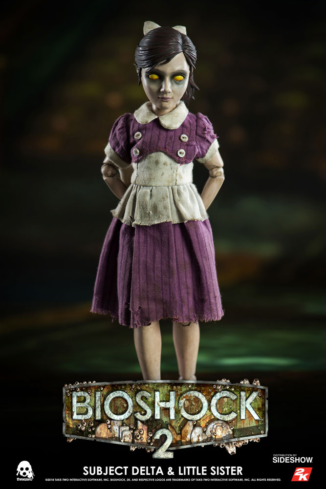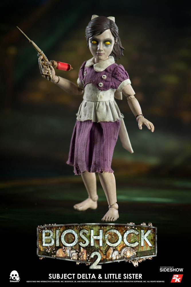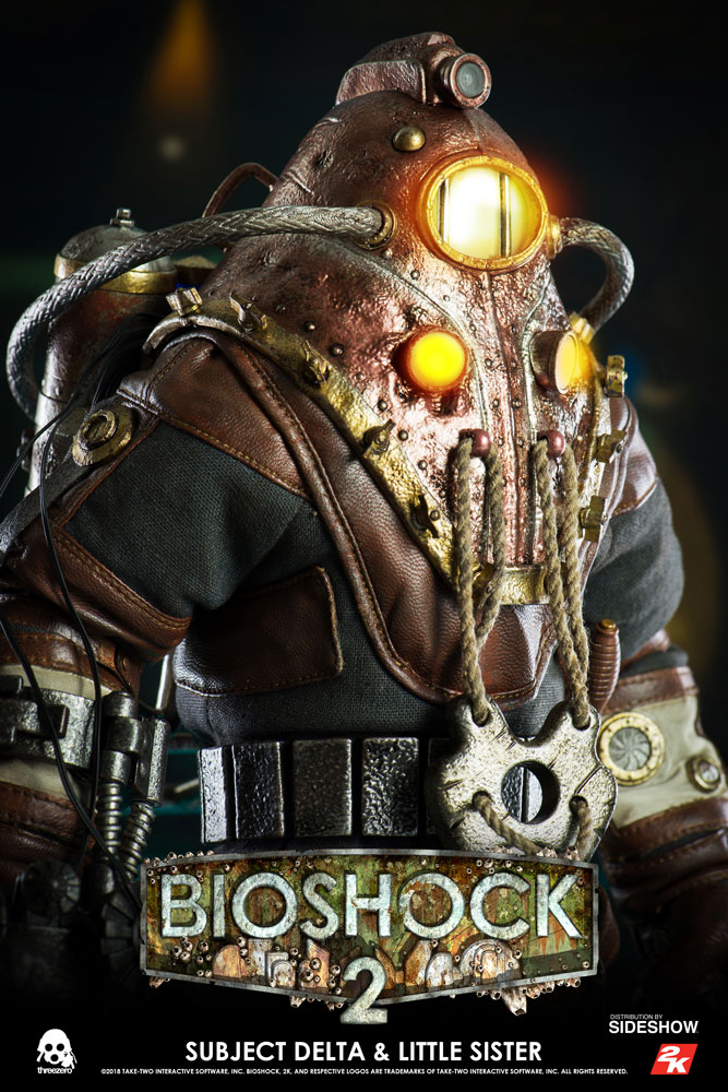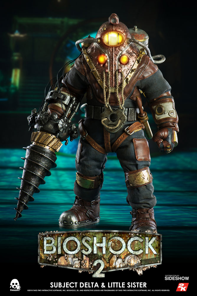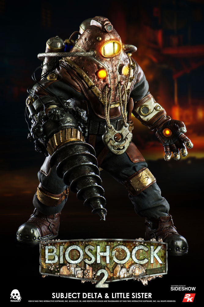 ABOUT THIS SIXTH SCALE FIGURESideshow and Threezero are excited to announce the sixth scale Subject Delta and Little Sister from BIOSHOCK 2. The Subject Delta collectible figure is fully poseable with over 35 points of articulation and features highly detailed incredible paint application to highlight all the weathering effects based on its appearance in the game. The right drill is detachable and there is a light-up feature for the head lights. The Little Sister features tailored fabric clothing, a detailed paint application, and weathering. Bioshock fans, don't miss your chance to add these highly detailed figures to your collection!LicenseBIOSHOCKTypeSixth Scale FigureManufacturerThreezeroWHAT'S IN THE BOX?The Subject Delta Sixth Scale Figure features:Collectible stands approximately 33cm / 13 inches tallFully poseable figure features over 35 points of articulationHighly detailed with incredible paint application to highlight all the details with weathering effect based on the appearance in the video gameArms and legs covered with fabric materialDetachable right DrillExchangeable hands: - One (1) pair of fists- One (1) pair of relaxed hands- One (1) left relaxed hand (with glowing light function)Light-up feature for 4 head lights(3 x AG13 Button Cell Batteries needed. Batteries not included)The Little Sister Sixth Scale Figure features:Fully-articulated 15cm / 6 inch tall Little Sister figureFigure comes with tailored fabric clothingDetailed paint application and weathering on the figureADAM Harvesting ToolExchangeable hands: - One (1) pair of relaxed hands - One (1) pair of gripping handsADDITIONAL DETAILS & DIMENSIONSExpected to ShipDec 2018 - Feb 2019Item shown is a prototype. When shipped, the final production piece may differ in appearance.Product Size13 H (330.2mm)Little Sister:6 H (152.4mm)*Dimensional WeightTBDInt'l Dim. WeightTBD* Size and weight are approximate values.SKU903370UPC4897056201323