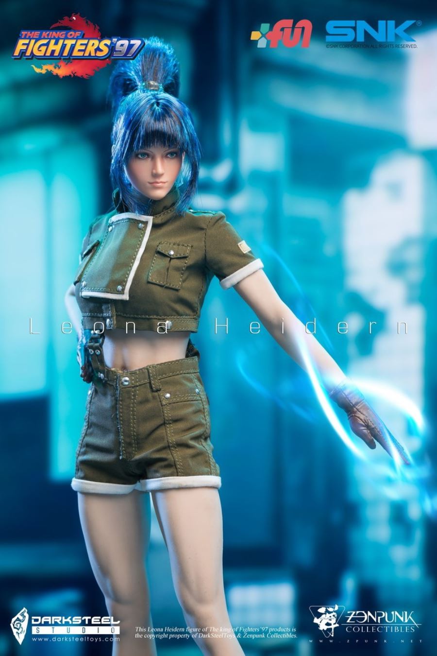 Brand Name : DarkSteel Toys×ZenPunkItem Name:THE KING OF FIGHTERS ‘97 - Leona Collectible Action FigureScale : 1/6 - 2 x head sculpt- 4 pairs x interchangeable hands- 1 x TBLeague 1/6 female seamless body with metal skeleton- 1 Set x Uniform - 1 Pair x Boots- 1 pair x earrings- 1 x display stand
