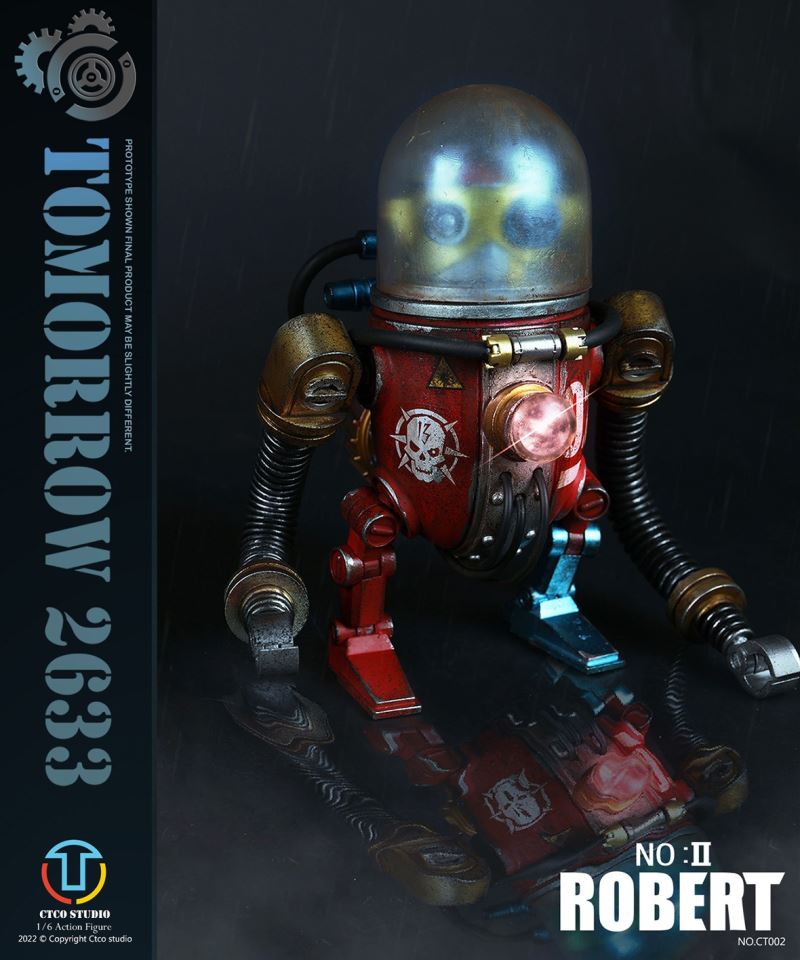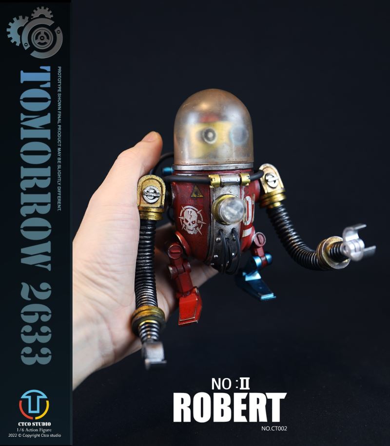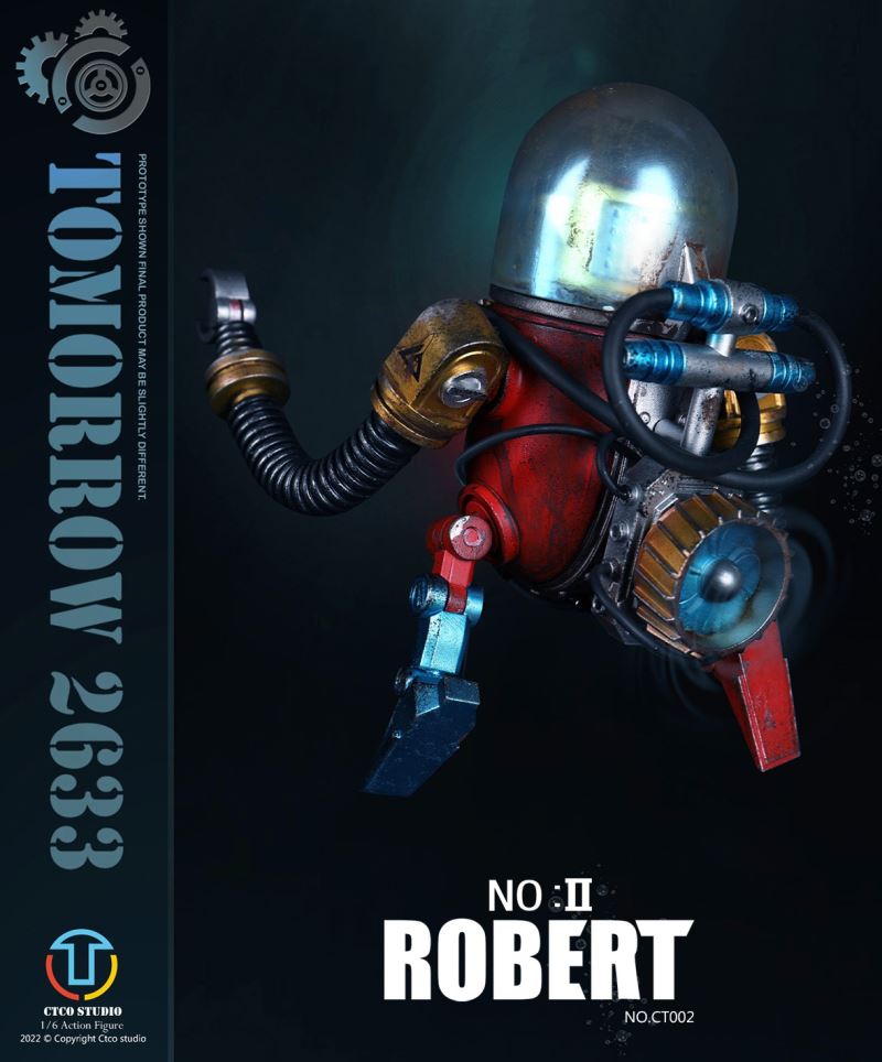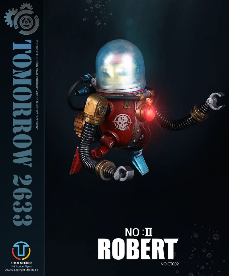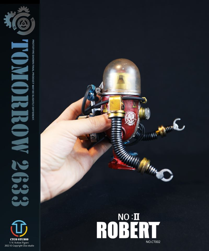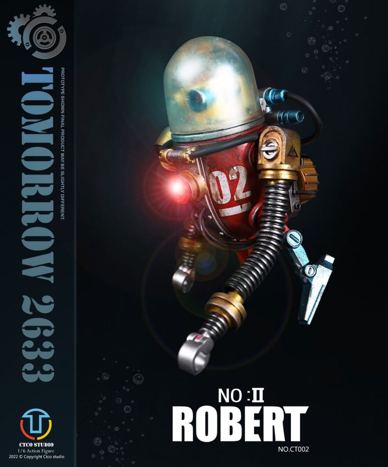 CTCO STUDIO 1/6 CT002 TOMORROW 2633 - NO.II ROBERT (METAL COMMEMORATIVE EDITION)* 70% of accessory parts are made of diecast alloy, while the other 30% are made of plasticChest lamp, head lamp can be litThe 1/6th scale No.2 Robert collectible figure specially features:- One (1) brain of Robert- One (1) gold robot head- One (1) transparent diving helmet- One (1) red robot body- One (1) propeller- One (1) pair of coil armers- Two (2) robot legs (each is red and blue)- One (1) remote control