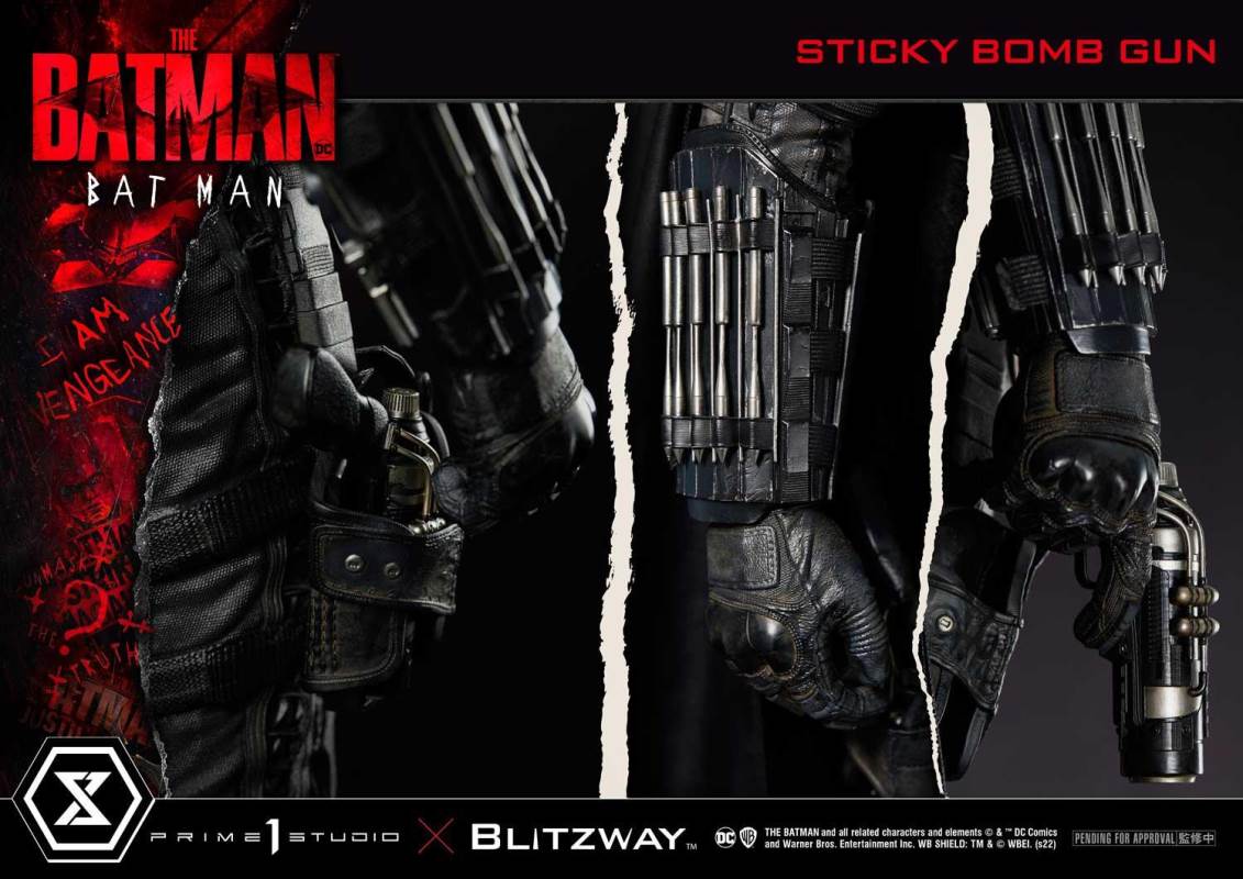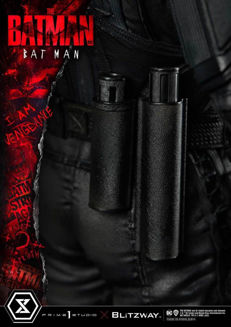 วิสัยทัศน์ของ Vengeance สูง 31 นิ้วนี้มีรายละเอียดที่ซับซ้อนและสีที่สมบูรณ์แบบของภาพในภาพยนตร์! ฝีมือของฝาครอบทำให้นึกถึงว่าบรูซ เวย์นสร้างชุดสูทด้วยมือของเขาอย่างไร ศิลปินของ Blitzway ได้ถ่ายทอดความรู้สึกสมจริงในทุกแง่มุมของเครื่องแต่งกาย เกราะที่ชุบบนตัวของแบทแมนนั้นมีพื้นผิวเป็นผ้าขีปนาวุธ ยืดเหนือการชุบเกราะแข็ง และนั่นคือสิ่งที่ปรากฏบนรูปปั้นนี้
