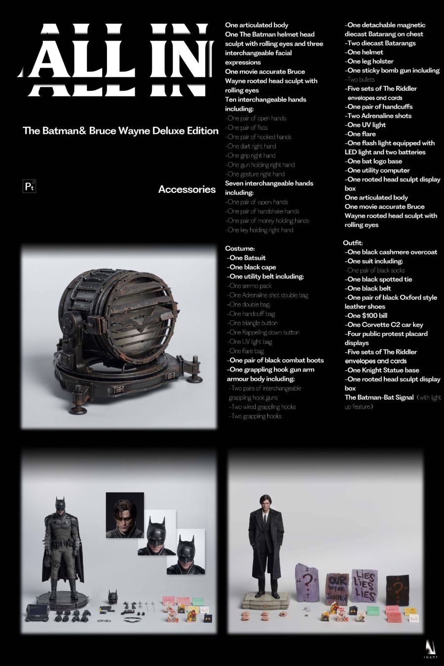 We are proud to introduce our latest collectible figure by our INART Team. The Batman 1/6 collectible figure.To give colletcors more options, there are a total of 5 editions: 1. The Batman Standard Edition2. The Batman Premium Edition3. Bruce Wayne Standard Edition4. Bruce Wayne Premium Edition5. The Batman & Bruce Wayne Deluxe Edition*Differences between each edition will be illustrated in the final promotional images.In addition to above Five Editions, our INART team have created The Batman's Bat-Signal, which can be purchased separately.
