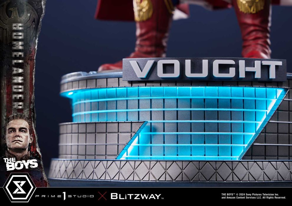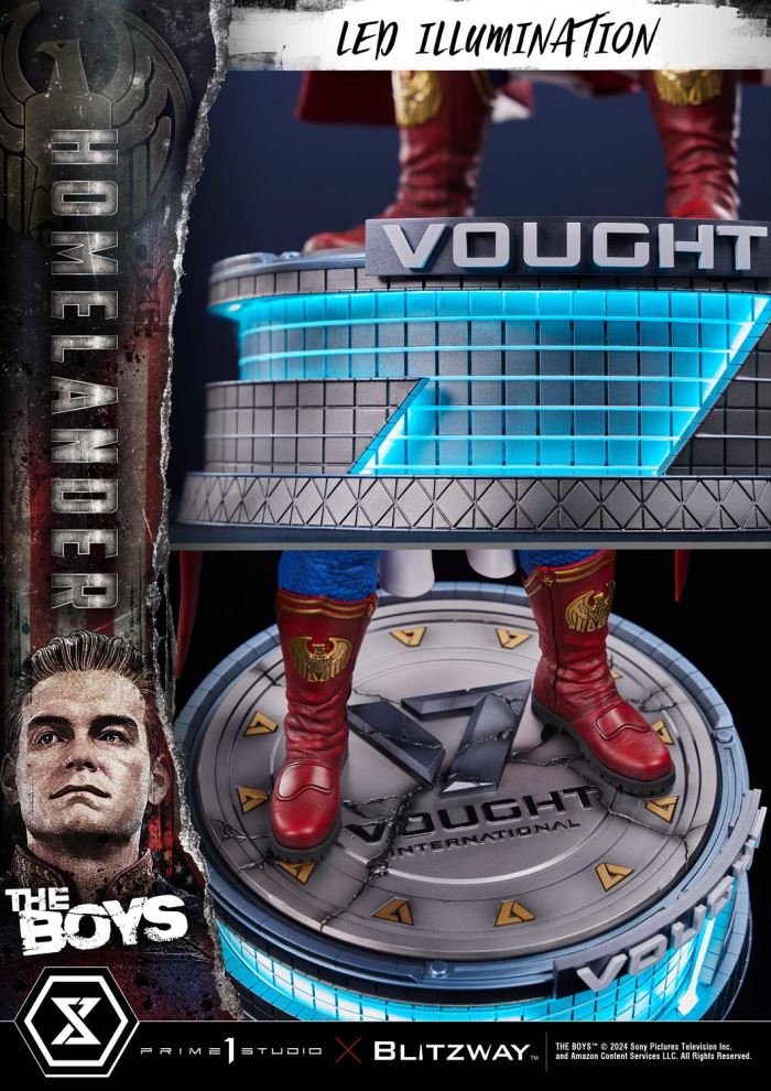 There is no God. I’m the only man in the sky.Bringing the light and darkness of a superhero to life in 1/4 scale.From Amazon Original's The Boys, a tale of corrupt superheroes and rebels who stand by their own sense of justice, comes Homelander in the Premium Masterline series!In collaboration with Blitzway, we’ve captured Homelander's complex appeal in 1/4 scale. The chosen pose shows him standing in a way that portrays a perfect hero, yet with an unsettling air. His physique, with beautifully sculpted muscles, is so real it exudes a hidden madness.With his clean-cut short hair, arrogant and lonely gaze, and crooked smile that hides his true intentions, Homelander’s head is crafted with precision using resin, a material perfect for detailed work. From the chiseled jawline to the texture of his skin, every contour and detail is carefully crafted to bring out the realism.His charismatic costume has been faithfully recreated with high precision. The fabric cape brings out the texture from the show, and the eagle motifs and intricate patterns on the suit are reproduced exactly as seen on screen. The base at his feet is designed with Vought International in mind, with the cold blue LED lighting seemingly representing his conflicting dependence on and rebellion against the corporation.Merging sculpting, painting, and unique features, this statue brings to life the light and darkness of a superhero. Don’t miss out on Butcher, his arch-nemesis, now available for pre-order. Immerse yourself in the extreme world of The Boys, and make it part of your collection! Specifications: Highly detailed likeness sculpture of Antony StarrReal fabric capeThe Boys Themed Base with LED IlluminationLED Power Supply Method: TBD* Please prepare batteries, USB cables, or other necessary items depending on the final power supply method. Notice: Prototype samples shown.Product details could be subject to change without further notice.Please note the final product specifications may differ because each product is Handmade.Since the product is still in the development stage, the Size (up to 10%) & Weight (up to 10kg) may be changed during the production stage. THE BOYS™ © 2024 Sony Pictures Television Inc. and Amazon Content Services LLC. All Rights Reserved. DETAILSBrandsPRIME 1 STATUECollectionPremium MasterlineSeriesThe BoysScale1/4 ScaleProduct CodePMTB-02Product Size Approx.H:56.6cm W:26.3cm D:26.3cmCarton(Est):1 boxProduct Weight Approx.9 kgMaterialsPolystone and other materialsJAN4582647120373