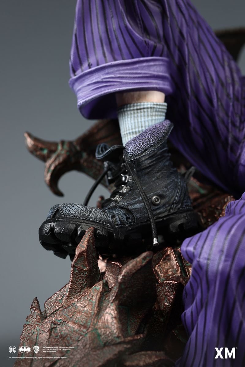 Presenting the next release from XM’s Batman: White Knight Comics 1/4 scale premium collectibles line, White Knight: The Joker. Each painstakingly handcrafted statue is individually hand-painted with XM’s famous quality finish, and comes in a bold, dynamic, and story-laden style. For this statue, we worked directly with Batman: White Knight comics’ original writer and artist, Sean Murphy to capture details reflective of his art style in the comics that fans of the series would appreciate. The XM Team wanted to retain the Joker's persona and characteristics in this particular scene which shows him seated on the roof, in a relaxed pose, feeling happy after another successful robbery— an interpretation of Sean Murphy’s iconic comic cover in Batman: Curse Of The White Knight #8. This is a piece that pairs perfectly well with XM’s Batman: White Knight (Batcycle Edition) statue, with Art Deco style architecture making up the base of the statue. The Joker is himself seen sitting atop a weathered copper gargoyle covered in green patina, wearing a pair of leather boots. He is seen sporting a new set clothes, wearing purple pin-stripe pant legs with realistic fabric-like folds and suspenders while draped in a tattered light blue t-shirt with the batman logo centered across his chest. The statue comes with 2 arm switch outs, one featuring a deck of cards on his left hand and another holding on to a revolver with a long barrel. It also comes with 2 head switch outs, each featuring Joker’s differently colored eyes. The first head switch out has him with an over the shoulder pose and bunched up eyebrows, taken directly from Sean Murphy’s comic cover. The other head switch out has him looking straight ahead with a maniacal facial expression and a large toothy grin. Character Background“After years of epic battles, the Dark Knight finally finds a way to cure the twisted mind of his archenemy…” Read more at https://www.dccomics.com/graphic-novels/batman-white-knight-2017/batman-white-knight #DC This statue features:Two (2) left hands: 1 featuring a deck of cards on his left hand and 1 holding on to a revolver with a long barrelTwo (2) heads: 1 with an over the shoulder pose, 1 looking straight aheadOne (1) highly detailed sculpt: 1 featuring The Joker sitting on a gargoyleCrafted in PolystoneEach painstakingly handcrafted statue is individually hand-painted with the highest possible quality finish Artists:Sean Murphy (2D)James W Cain (3D)XM Studios Design and Development Team Manufactured by:XM Studios Note: Prototype shown and pending final approval, final product may differ. Batteries will not be included for products with light up features due to customs. Product and Box DimensionsEstimated Product Size (LxBxHt): 28*31*45cm Estimated Product Weight : 9kgEstimated Box Size (LxBxHt): 40*70*34cmEstimated Shipping Weight : 12kg