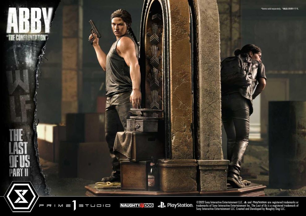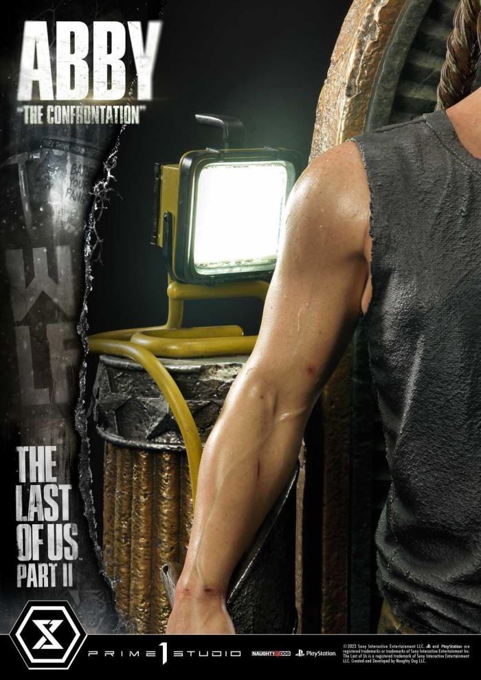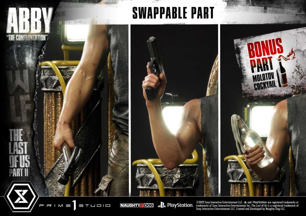 Descriptions“You killed my friends... We let you both live, and you wasted it!”Prime 1 Studio is proud to present you the much-awaited next entry to our Ultimate Premium Masterline, from the critically acclaimed post-apocalyptic action-survival game The Last of Us Part II, here is the 1:4 Scale UPMTLOU-01: Abby “The Confrontation”.Few games get under your skin and leave you thinking about them long after you’ve put down the controller. The Last of Us Part II is one such game. Critically acclaimed for its gameplay, characterizations, performances, and visual fidelity, The Last of Us Part II combines a memorable survival horror narrative with pulse-pounding action.The thrilling post-apocalyptic sequel picks up years after the first game and brings a different kind of gameplay, featuring two protagonists in a life-and-death struggle, not only against the cannibalistic infected and antagonistic human enemies but ultimately with each other.Ellie returns from the first chapter out for revenge against the Seraphites and on a more than capable, Abby Anderson. Abby, a skilled survivor, and strong soldier seem to be an antagonist to Ellie at first, however as the game progresses, we come to learn that Abby has her own back story and motivations, she becomes a much more complex and sympathetic character. Her story intertwines with Ellie’s; both characters are driven by a desire for revenge and redemption.The amazing artists at Prime 1 Studio bring you this stunning set of statues, focused on recreating the tense action and thrilling suspense from this memorable survival narrative. They have done their best to make this statue unbelievably lifelike by studying the game assets. They did their most impeccable work to be able to bring out the best interpretation of this steely, determined protagonist. The fine detail of her hair… the cautious but aggressive expression on her face… the scarred quality of her skin… the tense ligaments of her arms. All painted to simulate real skin, and real-world clothing and materials.Just shy of 23 inches tall, Abby is more than ready to bludgeon any incoming attacker armed with a hammer. You can also swap out her right arm for one that holds a handgun instead. Her intense gaze shows concentration, carefully on the lookout for any signs of movement from her opponent. Her muscular blood-pumped arms, trickled with sweat show years of dedication and training. She stands atop an arched pedestal, stepping on a yellow electrical wire that powers the LED-lit utility lamp behind her on a column.When you pre-order this Bonus Version from our official online store or any authorized distributor it comes with a third swappable right arm that will allow you to expand your storytelling even further, Abby holds a Molotov Cocktail, an iconic weapon of the series!The intensity of the scene can be brought to another level by pairing this statue’s other half, the upcoming UPMTLOU-02 Ellie “The Theater”.Whether or not you can get The Last of Us Part II out of your mind, you need to Pre-Order this amazing UPMTLOU-01S: Abby “The Confrontation” Bonus Version now and eternalize these memorable characters.Specifications:The Last of Us Part II-themed baseTwo (2) Swappable right arms (holding Handgun & Hammer)LED illumination on Powered Utility LampOne (1) Swappable Bonus right arm holding Molotov Cocktail [BONUS PART]