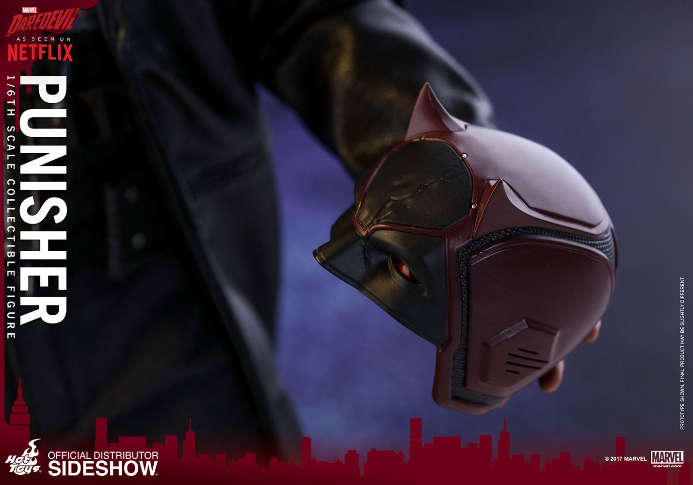 ABOUT THIS SIXTH SCALE FIGURE“You know you're one bad day away from being me.”In Marvel’s Daredevil, a Netflix Original Series, war hero Frank Castle’s life was changed forever when his family was brutally murdered before his eyes. Taking matters into his own hands, Frank decides to avenge his family’s death by eliminating all those responsible. Lethal with his methods, Frank becomes a notorious vigilante in the criminal underworld earning the moniker – The Punisher.Sideshow and Hot Toys are extremely excited to bring a new addition to the Hot Toys Marvel’s Daredevil collectible series and officially introduce the sixth scale Punisher collectible figure!The screen accurate collectible figure is specially crafted based on the appearance of the Punisher from this popular TV-MA rated hit show and features a newly developed head sculpt, expertly tailored outfit, a wide range of weapons including a mini-gun, sniper rifle, a pistol, and dagger, as well as a specially designed figure stand with backdrop. Furthermore, a damaged Daredevil helmet is included as a special accessory!Now is the time to add this amazing Punisher collectible figure to your collection!LicenseMarvelTypeSixth Scale FigureManufacturerHot ToysArtistsSo-young, Lee (Head Sculpt)Kojun (3D Desgin) Hyeon-jeong, Kim (3D Design)E-Lee (Head Paint)JC. Hong (Head Paint and Art Direction)WHAT'S IN THE BOX?The Punisher Sixth Scale Collectible Figure’s special features:A Newly developed head sculpt with detailed likeness of The Punisher in Marvel’s Daredevil season 2Highly detailed facial features, skin texture, stubble, and scarBody with over 30 points of articulationApproximately 30 cm tallTen (10) pieces of interchangeable hands including: - One (1) pair of fists - One (1) pair of open hands - Three (3) pair of hands for holding weaponsEach head sculpt is specially hand-paintedCostume: One (1) black colored leather-like coatOne (1) black colored teeOne (1) black colored bullet-proof vest with The Punisher’s skull motifOne (1) pair of black colored pantsOne (1) black colored beltOne (1) pair of black colored bootsWeapons:One (1) min-gunOne (1) sniper rifleOne (1) revolver pistolOne (1) dagger with sheathAccessories:One (1) damaged Daredevil helmet (not wearable on figure)Specially designed figure base with character nameplate and paper backdropADDITIONAL DETAILS & DIMENSIONSExpected to ShipJan 2018 - Mar 2018Item shown is a prototype. When shipped, the final production piece may differ in appearance.Product Size11.81 H (299.97mm)*Dimensional WeightTBDInt'l Dim. WeightTBD* Size and weight are approximate values.SKU903000UPC4897011182759PRICE$234.99© 2017 Marvel. © 2017 Hot Toys Limited. All Rights Reserved.
