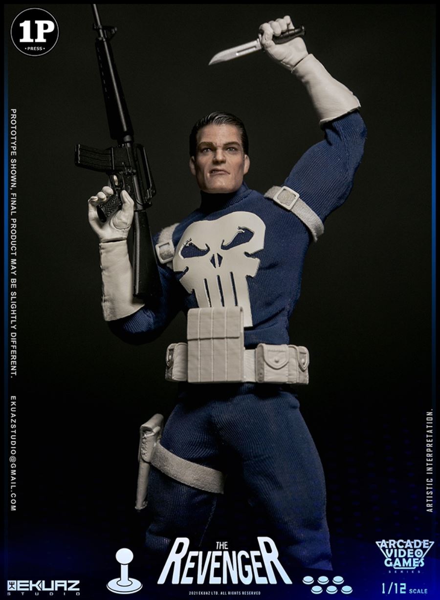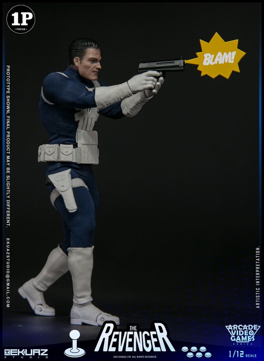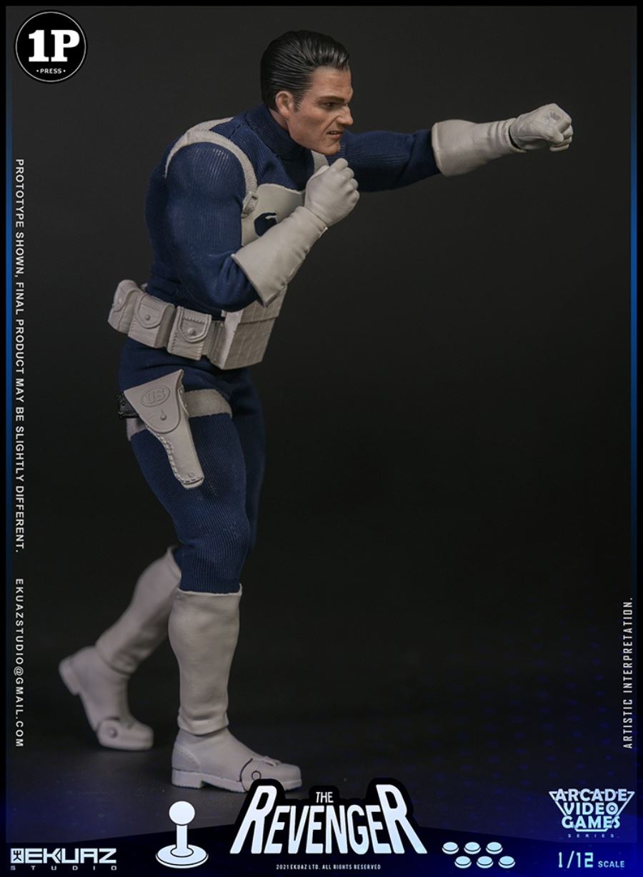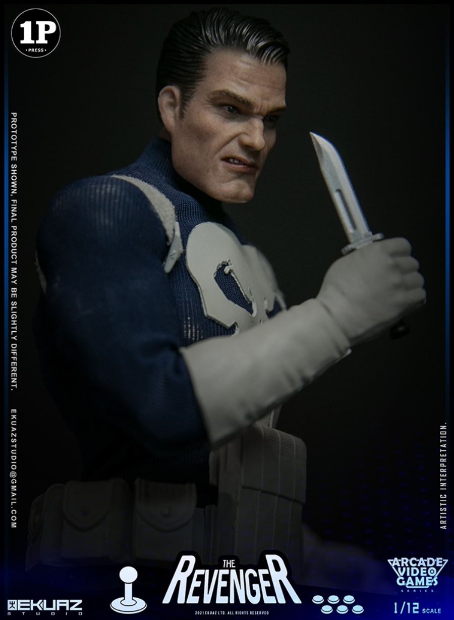 EKUAZ STUDIOEKS061/12 Scale THE REVENGER ARCADE VIDEO GAMES SERIESPARTS LIST:BODY:HEADSCULPTURE1/12 MUSCULAR ACTION BODYINTERCHANGEABLE HANDS X8EQUIPMENT:COATPANTSCOMBAT BELTDROP LEG HOLSTERSHOULDER STRAPA PAIR OF BRACERSBOOTSWEAPON:ASSAULT RIFLEMAGSUBMACHINE GUN X2PISTOL x2CARTOON STYLE FOR PISTOL x2GRENADE x3COMBAT KNIFEMACHETEOTHER:FIGURE STAND