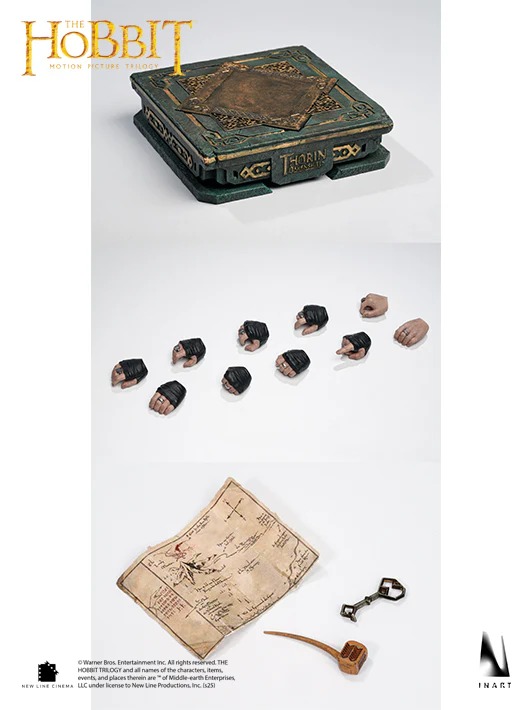 ABOUT THE FIGUREAs featured in The Hobbit: An Unexpected JourneyThorin Oakenshield, descendant of the Durin's Line, is a courageous and determined leader. He carries the weight of his people's suffering as he leads thirteen dwarves and risks everything to reclaim their lost homeland.Officially Licensed By Warner Bros.This Sixth-Scale Figure is officially licensed by Warner Bros, Discovery Global Consumer Products. The head sculpt has been crafted by INART‘s finest artists to capture Thorin's stern expression from his appearance in The Hobbit: An Unexpected Journey, featuring articulated eyes and two-toned rooted hair that recreates his iconic appearance. A brand new body mold has also been developed to accurately recreate Thorin's unique dwarf physique.PRODUCT INFORMATIONThe Hobbit: An Unexpected Journey - Thorin Oakenshield 1/6 Collectible FigureBrand: INARTLicensor: Warner Bros.Materials: Wool, Die-cast, PVC, ABS, Real fabric, etcProduct Size: 30cm (H) * 12.5cm (W) * 13cm (D) (Base included)11.81 in * 4.92 in * 5.12 in (Base included)MORE DETAILSFIGURE-Rooted Hair Head Sculpt with Articulated Eyes *1-Fully Articulated Body *1-Interchangeable Hands *10 Including:-Relaxed Hands *1 Pair-Left Clenched Fist *1-Knife-holding Right Hand*1-Sword-holding Hands *1 Pair-Pipe-holding Right Hand*1-Warning Gesture Right Hand*1-Ungloved Relaxed Hands *1 PairCLOTHING ACCESSORIES:-Genuine Leather Fur Coat *1-Great Wall Vest *1-Armor Robe *1-Inner Shirt*1-Pants*1-Belt*1-Bracers*2-Boots*1 PairACCESSORIES-Die-cast Battle Axe *1-Orcrist Sword *1-Orcrist Sword Scabbard *1-Elvish Sword*1-Elvish Sword Scabbard *1-Elvish Sword Shoulder Strap *1-Oak Shield*1-Key to the Side Door*1-Thrór’s Map*1-Pipe*1BASE-Base *1-Metal Support Stand *1