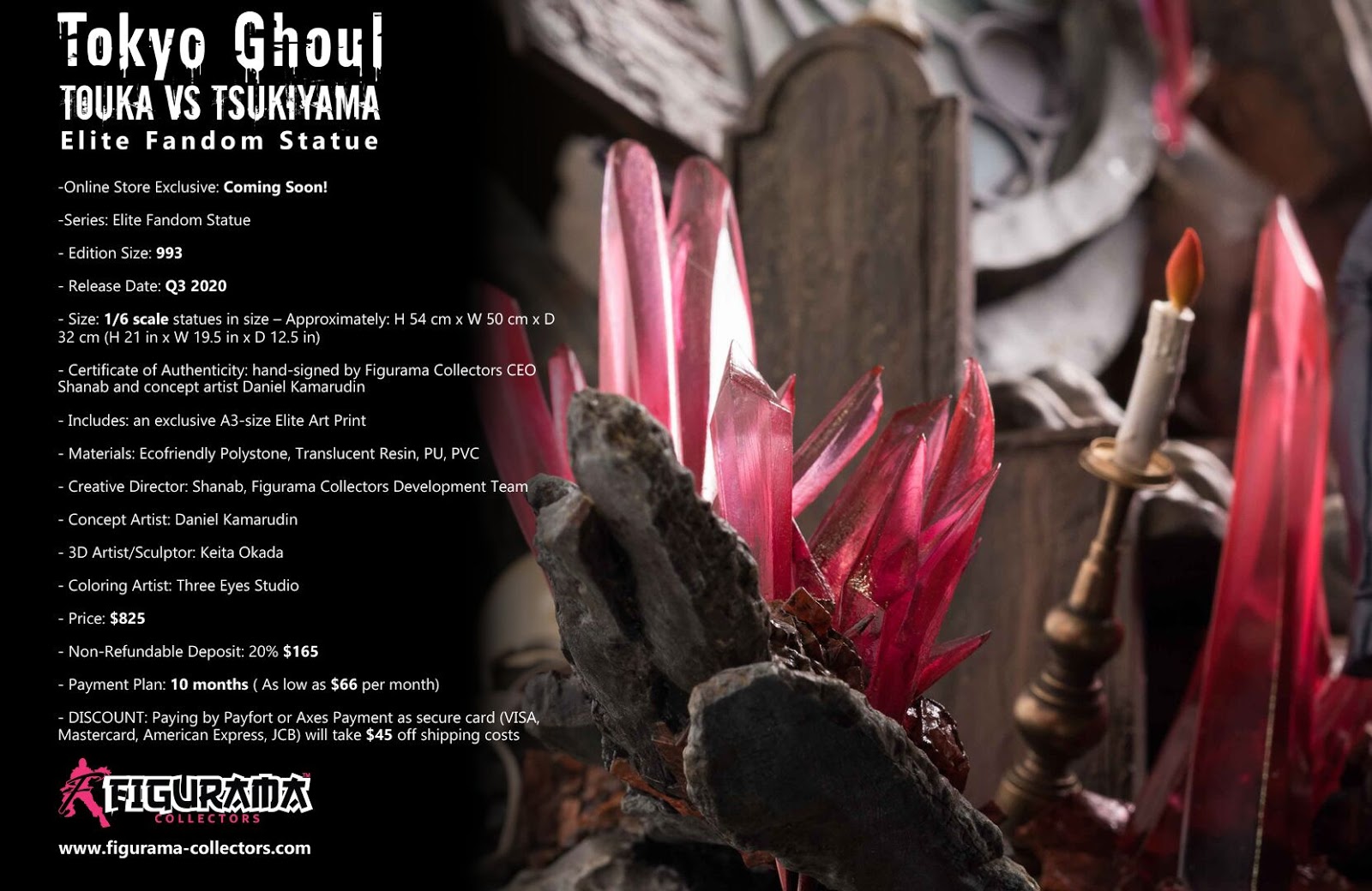 Tokyo Ghoul - Touka VS Tsukiyama Elite Fandom Statue 1/6 (Figurama Collectors)The Figurama Collectors company presents the impressive 1/6 scale statue dedicated to Touka Kirishima and Shuu Tsukiyama, characters from the well-known Tokyo Ghoul series, and which he offers us within his Elite Fandom Statue series. Statue available for reservation from November 9, 2019 and will be limited to 993 units worldwide.Measurements: 54 cm high x 50 cm wide x 32 cm deepMaterial: Ecofriendly Polystone / Translucent Resin / PU / PVCSale on sale: 3rd quarter of 2020Price: $ 825Reservations: November 9, 2019Below you can see all the images that Figurama Collectors has shared of his impressive Touka VS Tsukiyama Elite Fandom Statue:Figurama Collectors presents the 1/6 scale statue dedicated to Touka Kirishima and Shuu Tsukiyama, characters from the well-known Tokyo Ghoul series, and which he offers us within his Elite Fandom Statue series. An impressive statue that, as you can see, recreates the battle between Touka and Tsukiyama in the sacred solitude of a church.Look then at the very dynamic pose with which Touka and Tsukiyama have been represented in full battle, as Touka is pulled back to kick, and how perfectly recreated are his different outfits, his kagune and the great base on which They are already the one that does not lack even the smallest detail to get us fully into this great action scene. Look at the candles, the wax dripping from them, the broken glass, the eye patch that Kaneki lost during his fight with Tsukiyama, Touka's rabbit mask, Tsukiyama's crescent-shaped mask, crystal fragments Touka's kagune crossing the remains of the church and the crimson rose that adorns a base wrapped in the infamous letter that leads to this fateful encounter. From what you see that Figurama Collectors has taken care of even the smallest detail, both at the level of Touka and Tsukiyama and at the base, to get a new statue that every Tokyo Ghoul fan will be more than proud to add to his collection.Another highlight of the Touka VS Tsukiyama Elite Fandom Statue is that it will come with two alternative heads, two miniature stand busts and an exclusive Elite Art Print A3 size. That is, that the faces that you do not have placed in the statue can be placed in their own bust where they will also be great displayed in your collections. In addition, each statue will also come with a certificate of authenticity signed by hand by Shanab, the CEO of Figurama Collectors, and by conceptual artist Daniel Kamarudin. Remember that Figurama Collectors has limited this statue to 993 units (this number is 1,000 - 7, a significant equation in the Tokyo Ghoul universe).For those interested in getting this statue, remember that Figurama Collectors will open its reservations from November 9, 2019. Inform you that those who reserve it through the website of Figurama Collectors, the company indicates that it will include a bonus that You still have to announce (we will update this post as soon as they indicate what it is).