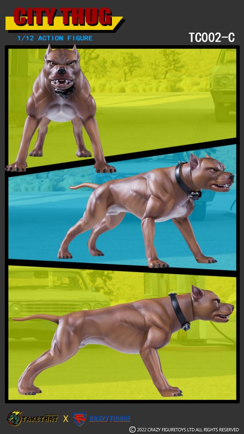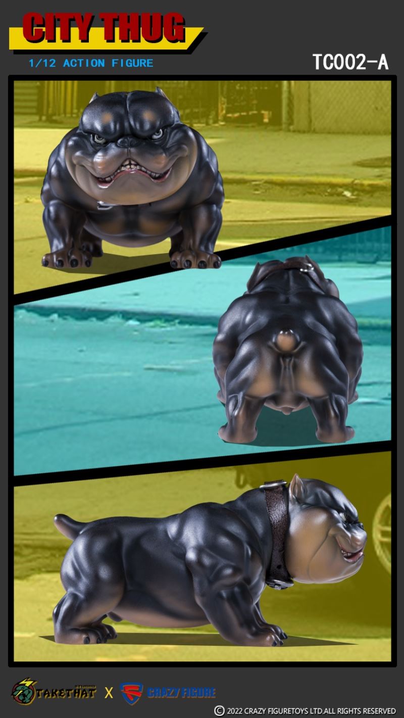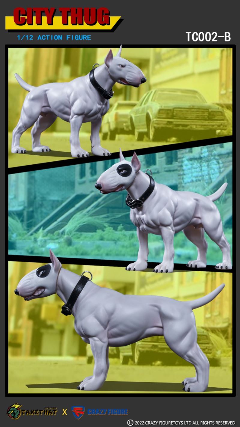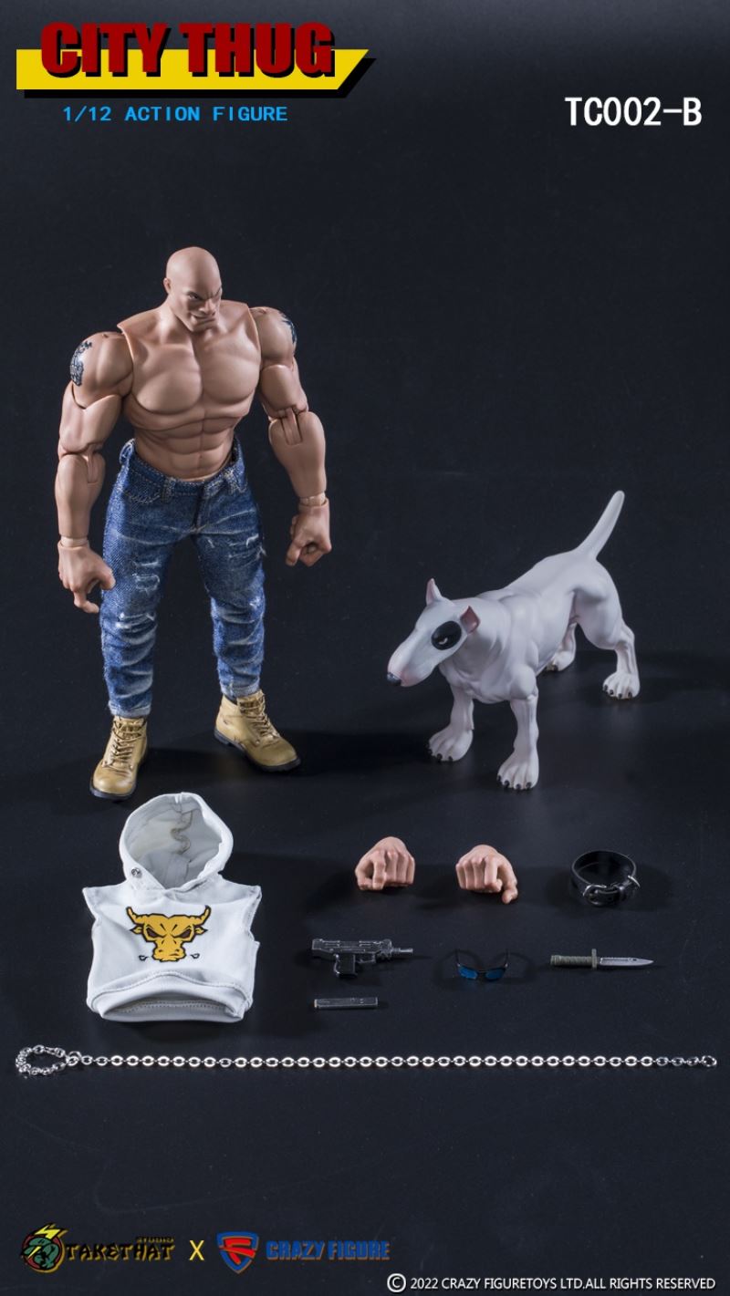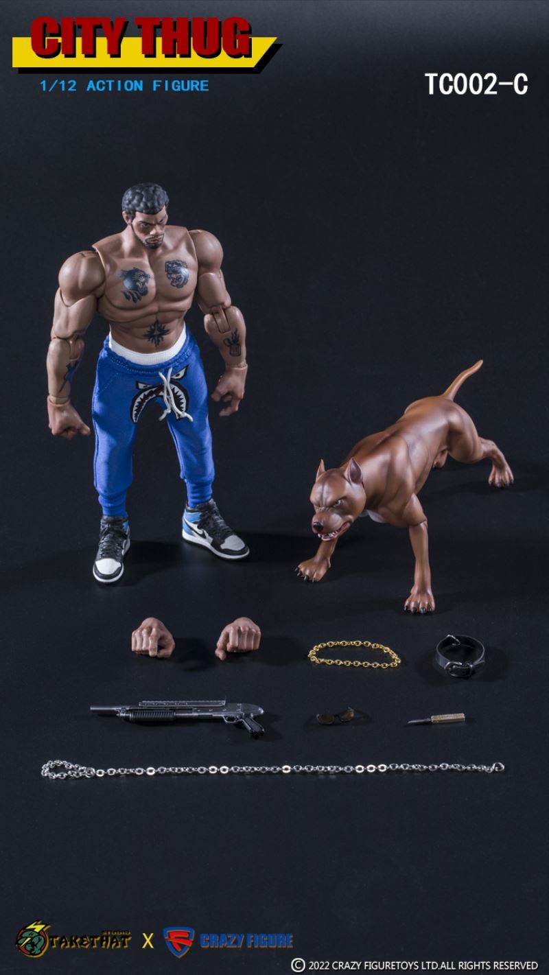 TAKETHAT X CRAZY FIGURE 1/12 ACTION FIGURE TC002 A(WHITE) B(YELLOW) C(BLACK)BRAND:TAKETHAT X CRAZY FIGURERETAIL PRICE: 458CNYMATERIAL: POM, ABS, PVC,CLOTHTC002 A(WHITE)------------------White voids X1Head carving x1The shape of the hand x4Bully dogAccessories:'t a mp5 submachine gundaggersunglassesBoots x2Cloth:vestThe trousersDog collarThe necklaceThe dog chainTC002 B(YELLOW)------------------Yellow voxel X1Head carving x1The shape of the hand x4Bull terrierAccessories:Wuzi submachine gundaggersunglassesBoots x2Cloth:Cap unlined upper garmentA pair of jeansDog collarThe necklaceThe dog chainTC002 C(BLACK)------------------Melanosome X1Head carving x1The shape of the hand x4Pit bullsAccessories:shotgunsdaggersunglassesShoes x2Cloth:underwearThe trousersDog collarThe necklaceThe dog chain