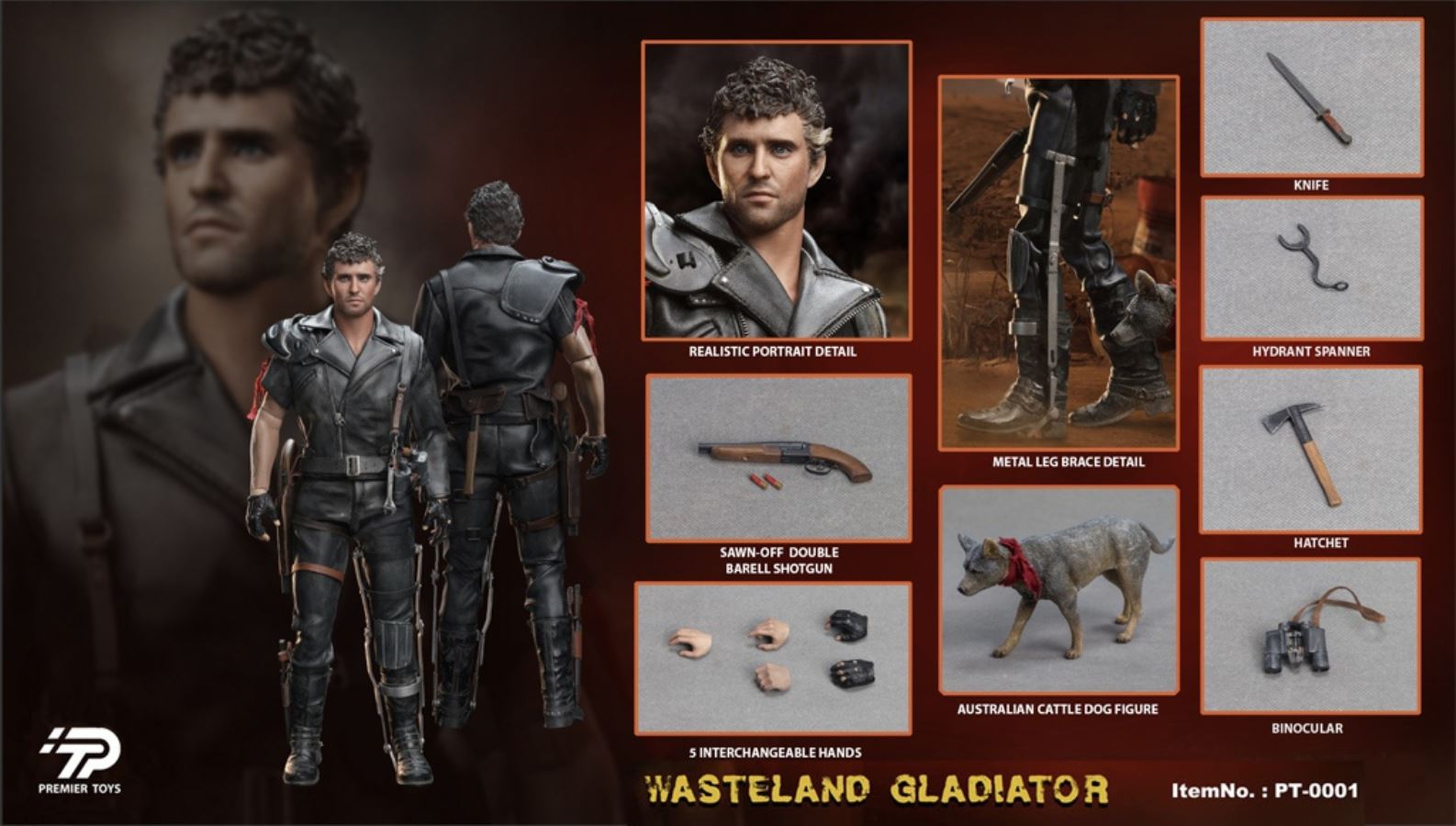 The 1/6th scale Wasteland Gladiator Collectible Figure features:- Highly realistic detailed head sculpt- Dark brown colored short hair sculpture- Head sculpt is specially hand-painted- 1/6 scale body with 30 points of articulation- Approximately 30 cm tall- 5 (5) pieces of interchangeable hands (left and right with glove) including:- One (1) pair of open hands with glove- One (1) right gun holding hand- One (1) right open hand- One (1) left knife holding handCostume:- One (1) black-colored jacket with pauldron- One (1) black undershirt- One (1) pair of black colored pants with knee pad- One (1) belt with shoulder strap- One (1) pair of black colored boots with one metal leg braceWeapons:- One (1) sawn-off double barrel shotgun- Two (2) shotgun shells- One (1) boot knife with sheath strapAccessories:- One (1) Australian cattle dog- One (1) adjustable wrench- One (1) hydrant spanner- One (1) hatchet- One (1) pair of binoculars- Figure stand
