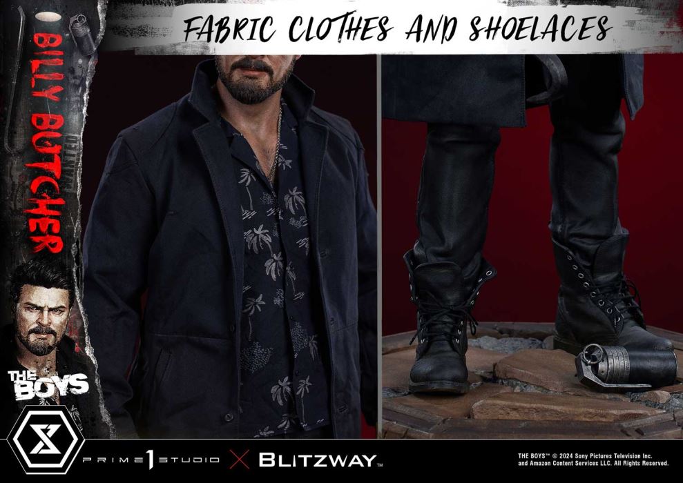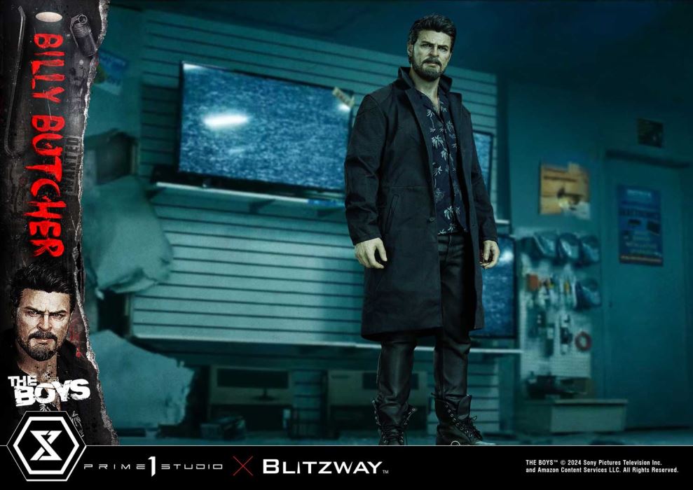 Never trust a Supe.The justice-driven rebel is meticulously crafted for the ultimate showdown.From Amazon Original's The Boys, where corrupt superheroes clash with a rebel determined to uphold his own brand of justice, we proudly bring William Billy Butcher to life in our Premium Masterline series!In collaboration with Blitzway, we've captured Butcher's gritty charisma in stunning 1/4 scale. He’s posed in a relaxed stance, embodying his powerful presence with a natural demeanor that radiates an intense aura.Every rugged detail of his face—from the chiseled jawline framed by a rich beard to the lines etched by countless battles—has been masterfully sculpted in resin. His sharp, unyielding gaze, shielded by sunglasses, perfectly mirrors Karl Urban’s unforgettable portrayal.We've paid special attention to the materials in his outfit. The coat, aloha shirt, and boot laces are crafted from real fabric, while the pendant on his chest is made of metal. His weathered pants and the detailed paintwork on his boots add a layer of on-screen realism. The LED-lit base featuring the title logo, Halothane Grenade makes this an exceptional display piece.Butcher, the ultimate Supe hunter, comes alive with intricate details, mixed materials, and dynamic features. And don’t miss out—his archenemy, Homelander, will be available for pre-order soon.Get ready to bring the fierce world of The Boys into your collection!Specifications:Highly detailed likeness sculpture of Karl UrbanSophisticatedly tailored and designed outfitsThe Boys Themed Base (with LED Illumination)One (1) SunglassesOne (1) NecklaceOne (1) Halothane grenadeNotice:Prototype samples shown.Product details could be subject to change without further notice.Please note the final product specifications may differ because each product is Handmade.Since the product is still in the development stage, the Size (up to 10%) & Weight (up to 10kg) may be changed during the production stage.THE BOYS™ © 2024 Sony Pictures Television Inc. and Amazon Content Services LLC. All Rights Reserved.DETAILSBrandsPRIME 1 STATUECollectionPremium MasterlineSeriesThe BoysScale1/4 ScaleProduct CodePMTB-01Product Size Approx.H:57.2cm W:26cm D:26cmCarton(Est):1 boxProduct Weight Approx.10 kgMaterialsPolystone and other materialsJAN4582647120342