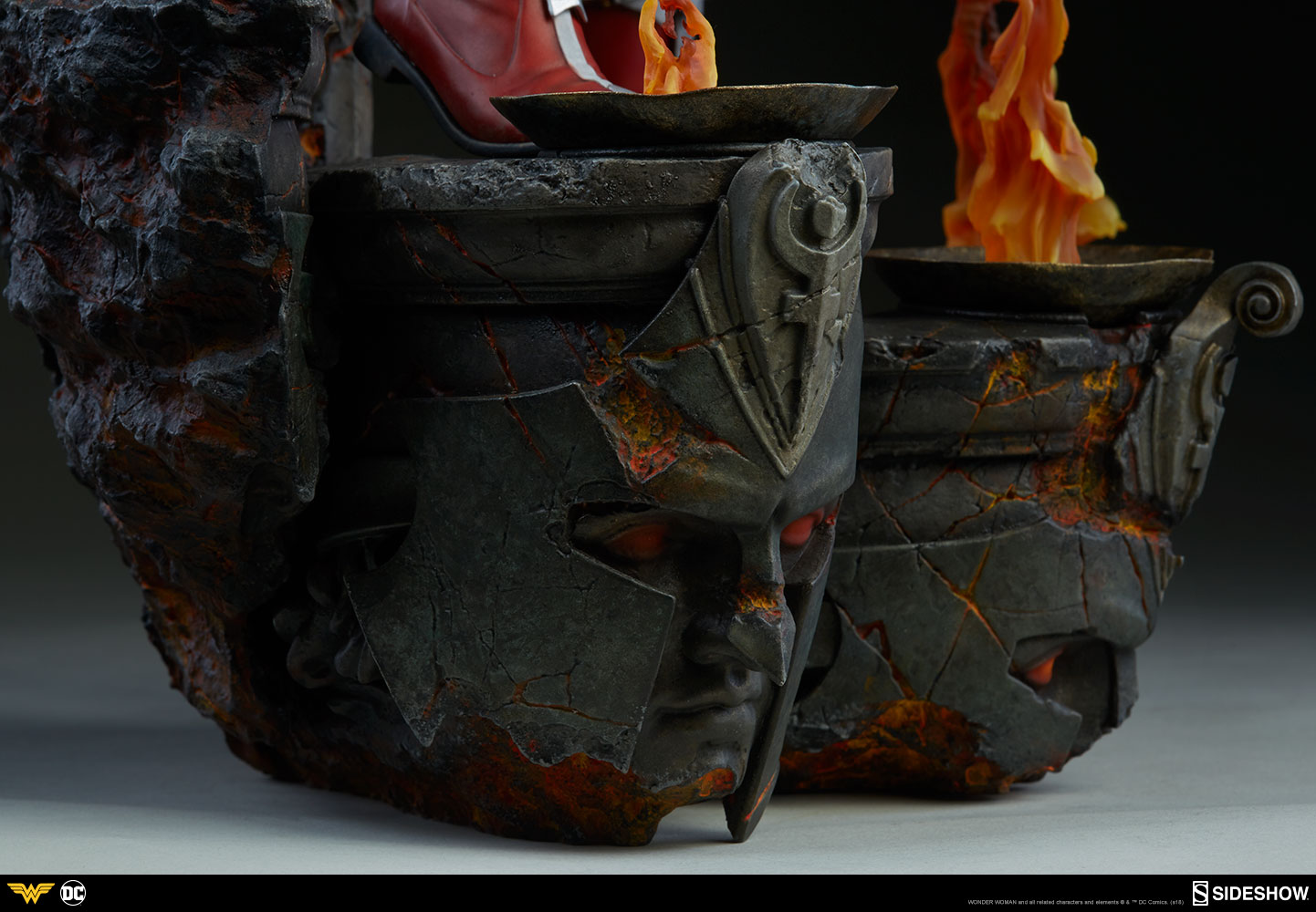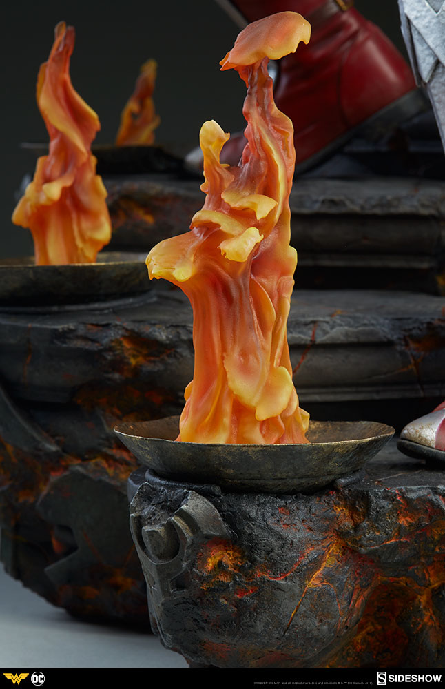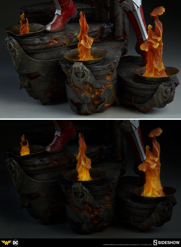 Wonder WomanPremium Format™ Figure by Sideshow Collectibles ABOUT THIS PREMIUM FORMAT™ FIGURE“You dare threaten a daughter of Themyscira?” By the goddess! Sideshow is proud to present the Wonder Woman Premium Format™ Figure. Measuring 22” tall, Wonder Woman stands on guard as she descends a blackened staircase to Hades, lined with clear resin flames that include a flickering light-up feature. The sculpted underworld staircase is detailed with molten orange hues, as well as the shadowy portraits of helmeted warriors, inspired by classical statues.A champion of justice, Wonder Woman prepares to swing her golden Lasso of Truth at any oncoming foes, with her sword and aegis shield at her back. Both the lasso and the leather-like strap across her chest are fabric features. Wonder Woman has a beautifully detailed portrait inspired by her comic book appearance, with dynamic, windswept hair, her golden tiara and matching golden necklace, and a strong-willed expression.Wonder Woman’s demigoddess physique is carefully sculpted showcasing her grace and strength in polystone. Her iconic red and blue costume is accented with white stars, and her armor includes a golden eagle breastplate, a matching gold belt, silver bracelets, and red boots with silver covers.The Exclusive edition of the Wonder Woman Premium Format™ Figure includes a removable polyvinyl skirt for Diana’s costume, allowing an additional display option for the figure.Shades of Hades! Add the power of the Amazon princess to your collection and order the Wonder Woman Premium Format™ Figure today!LicenseDC ComicsTypePremium Format™ FigureMaterialsPolystone, Resin, Metal, PVC, LeatherManufacturerSideshow CollectiblesArtistsIan MacDonald (Design)Alex Pascenko (Design)Zac Roane (Design)Will Harbottle (Sculpt)Aaron McNaught (Sculpt)Alfred Paredes (Sculpt)Mark Brokaw (Mold & Cast)Chadwick Andersen (Mold & Cast)Jeff Camp (Paint)Chie Izuma (Paint)Kat Sapene (Paint)Tim Hanson (Costume Fabrication)The Sideshow Design and Development TeamADDITIONAL DETAILS & DIMENSIONSExpected to ShipDec 2018 - Feb 2019Item shown is a prototype. When shipped, the final production piece may differ in appearance.Product Size22 H (558.8mm) x 12 W (304.8mm) x 10 L (254mm)*Product Weight14.00 lbs (6.35 kg)*Dimensional WeightTBDInt'l Dim. WeightTBD* Size and weight are approximate values.SKU3006641UPC747720236721WONDER WOMAN and all related characters and elements © & ™ DC Comics. (s18)
