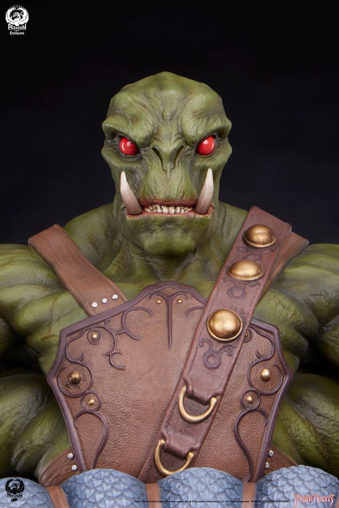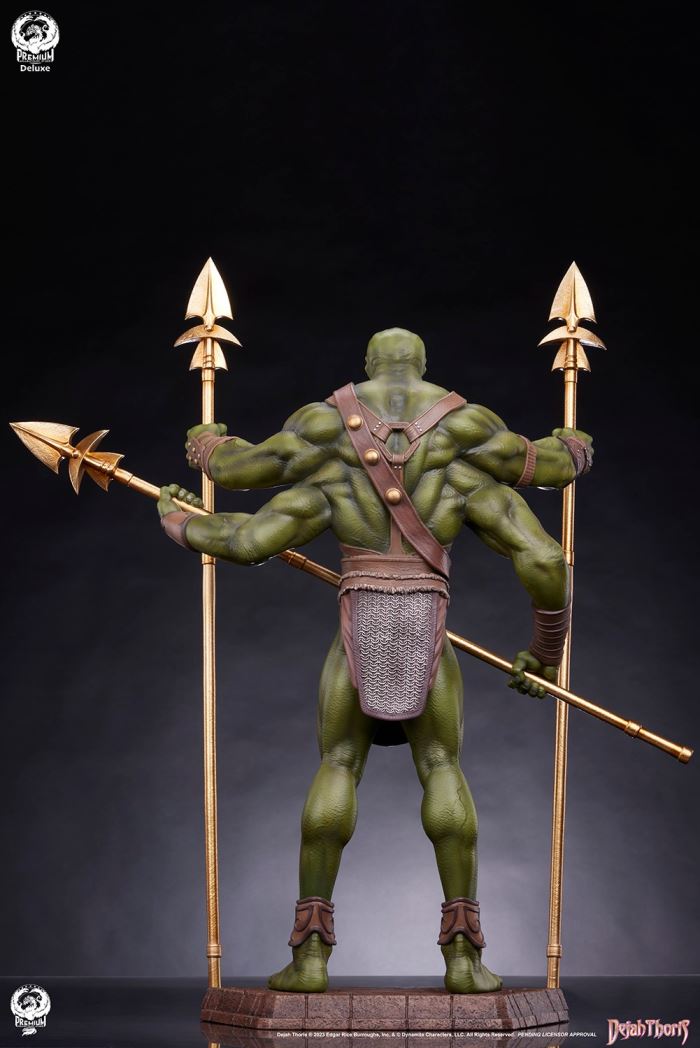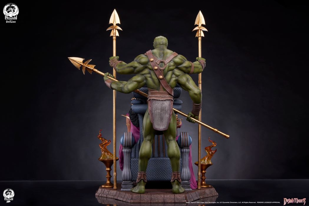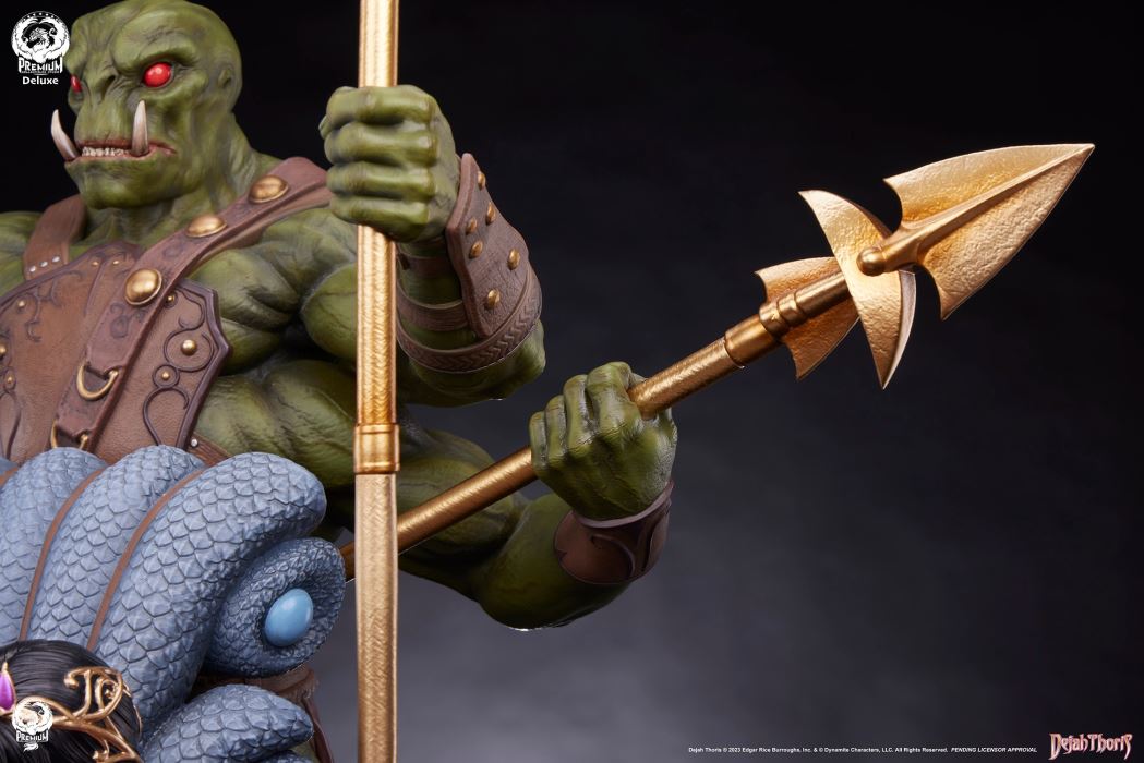 DEJAH THORIS (DELUXE EDITION)Sideshow and Premium Collectibles Studio presents the Dejah Thoris (Deluxe Edition) Quarter Scale Statue.Inspired by the rare issue Dejah Thoris comic cover art, the Dejah Thoris 1:4 scale statue measures 17” tall and 18” wide as the Princess of Mars rests on the regal Throne of Barsoom flanked by two flaming gold braziers on either side.This fully sculpted piece portrays the Martian fan-favorite character in her iconic metallic-ornamented costume, embellished with vibrant purple gems and a flowing drape. The fearsome warrior princess’ highly detailed portrait depicts her mesmerizing blue eyes gazing ahead intently as she lounges, sword in hand, between two Thark skull pillars at the arms of her textured throne.The Deluxe edition includes a fully sculpted green Martian Thark accessory holding three metallic spears as it stands guard behind Dejah Thoris.Bow to the ruler of the red planet and add the otherworldly Dejah Thoris Deluxe 1:4 scale statue to your collection today!Brand:DynamiteCharacter :Dejah ThorisManufacturer :PCSType :StatuesQuarter Scale StatueGenre :Comic Book Sci-fi Pop CultureADDITIONAL DETAILSPurchase Limits : Limit of 2 per person.Product Size:Height: 27.5 (70 cm)Width: 23 (58 cm)Depth: 17 (43 cm) *SKU:9128332Vendor ID :DEJAH14DXUPC :783214377952
