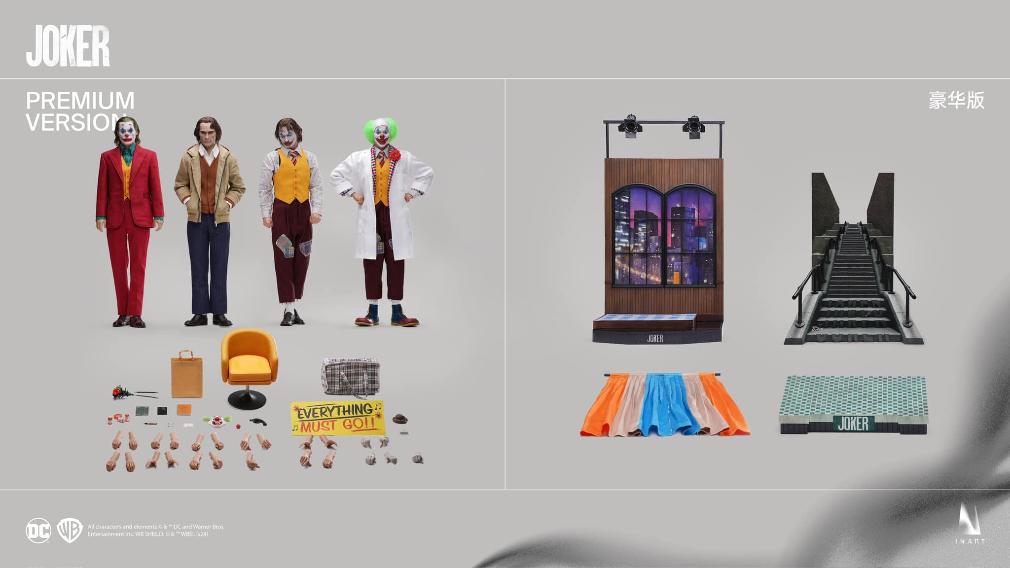 Queen Studios, a modeling label that specializes in expressing the charm of characters and reproducing lifelike details with large-scale statues, yesterday (30th) announced the latest products from the 2019 Joker starring Joaquin Phoenix on its doll brand INART Joker 2019 1/6 scale collectible figure! Deluxe and Premium versions will be released simultaneously, with shipments expected to begin in 2025.Some of the official pictures really look like real-life stills... This is the editor's personal intuitive feeling after seeing this clown. INART not only created a wonderful head sculpt that looks like the charm of Joaquin, but also Arthur Fleck. (Arthur Fleck) in the movie, the costume changes from comedian to clown are all produced together. The Deluxe version includes two costumes of Arthur and clown, while the Premium version is a super bold version with two more Arthurs, for a total of four styles. , in addition to each doll being completed with hair transplantation technology and equipped with movable eyeballs, the sewing of clothing, the carving of leather shoes, the presentation of masks, etc. are all deeply detailed, giving you a complete INART feel. The production team has the aura of being huge Joker fans.The accessories section is very rich, ranging from kraft paper bags, bouquets, notebooks, clown masks, cigarettes, medicine jars, pistols, orange single seats, large signboards, to luggage bags, plus a wealth of replacement hands. , can definitely present the best Joaquin Joker in your mind! Below is an overview of both versions.INART JOKER (2019) 1/6 Collectible FigureRecommended selling price: Deluxe version RMB 6980, Premium version RMB 9980Product specifications: 1/6 scale movable figureEstimated delivery date: First Half 2025