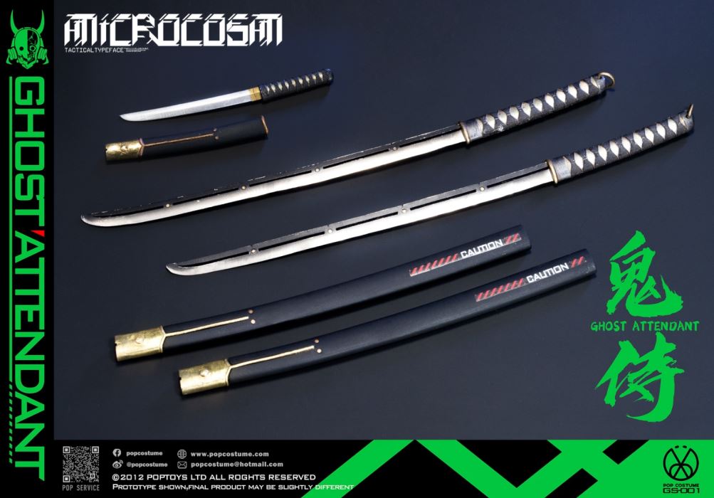 POP COSTUME GS-001 Ghost Attendant Action FigureList:1. Head(with movable eyes)*12. Replaceable face*33. Female body*14. Prosthetic legs*1 pair5. Griped gloved hands*1 pair6. Holding gun gloved hands*1 pair7. Coat*18. Tank top*19. Underpants*110. Leather pants*111. Weapon strap*112. Belt*113. Holster on the leg*114. Oversleeve*115. Bag*116. Waist bag*217. Accessories of the belt*118. Boots*1 pair19. Long sword*220. Short sword*121. Handgun*122. Submachine gun*123. Figure stand*1