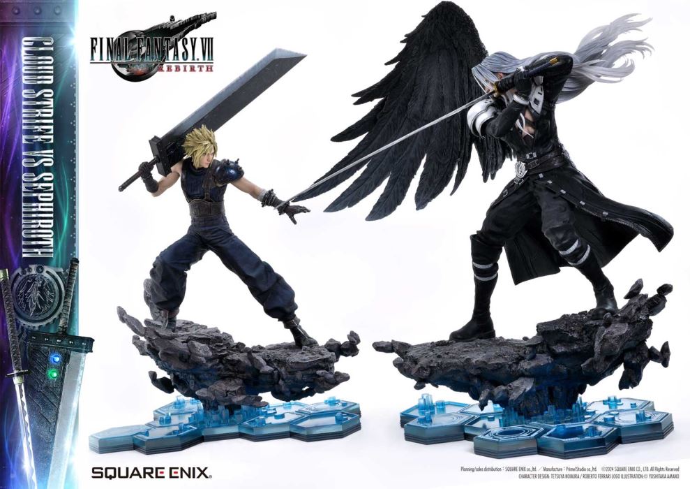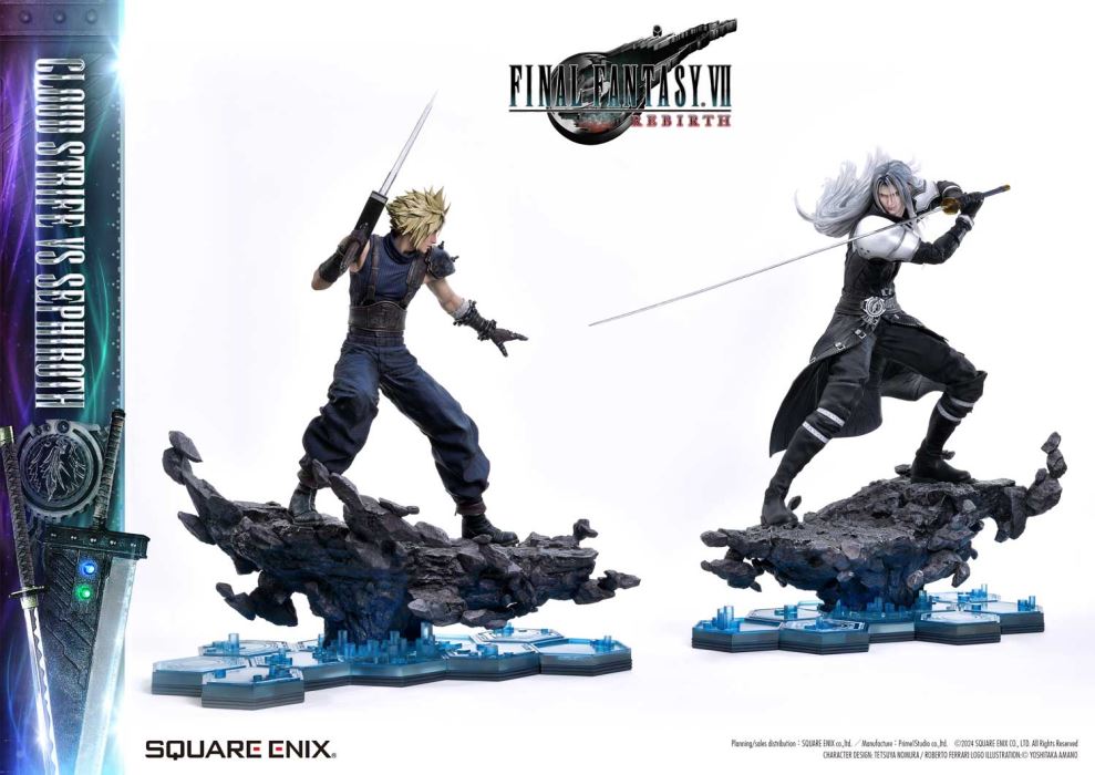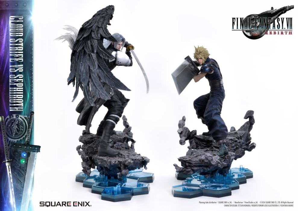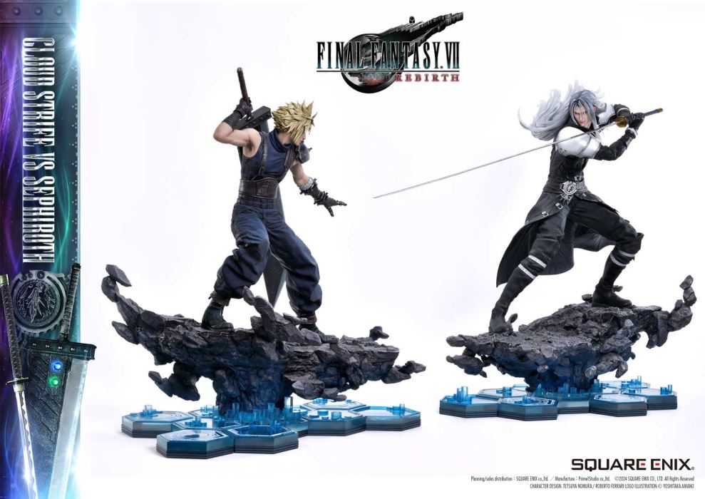 Refined Colors and Sculpting Tell the Story of a Fateful Star-Crossed Rivalry.Cloud and Sephiroth from FINAL FANTASY VII REBIRTH, Brought to Life in 1/4 Scale.Square Enix Masterline, a premium collectible brought to you by the collaboration between Square Enix and Prime 1 Studio. From this globally acclaimed polystone statue series comes Cloud Strife VS Sephiroth from FINAL FANTASY VII REBIRTH!Cloud strikes a defensive stance, holding his great sword at mid-guard, while Sephiroth stands poised with quiet menace radiating from his long blade. This 1/4 scale masterpiece brings to life their fateful confrontation, as they face each other on their journey to overcome the past and destiny itself. From the Buster Sword, capable of equipping Materia, to the mesmerizing blade pattern of Masamune, the dynamic spiky hair, and the imposing black wing extending from Sephiroth’s right shoulder, every detail of their iconic forms has been meticulously crafted. Each element is imbued with unparalleled craftsmanship and artistry.The bottom layer of the specially designed base features a blue hexagonal pattern This design is also used in the base of the same series’ Zack Fair statue, ensuring a cohesive display when paired together.This product includes a variety of additional parts: a wingless upper body for Sephiroth, multiple swappable arms for Cloud, a stunning Crystal Sword, and the exclusive Force Eater. Additionally, a logo stand showcasing included, allowing you to recreate the intertwined stories of their journey across the stars.With unmatched sculpting, coloring, and storytelling, this ultimate representation of their fateful rivalry brings REBIRTH to your collection, commanding presence and elevating your display to new heights!Specifications:Cloud Strife:Two (2) Swappable Both Arms for Buster Sword (High Stance, Low Stance)Two (2) Swappable Right Arms for Buster Sword (Shoulder Carry Pose 1, Shoulder Carry Pose 2)One (1) Swappable Right Wrist for Buster Sword (Single-Hand Grip)One (1) Swappable Right Wrist for Crystal Sword (Single-Hand Grip Pose)One (1) Swappable Left Arm (Open Hand)Five (5) Materia (Magic, Support, Command, Summon, Independent)FINAL FANTASY VII REBIRTH Themed BaseBase Extension PartsOne (1) Force Eater with Arm Parts (Left and Right) [BONUS PART]Sephiroth:Two (2)Upper Body Parts (One-Winged, Wingless)One (1) FINAL FANTASY VII REBIRTH Logo StandFINAL FANTASY VII REBIRTH Themed BaseBase Extension PartsOne (1) FINAL FANTASY VII REBIRTH Logo StandNotice:Prototype samples shown.Product details could be subject to change without further notice.Please note the final product specifications may differ because each product is Handmade.Since the product is still in the development stage, the Size (up to 10%) & Weight (up to 10kg) may be changed during the production stage.Planning / Sales Distribution: SQUARE ENIX Co., Ltd. / Manufacture: Prime 1 Studio Co., Ltd. © SQUARE ENIX CO., LTD. All Rights Reserved. CHARACTER DESIGN: TETSUYA NOMURA / ROBERTO FERRARI LOGO ILLUSTRATION: © YOSHITAKA AMANODETAILSBrandsPRIME 1 STATUECollectionSQUARE ENIX MASTERLINESeriesFinal FantasyScale1/4 ScaleProduct CodeSEM-08Product Size Approx.CloudH:68.1cm W:44cm D:51.9cmH:54.1cm W:32.9cm D:64.1cm(Buster Sword High Stance)SephirothH:68.7cm W:40.8cm D:71.9cmCarton(Est):2 boxProduct Weight Approx.cloud 11.9 kgsephiroth 12.5 kgMaterialsPolystone and other materialsJAN4988601387958