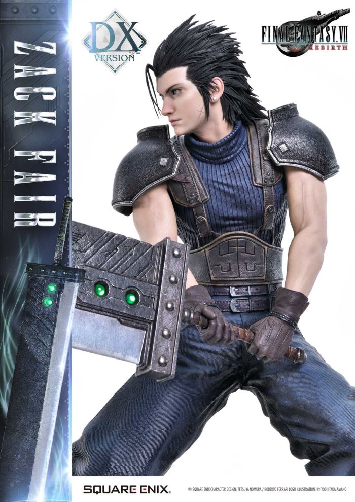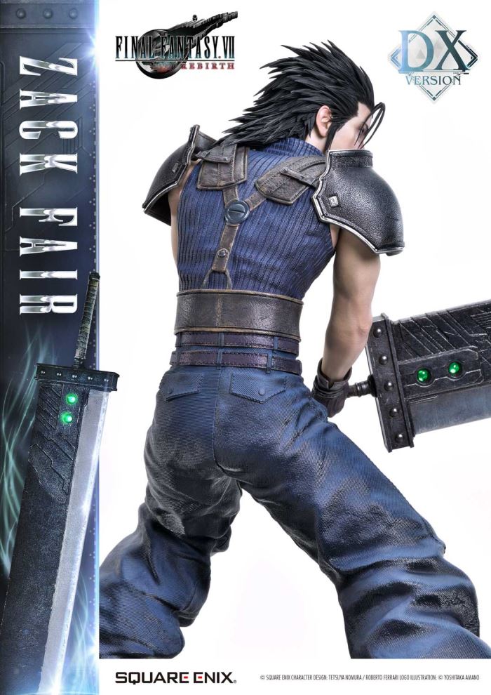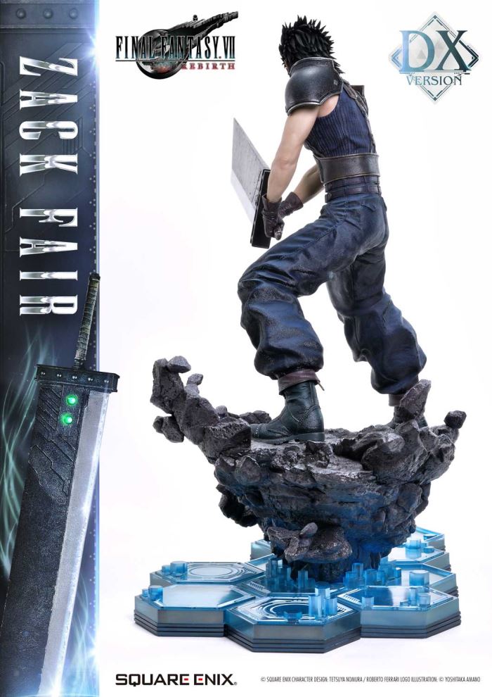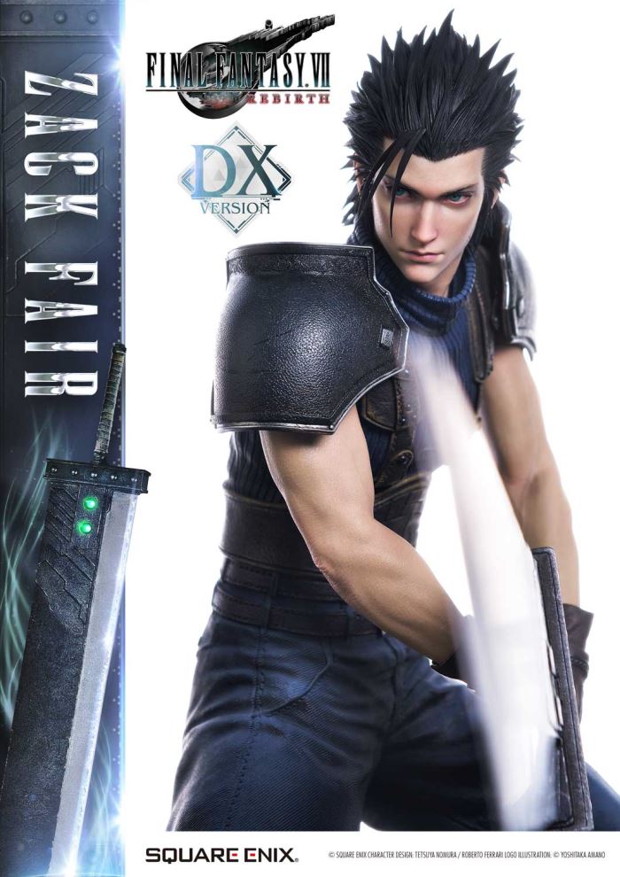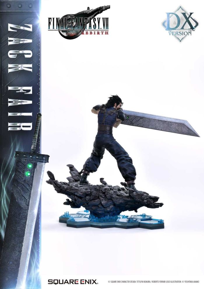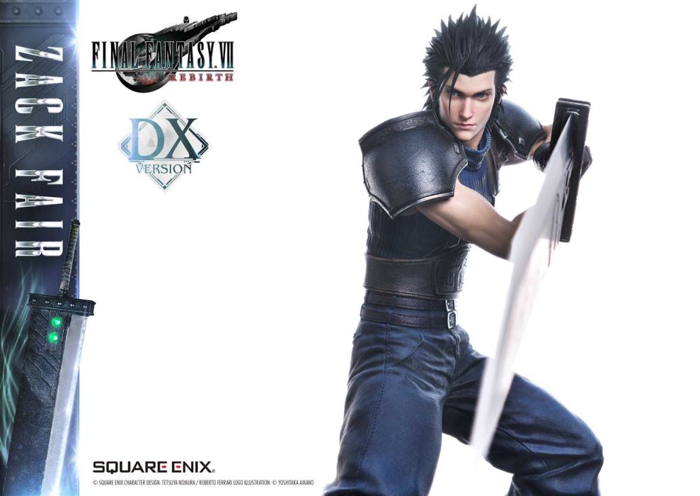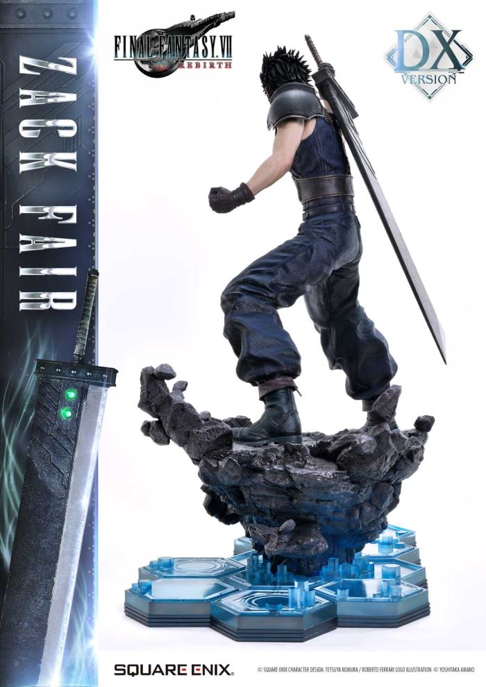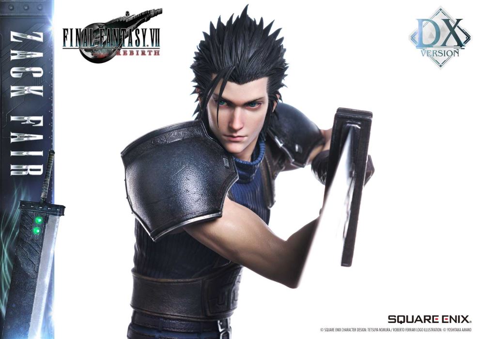 Clear Blue Eyes, a Buster Sword of Pride and Friendship.Masterful Sculpting, Painting, and Storytelling, Bringing Zack Fair from FINAL FANTASY VII REBIRTH in 1/4 ScaleSquare Enix Masterline, a premium collectible series brought to you by the collaboration between Square Enix and Prime 1 Studio. From this globally acclaimed polystone statue lineup comes Zack Fair, the man who never gives up on dreams and hope, from FINAL FANTASY VII REBIRTH!With a balanced mid-stance that excels in both offense and defense, Zack’s powerful gaze forward perfectly captures his in-game presence. His realistic pose at 1/4 scale captures the essence of his tall frame and masterful sword techniques. Faithfully recreated details include the scar on his left cheek, his clear eyes imbued with Mako energy, and the meticulously crafted textures of steel and leather in his costume. Additionally, the Buster Sword, a symbol of his pride and friendship, can be equipped with five different Materia, allowing for customizable displays. Alongside top-tier sculpting and painting techniques, these playful features add another layer of enjoyment.The bottom layer of the specially designed base is adorned with a blue hexagonal pattern, which is also used in the same series’ Cloud Strife and Sephiroth statues. Displaying them together creates a cohesive and unified presentation.The DX version includes interchangeable left and right arms to change Zack’s pose with the Buster Sword. Pose Zack as he reaches for the sword on his back or readies himself for a powerful strike from a high stance. A title logo stand is also included, allowing you to create various storytelling moments.With unmatched sculpting, coloring, and storytelling, Zack Fair shines as an art piece that brings light and pride to your collection!Specifications:Two (2) Swappable Dual-handed Arms (High Stance, Low Stance)One (1) Swappable Right Arm (Shoulder Carry Pose)One (1) Swappable Left Arm (Fist)Five (5) MateriaFINAL FANTASY VII REBIRTH Themed BaseOne (1) FINAL FANTASY VII REBIRTH Logo StandNotice:Prototype samples shown.Product details could be subject to change without further notice.Please note the final product specifications may differ because each product is Handmade.Since the product is still in the development stage, the Size (up to 10%) & Weight (up to 10kg) may be changed during the production stage.© SQUARE ENIX CHARACTER DESIGN: TETSUYA NOMURA / ROBERTO FERRARI LOGO ILLUSTRATION: © YOSHITAKA AMANODETAILSBrandsPRIME 1 STATUECollectionSQUARE ENIX MASTERLINESeriesFinal FantasyScale1/4 ScaleProduct CodeSEM-09DXProduct Size Approx.H:63cm W:37cm D:67cmH:59cm W:34cm D:52cm(Shoulder Carry Pose)H:58cm W:32cm D:68cm(Buster Sword High Stance)Carton(Est):1 boxProduct Weight Approx.11 kgMaterialsPolystone and other materialsJAN4988601387934