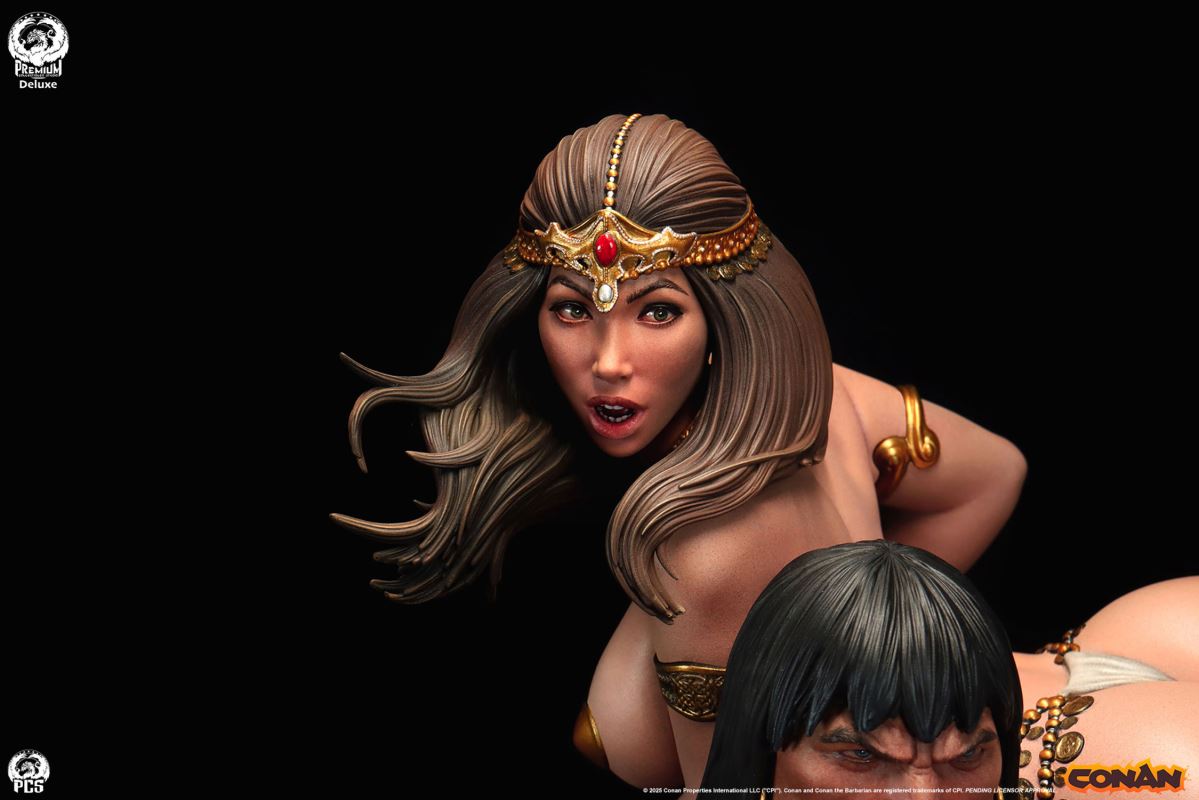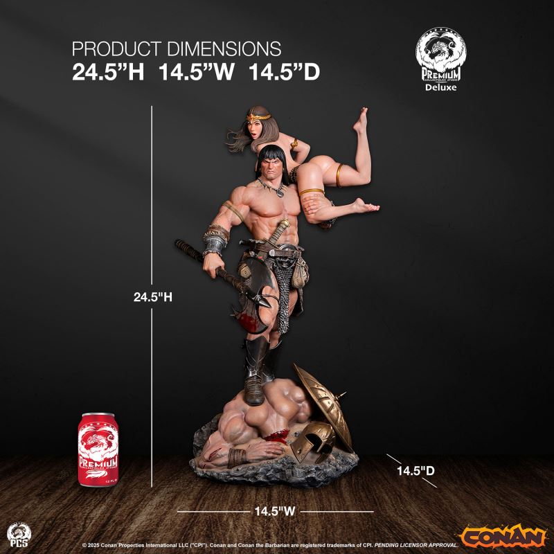 Sideshow and Premium Collectibles Studio are proud to present the Conan 1:4 Scale Statue - Deluxe Edition celebrating the Cimmerian warrior’s earliest comic appearances. Standing nearly 25” tall, Conan is depicted here with a recently rescued young lady slung hastily over his shoulder. Surely the mighty Cimmerian is en route to return her to her family after the harrowing ordeal they both appear to have barely survived. Conan wields a massive bloodied great axe in his right hand, but this statue also includes a swap-out broadsword offering collector’s multiple display options.Conan stands, brow furrowed, atop the back of a recently beheaded foe, seeming to survey the carnage around him with the grim intensity that has come to epitomize the character over his decades of popularity. The Conan statue also includes a third swap out right hand holding the recently removed head of the barbarian’s fallen adversary. The sculpt features incredible details from the ornately decorated weapons and armor to the life-like textures of Conan’s fur raiments and accessories. His companion’s shocked expression and contorted pose add a comical touch to the violent scene. Add some Cimmerian strength to your Conan display and pick up the Conan 1:4 Scale Statue - Deluxe Edition by Premium Collectibles Studio today!Product SizeHeight: 24.5 (62 cm)Width: 14.5 (37 cm)Depth: 14.5 (37 cm) *