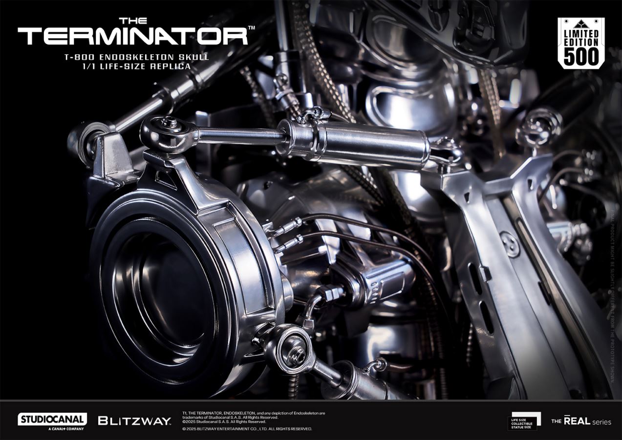 1.Product DetailSize (mm*)W 16.3(41.5cm) x L 10(25.4cm) x H 19.7(50.2cm)Weight *44lbs (20kg)(Product only)50 lbs (23kg)(Including Carton)Package Size (mm*)W 20.6(52.5cm) x D 15.5(39.4cm) x H 24(61.2cm)Carton Size (mm*)W 23.4 (59.5cm) x D 18.2(46.4cm) x H 26.8(68.2cm)*Dimensions and weight are subject to change2.MaterialsSkullPolystone, ABS, Metal, LEDPackageColor Box + Styrofoam3.Shipping DetailsEstimate Shipment :4Q, 2025Limited Edition: 500 PCSUPC (JAN Code): 88093214728154.Product DescriptionI'll be back.James Cameron’s The Terminator (1984) unleashed a vision of a future ruled by artificial intelligence—foreverchanging the face of science fiction. Decades later, it remains a cultural powerhouse.At its core stands the T-800—a relentless machine, forged for destruction but destined for evolution. Its iconicpresence continues to captivate fans across generations.Blitzway brings the legend to life with the T-800 Endoskeleton Skull, a stunning 1:1 life-size masterpiece.Every detail is meticulously recreated—from the hyper-realistic metallic textures to the piercing red LEDeyes—faithfully capturing the raw power and precision of the original design.Own the unstoppable force of The Terminator with Blitzway’s T-800 Endoskeleton Skull.The future is not set. There is no fate but what we make for ourselves. – Sarah Connor5.Product Specifications- Statue dimensions: Approximately 19.7 inches tall [H:50cm W:41.5cm D:25.4cm]- Highly detailed likeness of the Cyberdyne Systems Series 800 Endoskeleton Skull- LED-illuminated eyes- Articulated head movement: Up, down, left, and right- Limited Edition serial numbers on the productPower Type*- USB-C Type- LED lights and head motor*USB-C Type is not included.6.Notice- Specifications are subject to change without prior notice. Final product may differ from prototype shown.© 2025 BLITZWAY ENTERTAINMENT CO., LTD. ALL RIGHTS RESERVED.