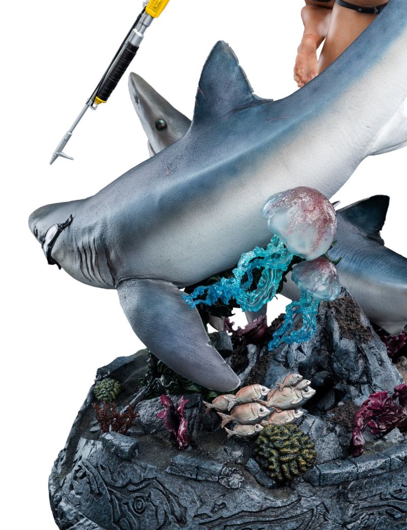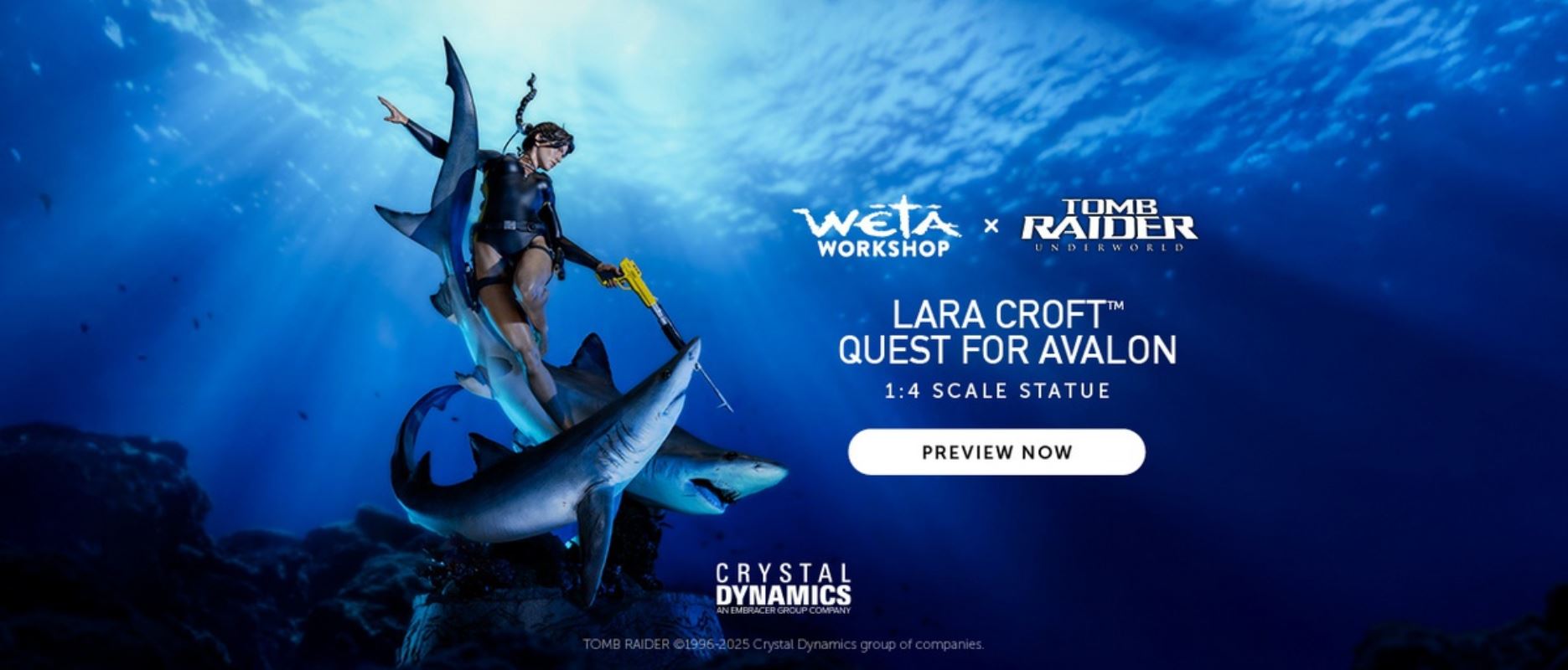 SKU 89-01-04602UPC 9420024746028License Tomb RaiderItem Name Lara Croft-Quest for Avalon 1:4 Scale StatueProduct Category Statue - 1:4 ScaleMSRP USD(excl. tax) USD 1,699.00MSRP AUD(incl. GST) AUD 3,199.00MSRP NZD(incl. GST) NZD 3,199.00Street Date ETA: Q1 2026Edition size 750Individual CartonQty 1Individual CartonWidth (mm) N/AIndividual CartonDepth (mm) N/AIndividual CartonHeight (mm) N/AIndividual CartonWeight (kg) N/AUnits per Master Carton 1Master CartonWidth (mm) N/AMaster CartonDepth (mm) N/AMaster CartonHeight (mm) N/AMaster CartonWeight (kg) N/AProduct Dimensions(without packaging) 12.01 x 29.13 x 17.72 (W x H x D) 30.5 cm x 74.0 cm x 45.0 cmProduct Weight(without packaging) 17.11 lbs (7.76 kg)Age Recommendation 14-99Contains Small Parts?(yes or no) YesCE Certification(yes or no) NoCountry of Origin ChinaWeta Workshop Studio/Brand intro Tomb Raider is an iconic action-adventure franchise that follows the fearless archaeologist Lara Croft as she uncovers ancient secrets, explores forgotten tombs, and faces deadly foes across the globe. Blending puzzle-solving, exploration, and cinematic storytelling, the series has captivated fans for decades with its rich mythology, daring escapades, and a heroine who redefined what it means to be an adventurer.Product Intro The ocean holds its secrets tight, buried beneath centuries of salt and stone. But Lara Croft does not turn away from the unknown; she dives headlong into it. In the silent deep, where ancient ruins whisper of gods and myth, and predators prowl the dark, her search for Avalon continues. Time, tide, and fear itself will not keep her from the truth.Product Description (flavour text) Crafted with the utmost skill and reverence, Lara Croft: Quest for Avalon is a breathtaking 1:4 scale tribute to one of gaming’s most enduring icons. Sculpted in exquisite detail, this collectible captures Lara as she appears in Tomb Raider: Underworld, fully outfitted in her wetsuit and diving gear, harpoon gun in hand, surrounded by the swirling tension of the deep.From the fluid motion of the circling sharks to the coral-encrusted ruins littering the sea floor, every element is carefully designed to evoke the danger, beauty, and mythic scale of Lara’s underwater quest. Hidden among the ruins, a school of fish darts between crumbling stones, adding life and movement to the scene.This is a deep-sea snapshot of Lara at her most daring. Suspended between ancient myth and present danger, it captures the raw essence of her resolve. For those who’ve followed her journey through crumbling temples and sunken worlds, this statue is a must-have relic of an iconic adventure.Product features - 1:4 scale;- Limited Edition size 750;- Made primarily from polystone;- Digitally sculpted by Wētā Workshop’s Jorgelina Yeme with additional sculpting by Mauro Santini;- Depicts Lara Croft caught between action and peril, as seen in Tomb Raider: Underworld;- A dynamic pose, featuring two Sharks, two jellyfish, a school of fish, and Lara Croft mid-dive;- Highly detailed base filled with coral, sea detritus, and crumbled ancient ruins.Product Disclaimer Please note: images are of a pre-production prototype, minor variations may occur.About this product Few characters have carved their place in pop culture quite like Lara Croft. Bold, brilliant, and relentlessly driven, she’s inspired countless adventurers, both onscreen and off. At Wētā Workshop, many of us grew up navigating perilous tombs and deciphering ancient puzzles through the glow of CRT monitors, captivated by the mystery, myth, and grit of the Tomb Raider universe.To now collaborate on bringing her world into the realm of physical collectibles is both an honour and a creative challenge we embrace with full hearts (and steady hands). This is our tribute to a legend. To Lara. And to the fans who’ve walked beside her every step of the way.Product Quote “There’s a poetry to this pose; as if Lara is dancing with the sharks, weightless and fearless. Sculpting her underwater meant letting go of gravity, which goes against the usual instinct of a sculptor. But that challenge was part of the thrill. I especially loved capturing her form, that perfect balance of strength, elegance, beauty and danger that defines Lara Croft.”Quote author Jorgelina Yeme – Senior 3D Artist, Wētā Workshop