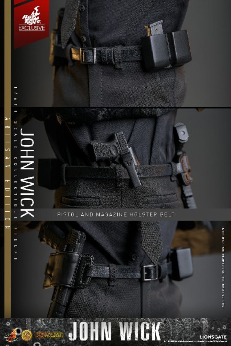 John Wick(Artisan Edition) [Hot Toys Exclusive]1/6th scale Collectible FigureBrought painfully back from self-imposed retirement by a brutal act against the only livingmemory of his past, John Wick re-emerges. In the dangerous blood-soaked underworld, hebecame “Baba Yaga” — the legend and the boogeyman rolled into one.Hot Toys proudly presents the 1/6th scale John Wick Collectible Figure (Artisan Edition). Thefigure features a newly developed head sculpt with separate rolling eyeballs and battle-damagedpaintwork. The Artisan Edition features a meticulously implanted mid-length slicked backhairstyle made of wool material, elevating the figures’ realism. The Artisan Edition is anexclusive release available with a limited quantity of 4,000 pieces only in selected markets.The figure offers a dynamic array of twelve interchangeable hands, from fists and relaxed handsto gun-holding and accessory-holding hands. Dressed in his iconic all-black attire, the setincludes a tailored suit, shirt, tie, high-neck top, belt with two gun holsters and a doublemagazine pouch, pants, socks, and shoes. John Wick is fully armed with a range of weapons,including a detailed pistol with a rackable slide, removable silencer, and detachable magazine; asub-compact pistol with a rackable slide and removable magazine; an assault rifle equipped withadjustable vertical grip, sights, stock, and charging handle; a sniper rifle featuring a slidingbipod, telescopic sight, and pullable bolt; a shotgun with a slidable holographic sight; and acombat knife. A pencil is also included as a nod to John Wick’s lore, with the antagonist ViggoTarasov claiming he once saw John Wick take down three men with it. To reflect the uniqueunderground currency in John Wick’s world, the set comes with stacks of gold coins andindividual coins. Plus, it comes with a stunning life-size gold coin replica.Blending exceptional craftsmanship with cinematic authenticity, this Artisan Edition collectiblefigure captures every detail that defines the legend of John Wick.SpecificationsProduct CodeMMS833AEProduct NameJohn WickHeightApproximately 31 cm tallPoints of Articulations30Special FeaturesAuthentic and detailed likeness of Keanu Reeves as John Wick in John WickProduct Release DateApproximately Q3 – Q4, 2026ArtistsThe 1/6th scale John Wick Collectible Figure (Artisan Edition) specially features:- Authentic and detailed likeness of Keanu Reeves as John Wick in John Wick- Newly developed head sculpt with battle-damaged paint applications and separate rolling eyeballs- Movie-accurate facial expression with detailed beard and skin texture- Meticulously implanted black mid-length slicked back hairstyle (wool material)- Approximately 31 cm tall- Body with 30 points of articulation- Twelve (12) pieces of newly developed interchangeable hands, including:- One (1) pair of fists- One (1) pair of relaxed hands- One (1) pair of gun-holding hands- One (1) pair of suit-holding hands- One (1) pair of accessory holding hands- One (1) piece of gun supporting left hand- One (1) piece of opened gesture left hand- Available in a limited quantity of 4,000 units in selected marketsCostume:- One (1) black colored suit- One (1) black colored shirt with a black colored tie- One (1) black colored high-neck top- One (1) black colored belt with a silver buckle, attached with two (2) pistol holsters and (1) double magazine holster- One (1) pair of black colored pants- One (1) pair of black colored socks- One (1) pair of black colored shoesWeapons:- One (1) pistol with a rackable pistol slide, removable silencer, and removable magazine- One (1) sub-compact pistol with a rackable pistol slide and removable magazine- One (1) assault rifle with a slidable vertical grip, slidable sight, slidable holographic sight, articulated rear sight, pullable charging handle, retractable stock, and removable magazine- One (1) sniper rifle with a slidable bipod, pullable bolt, and slidable telescopic sight- One (1) shotgun with a slidable holographic sight- One (1) combat knife with scabbard- One (1) pencilAccessories:- Three (3) stacks of Gold Coins- Three (3) individual Gold Coins- One (1) Life-Size Gold Coin- Specially designed figure stand with character nameplateRelease date: Approximately Q3 – Q4, 2026*Prototype shown, final product may be slightly different**Product details could be subject to change without further notice®, TM & © 2025 Lions Gate Entertainment Inc. and related companies. All Rights Reserved.© 2025 Hot Toys Limited. All Rights Reserved.