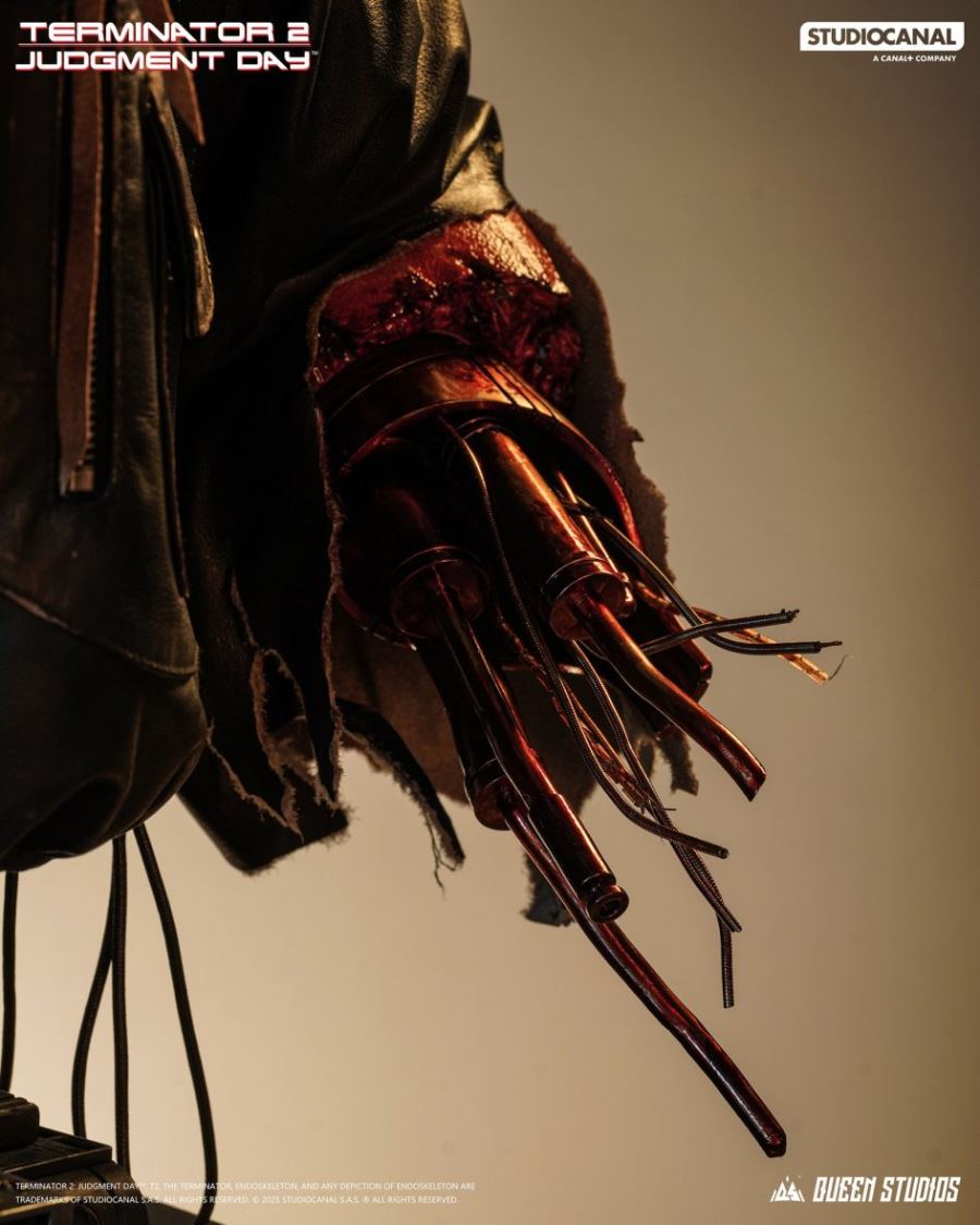 Queen Studios presents the Life-Size Bust of the T-800 Battle Damaged (Mechanical) from Terminator 2: Judgment Day .The bust, crafted from silicone for ultra-realism, features a damaged version of Schwarzenegger's cyborg, complete with fully detailed internal mechanical structure. The clothing is reproduced with real leather , while the hair is implanted for added fidelity to the film's look.The head offers a slight lateral movement, and the torso features light effects in the red of the left eye and right hand recreating the final scene , supplied as a separate display piece.The piece measures 92 cm high , 75 cm wide and 48 cm deep , while the interchangeable hand measures 32 × 20 × 20 cm . The edition is limited to 299 pieces .Pre-orders are open at $7,660 with a release expected in Q4 2026.