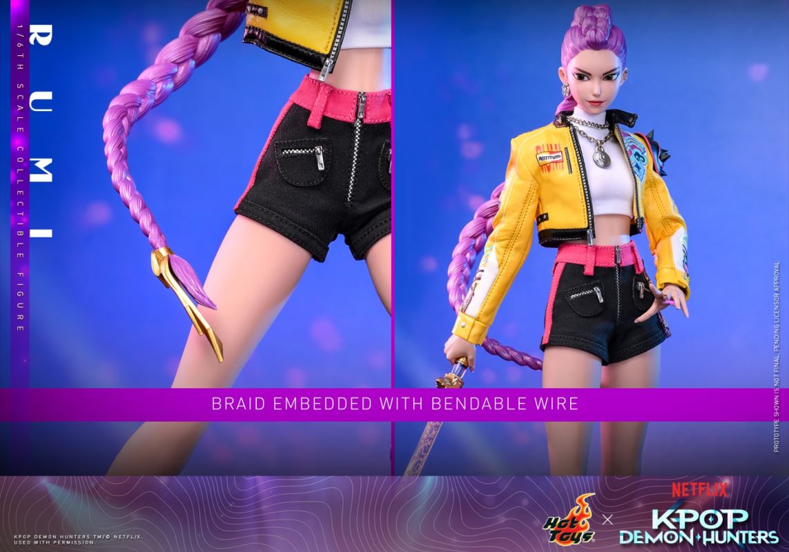 Hot Toys × *K-POP: Demon Hunters*HUNTR/X – Rumi, Mila, and Zoe – All AssembledPossessable Eyes + Dual-Expression Head Sculpt · Seamless Silicone Body Technology · Movie-Grade Accessories(January 28, 2026) Netflix released the phenomenal animated film *K-POP: Demon Hunters* in June 2025, quickly becoming Netflix's most-watched animated film. The film tells the story of the top girl group HUNTR/X, who are dazzling idols on stage by day, but their true identities at night are demon hunters protecting the human world, using their songs as weapons to stop demons from invading humanity. The novel subject matter, creative setting, and the integration of phenomenal music distribution contributed to the film's huge commercial success.Hot Toys (www.hottoys.com.hk) has unveiled its previously announced Netflix licensed collaboration, bringing its flagship-level craftsmanship to K-pop with the official announcement of the *K-POP: The Witcher* series. The series features 1:6 scale collectible figures of Rumi, Mira, and Zoey, three members of the top girl group HUNTR/X from the film, offering collectors and fans worldwide a new high-end collecting experience.Design Concept: A Three-Dimensional Recreation of the Animated WorldHot Toys remains true to its characters, using costumes from HUNTR/X's opening stage performance of How It's Done to accurately represent the original visual standards. The three 1:6 scale collectible figures feature seamless silicone bodies, replicating the visual and tactile texture of lifelike skin, and incorporate highly articulated joints. The figures are designed to be proportionally accurate to each character, with each member's head sculpt meticulously recreating makeup details. Two interchangeable facial expressions are included: a standard stage expression and a singing expression. Independent movable eyes allow adjustment of the figure's gaze, enabling interactive displays such as eye contact between the three members and eye contact with the audience.Standard Accessories: Microphone, smartphone, cup noodles, HUNTR/X light stick, laser autograph poster, 8 interchangeable hands, and a specially designed lenticular 3D character backdrop themed around the concert.====================================Rumi: The Purple Flame Center, the Perfect Embodiment of Stage Presence and Battlefield CommandHUNTR/X leader and lead vocalist Rumi commands the girl group with an unshakeable center-position aura, conquering fans worldwide on stage.This 1:6 scale Rumi collectible figure stands approximately 28cm tall and features an implanted wire purple scorpion braid hairstyle for a dynamic effect. The costume perfectly recreates the stage look from How It's Done: a bright yellow knight's jacket with studded shoulder ornaments, a white turtleneck cropped top, shorts, a necklace, a purple rope pendant, and platform boots. The exclusive weapon is the Four Tigers Sword, with a transparent blade engraved with constellation patterns and a gold hilt. A custom-made Rumi laser support banner is also included.K-POP: Witcher GirlsRumi 1:6 Scale Collectible Figure Product Specifications~ Movie Masterpiece Series ~K-POP: Witcher Girls 1:6 Scale Collectible Figure Product Features:- Based on the animated film K-POP: Witcher Girls, meticulously crafted to perfectly recreate Rumi's design.- Newly sculpted high-fidelity head sculpt with independently movable eyes and two interchangeable face sculpts (smiling and singing expressions).- Detailed depiction of her purple scorpion braid hairstyle (with concealed malleable wire).- High-fidelity painting technique to highlight skin texture and makeup details.- Newly created body with up to 28 points of articulation.- Body made of silicone with an internal metal skeleton for seamless joint design.- Approximately 28cm tall.- 8 newly created interchangeable hands with rings and nail polish, including:A pair of fistsA pair of open handsA pair of hands holding weapons and accessories. Left hand holding a cup noodle/half-heart gestureRight hand holding a one-finger gestureCostume:- A newly tailored stage costume for How It's Done, including:A short yellow knight jacket with graphic details and a black studded shoulder pad on the left shoulderA white turtleneck cropped topA metallic necklaceA metallic necklace with a silver pendantA pair of black high-waisted shorts with pink stripes and a purple rope knot pendantA pair of black high-top platform boots with pink and green stripesWeapon:- A four-horned sword with a gold hilt and a translucent blade engraved with constellation patternsAccessories:- A microphoneA smartphoneA cup noodle with a horn logoA HUNTR/X light stickA Rumi laser-signed posterA Rumi laser bannerA lenticular character backdropA specially designed stage base with character name tagsProduct Number: TMS176Product Barcode: 4895228624369Packaging: 6 pcs per caseRelease Date: Approximately Q2-Q3 2027The image shown is not the final product prototype and is awaiting approval.Product details are subject to change without notice.KPop Demon Hunters TM/(C) Netflix. Used with permission.(C) 2026 Hot Toys Limited. All Rights Reserved.-----------------------------Mila: A Cold, Flaming Visual, a Balance of Dance Lines and Deadly PrecisionWhether captivating audiences with perfectly choreographed choreography on stage or battling demons with deadly skill, HUNTR/X's lead dancer Mila displays unparalleled composure and power. This 1:6 scale collectible figure of Mila stands approximately 28.5cm tall and features a meticulously sculpted pink half-up twin ponytail hairstyle, faithfully recreating her film image. Her outfit includes a black printed cropped top with silver shoulder straps, a choker, a yellow high-waisted skirt with metal chains and pink knots, and black over-the-knee boots. Her signature weapon is a crescent-shaped blade with a transparent curved blade adorned with gold bells and a segmented hilt.K-POP: Witcher GirlsMira 1:6 Scale Collectible Figure P