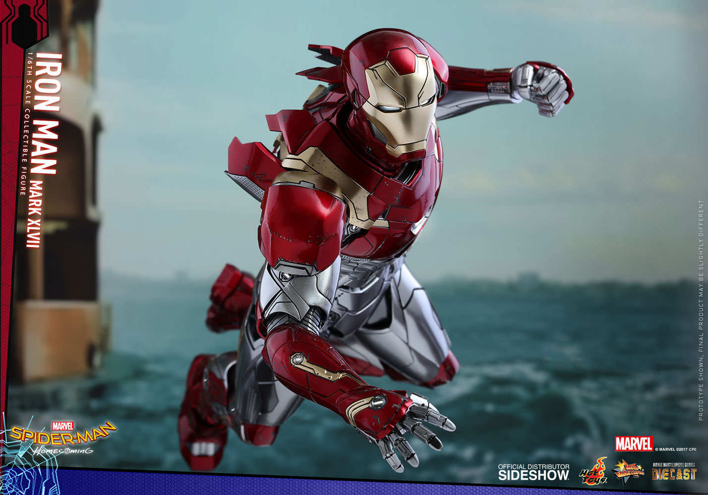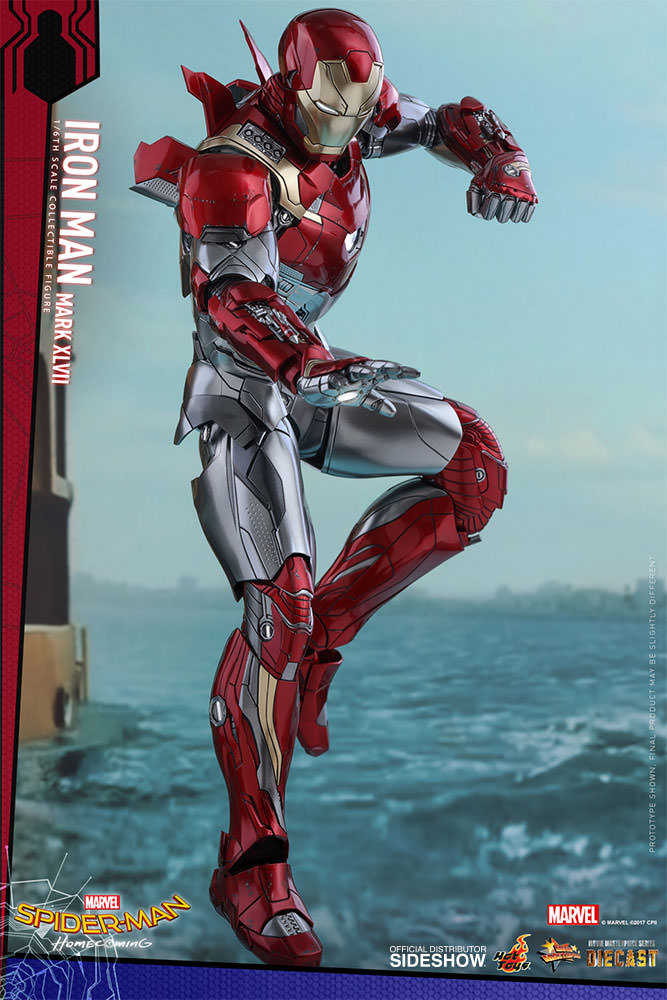 ABOUT THIS SIXTH SCALE FIGUREFollowing the events of Captain America: Civil War, Tony Stark took up the role as Peter Parker’s mentor, guiding him to strike a balance between his dual identity of being a high school student and a superhero. With Spider-Man: Homecoming, Sideshow, and Hot Toys are very excited to present to you the latest Iron Man Mark XLVII as an addition to the Hot Toys MMS Diecast Series.Made with fine diecast materials, the elaborate Iron Man XLVII figure stands approximately 32 cm and with 28 LED light-up points throughout the body. The streamlined armor is expertly painted with metallic red and gold colors and a distinctive two-toned silver color in the mid-section. An array of components are added to the figure including a newly painted Tony Stark head sculpt featuring the likeness of Robert Downey Jr., an interchangeable LED light-up helmeted head, an interchangeable empty helmet emulating the suit in remote control mode, interchangeable armor parts and a specially designed figure stand. Furthermore, a mini-repulsors deployer with two articulated mini-repulsors and thrust fire effect parts are specially included for this new Iron Man armor!This Iron Man Mark XLVII collectible figure is something you do not want to miss. It will definitely be an excellent addition to your Iron Man collection.LicenseMarvelTypeSixth Scale FigureManufacturerHot ToysArtistsKojun (Head Sculpt)JC. Hong (Head Paint and Art Direction)WHAT'S IN THE BOX?The Iron Man Mark XLVII (Diecast) Sixth Scale Figure specially features:An authentic and detailed likeness of Mark XLVII in Spider-Man: HomecomingA newly painted head sculpt with authentic likeness of Robert Downey Jr. as Tony Stark in the movieMovie-accurate facial features with detailed beard, wrinkles and skin textureOne (1) interchangeable helmeted head with LED light-up function (white light, battery operated)One (1) interchangeable empty helmet with detachable maskApproximately 32 cm tallContains diecast materialOver 30 points of articulationSpecial features on armor:Metallic red, gold, silver, and dark silver colored painting on the sleek and streamlined Mark XLVII armor design28 LED light-up points throughout parts of the armor (white light, battery operated)One (1) pair of interchangeable shoulder armors (regular, missile firing)One (1) pair of interchangeable forearm armors (regular, missile firing)Fully deployed air flaps at back of the armorOne (1) chest armor (can be detached to reveal interior mechanical design)Four (4) pairs of interchangeable hands including: - One (1) pair of fists - One (1) pair of hands with articulated fingers and light-up repulsors (white light, battery operated) - One (1) pair of battle palms with light-up repulsor (white light, battery operated) - One (1) pair of hands with real-like thrust fire effectArticulations on waist armor which allow flexible movementEach head sculpt is specially hand-paintedAccessories:One (1) pair of grey-colored lens glassesOne (1) mini-repulsor deployer with dynamic standTwo (2) articulated mini-repulsorsTwo (2) life-like thrust fire accessories attachable to the mini-repulsors and the deployer emulating the repulsors being launchedTwo (2) life-like thrust fire accessories attachable to the feet of the figureFigure stand with character nameplate and the movie logoADDITIONAL DETAILS & DIMENSIONSExpected to ShipJan 2018 - Mar 2018Item shown is a prototype. When shipped, the final production piece may differ in appearance.Product Size12.59 H (319.79mm)*Dimensional WeightTBDInt'l Dim. WeightTBD* Size and weight are approximate values.SKU903079UPC4897011183763PRICE$354.99© MARVEL © 2017 CPII. All Rights Reserved. © 2017 Hot Toys Limited. All Rights Reserved.
