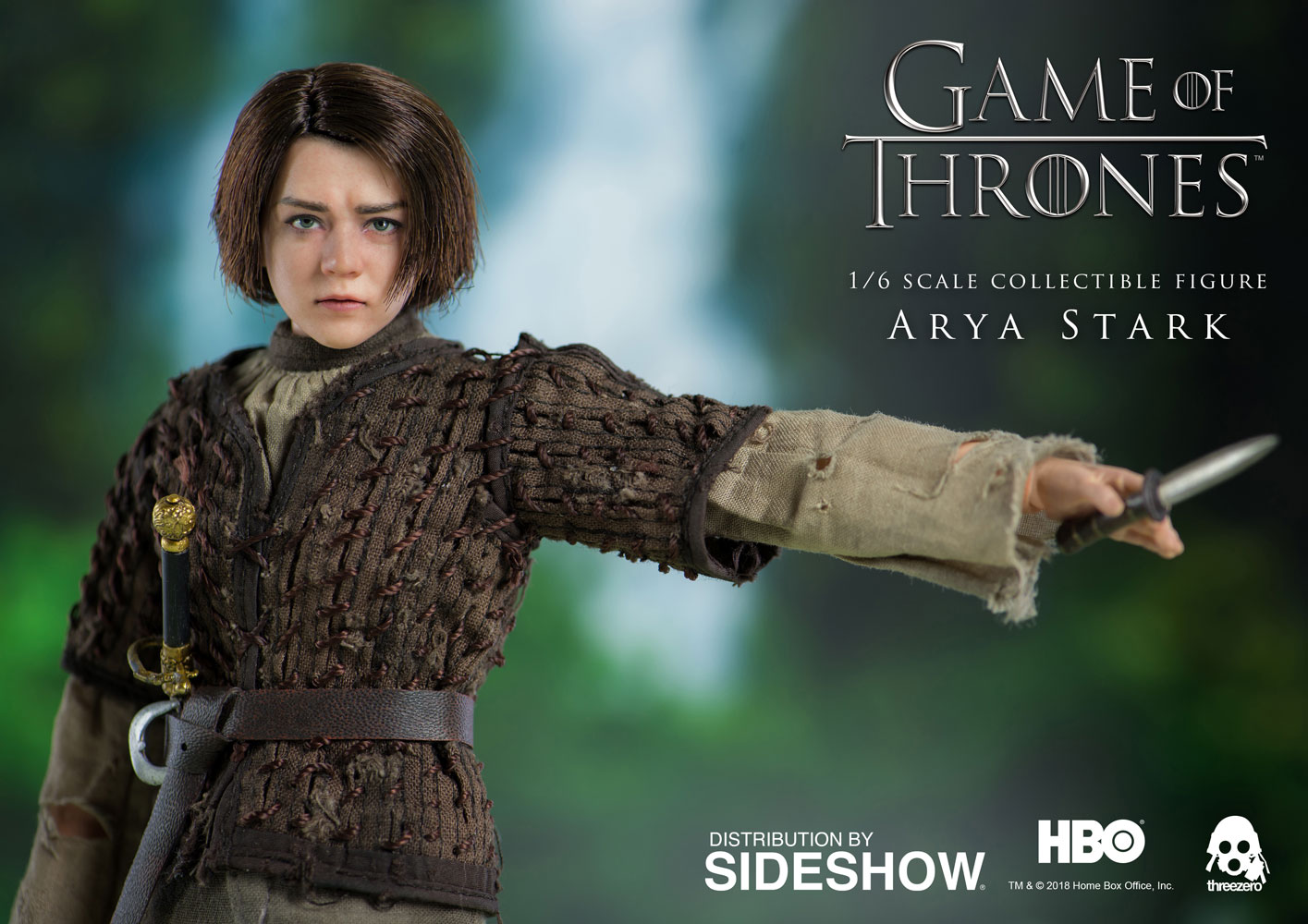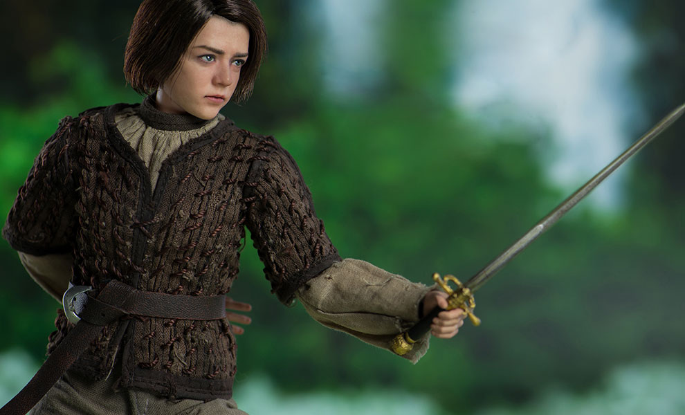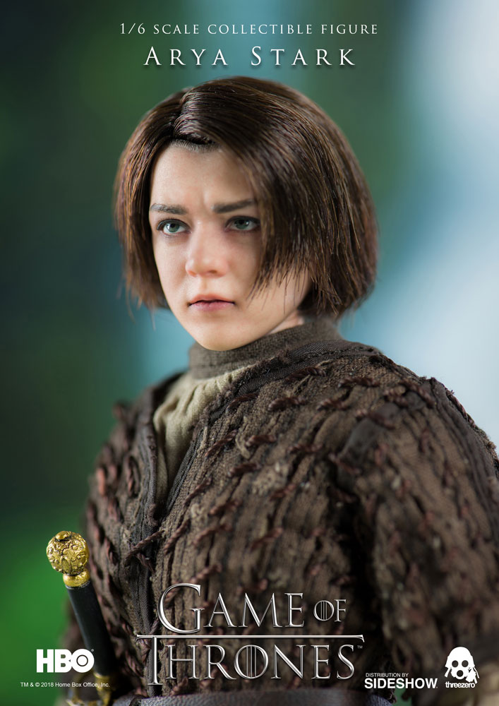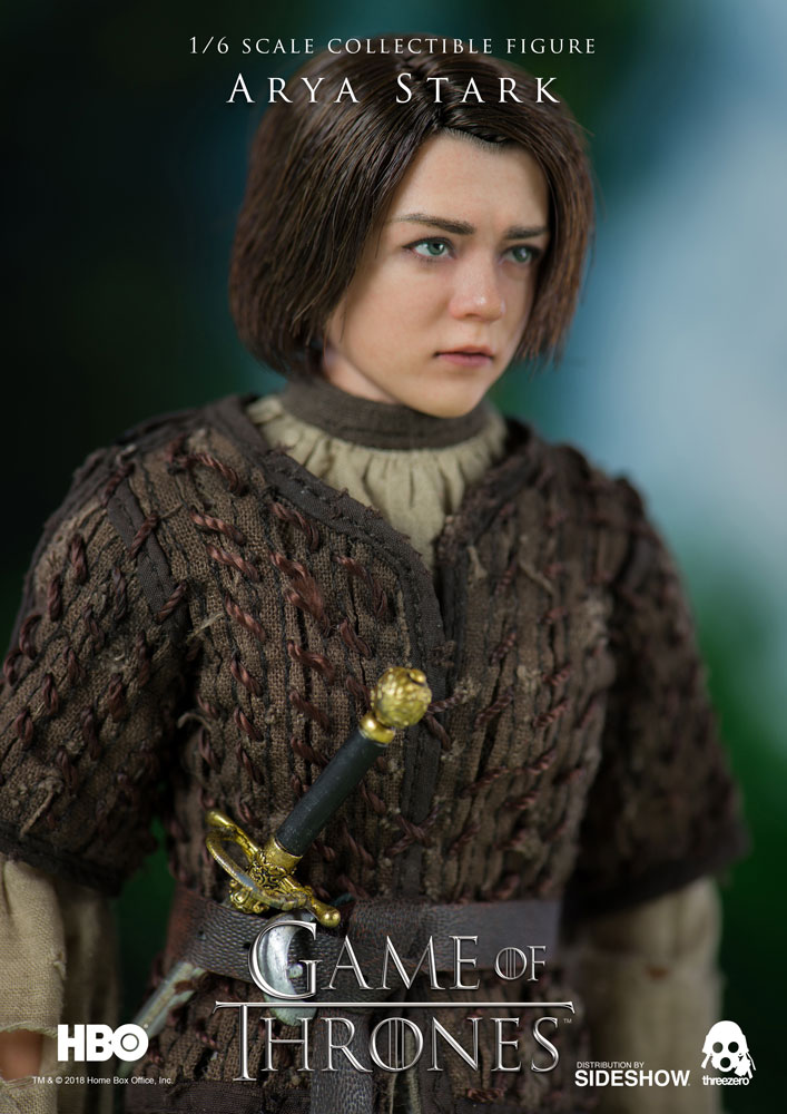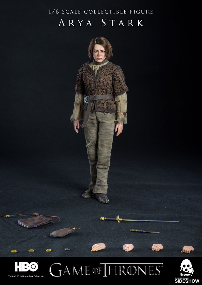 Arya Stark ABOUT THIS SIXTH SCALE FIGUREThreezero is proud to present the Arya Stark Sixth Scale Collectible Figure from the HBO hit show Game of Thrones!The Arya Stark figure stands approximately 10″ tall and features a highly realistic likeness to the character in the television series. Arya includes finely tailored clothing with detailed texture, needle, knife, waterskin, Braavosi coin, and more. Don't miss your chance to add Arya Stark to your Game of Thrones collection!LicenseGame of ThronesTypeSixth Scale FigureMaterialsABS, PVC, POM, Fabric, PaperManufacturerThreezeroWHAT'S IN THE BOX?The Arya Stark Sixth Scale Figure features:Highly-accurate realistic likeness to the character as portrayed in the television series Game of ThronesApproximately 10 inches (~25.5cm) tallArticulated figure featuring tailored clothing with fine detailed texturesShirtTunic with hand-knitted patternTrousersBelt with buckleBootsAccessories:NeedleKnifeWaterskinCoin pouch with coinsBraavosi CoinInterchangeable hands:One (1) pair of relaxed hands One (1) pair of fistsLeft hand for gripping the needle and knifeSpecial pose of left hand for gripping NeedleADDITIONAL DETAILS & DIMENSIONSExpected to ShipJul 2018 - Sep 2018Item shown is a prototype. When shipped, the final production piece may differ in appearance.Product Size10 H (254mm)*Dimensional WeightTBDInt'l Dim. WeightTBD* Size and weight are approximate values.SKU903354UPC4897056201125TM & © 2018 Home Box Office, Inc.