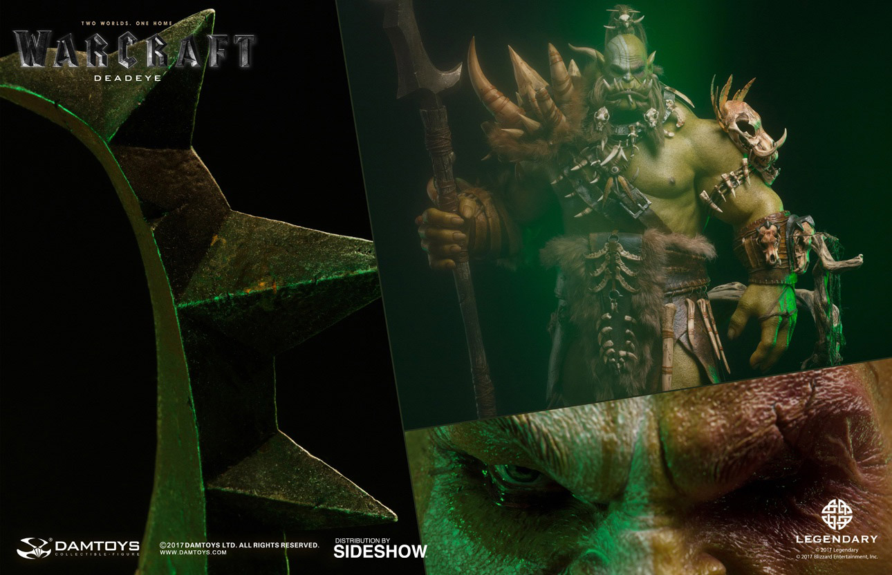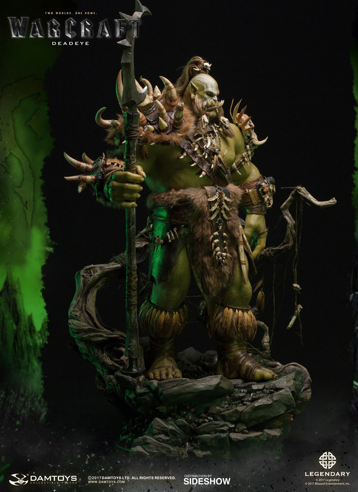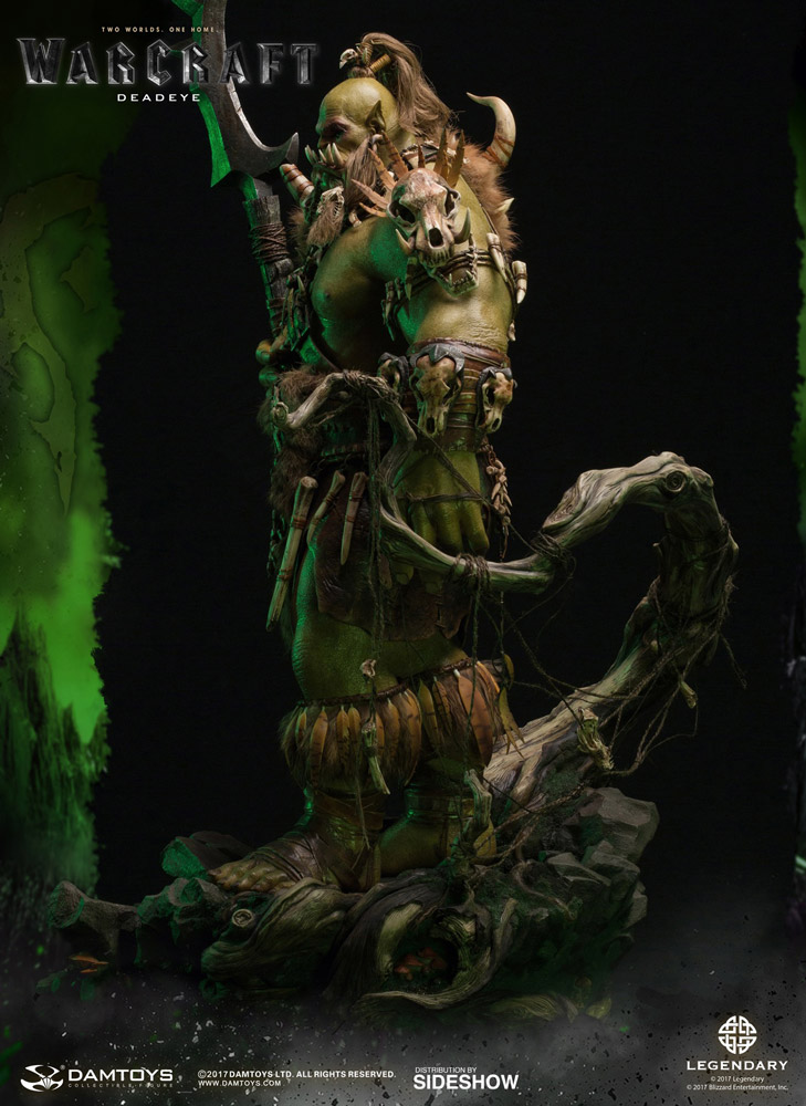 Kilrogg Deadeye Statue by DamtoysABOUT THIS STATUEDAMTOYS is proud to announce the sixth release of the Legendary Pictures production and Blizzard Entertainment classic video game adaptation, Warcraft movie. Kilrogg Deadeye sacrificed his left eye for a chance to see his future fate, Chieftain of the Bleeding Hollow Clan.The dim, green space distortion of the Portal fades, unveiling the place. Mossy rocks, lush vegetation, behind the Portal turns out to be a familiar, memorable forest, evoking an illusion of homeland. However, the warrior’s vigilance dispels that false sense of comfort and Kilrogg Deadeye makes his first step towards establishing a new home.Based on the movie settings and props, DAMTOYS' best team, equipped with top production technology, has produced an exquisite Kilrogg Deadeye statue that’s about 75cm tall. This product is mainly made of high-grade Polystone, with dead-on details of the character’s dynamics, armor, belt, staff, and even skin texture! The costume is made of real fabric and genuine leather for film-accurate texture and color. Complex hair implantation process is used for the head sculpt. The scene selected is of the Orcs passing through the Portal, arriving at Azeroth for the first time. With the vegetation, rocks and numerous forest elements from the film, the environment looks and feels thoroughly film-accurate!DAMTOYS Epic Series Kilrogg Deadeye Premium Statue – bringing you an all-new experience of stunning visuals and definitely should not be missed!LicenseWarcraftTypeStatueMaterialsPolystone, PVC, Fabric, Leather, FeatherManufacturerDamtoysADDITIONAL DETAILS & DIMENSIONSExpected to ShipJun 2018 - Aug 2018Item shown is a prototype. When shipped, the final production piece may differ in appearance.Product Size29.5 H (749.3mm) x 19.29 W (489.97mm) x 18.94 L (481.08mm)*Product Weight36.00 lbs (16.33 kg)*Dimensional WeightTBDInt'l Dim. WeightTBD* Size and weight are approximate values.SKU903356UPC6970569623658© 2017DAMTOYS LTD. ALL RIGHTS RESERVED. © 2017 Legendary © 2017 Blizzard Entertainment, Inc.