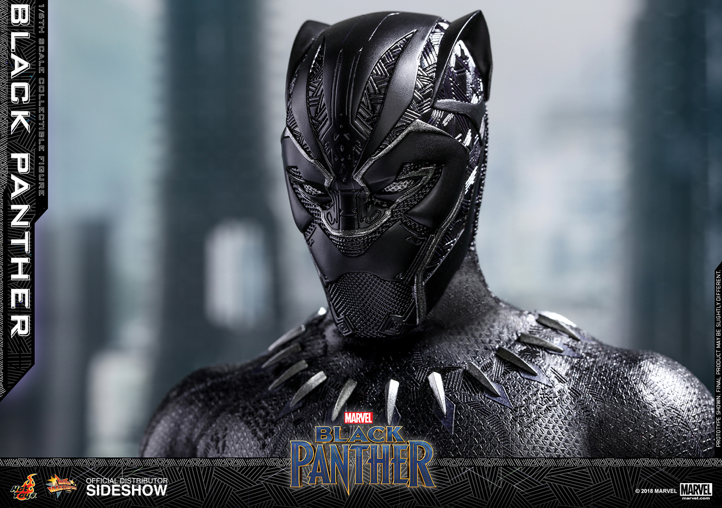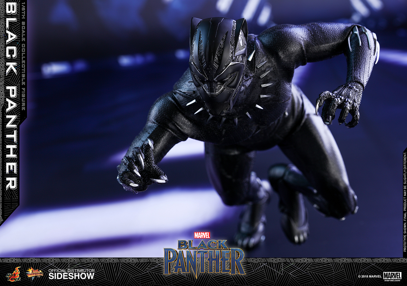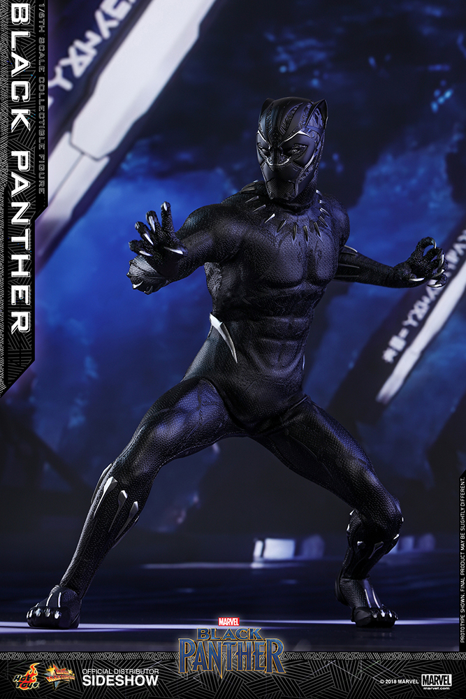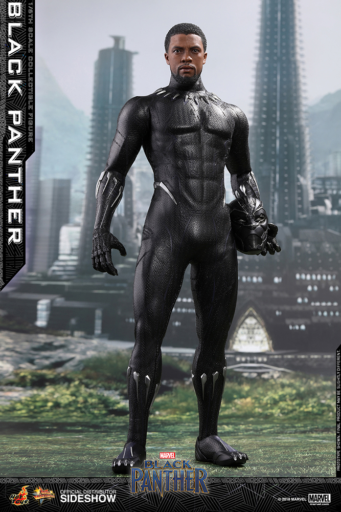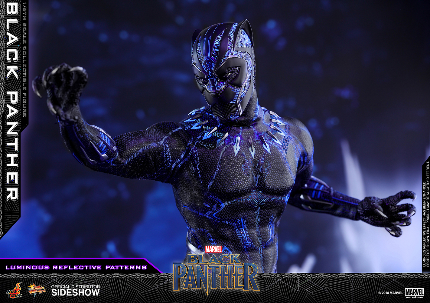 ABOUT THIS SIXTH SCALE FIGURE“What happens now determines what happens to the rest of the world.”Marvel Studios is continuing to expand the Marvel Cinematic Universe by bringing some more exciting new characters to the screen. The young king T’Challa a.k.a. Black Panther who made his debut in Captain America: Civil War, this time must secure the throne and save Wakanda from enemies who intend to bring the downfall of the reclusive and technologically advanced African nation.Sideshow and Hot Toys are proud to present the latest Black Panther sixth scale collectible figure! For the first time ever, Hot Toys has incorporated insanely detailed luminous reflective patterns into the costume to re-create this extraordinary new Panther Habit suit with mystical elements under specialized LED lighting exposures.Finely crafted based on the appearance of Chadwick Boseman as Black Panther in the movie of the same title, the movie-accurate collectible figure features two interchangeable heads which include a newly developed head sculpt with stunning likeness and an all-new masked head with two interchangeable eye pieces, a newly developed body which can naturally portray Black Panther’s muscular body, a meticulously tailored new Black Panther suit with fine details and the spectacular feature of purple patterns appearing under specialized LED light, a character backdrop and a movie themed hexagonal figure stand with two specialized LED light units. Now is the time to pre-order this new Black Panther collectible figure, the warrior king will surely be one of the most epic additions to your Marvel collection.LicenseMarvelTypeSixth Scale FigureManufacturerHot ToysArtistsSo-Young, Lee (Head Sculpt)Da-Hye, Kim (Head 3D Design)JC. Hong (Head Paint & Head Art Direction)WHAT'S IN THE BOX?The Black Panther Sixth Scale Collectible Figure specially features:One (1) newly developed interchangeable head sculpt with authentic and detailed likeness of Chadwick Boseman as T’Challa/Black Panther in Black PantherOne (1) newly developed interchangeable Black Panther masked head with two (2) interchangeable eyepieces (masked and unmasked)Approximately 31.5 cm tallNewly developed muscular body with over 32 points of articulationSeven (7) pieces of interchangeable hands including: - One (1) pair of fists - One (1) pair of clenching hands - One (1) pair of clenching hands with claws - One (1) right hand for holding spearEach head sculpt is specially hand-paintedCostume:One (1) meticulously tailored black and silver colored Panther Habit suit with luminous reflective patterns appearing under specialized LED light unitWeapon:One (1) spearAccessories:Two (2) specialized LED light units (battery operated)Specially designed Black Panther themed hexagonal figure stand with character nameplate, movie logo and character backdropADDITIONAL DETAILS & DIMENSIONSExpected to ShipJan 2019 - Mar 2019Item shown is a prototype. When shipped, the final production piece may differ in appearance.Product Size12.40 H (314.96mm)*Dimensional WeightTBDInt'l Dim. WeightTBD* Size and weight are approximate values.SKU903380UPC4897011185828© 2018 MARVEL .© 2018 Hot Toys Limited. All Rights Reserved.