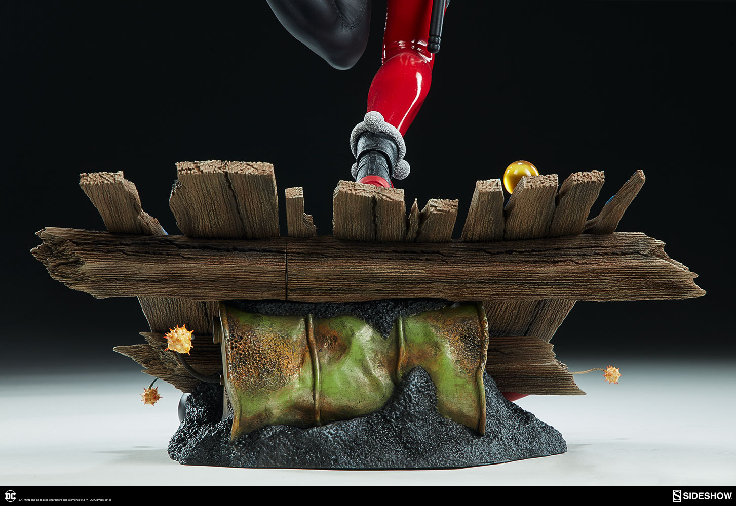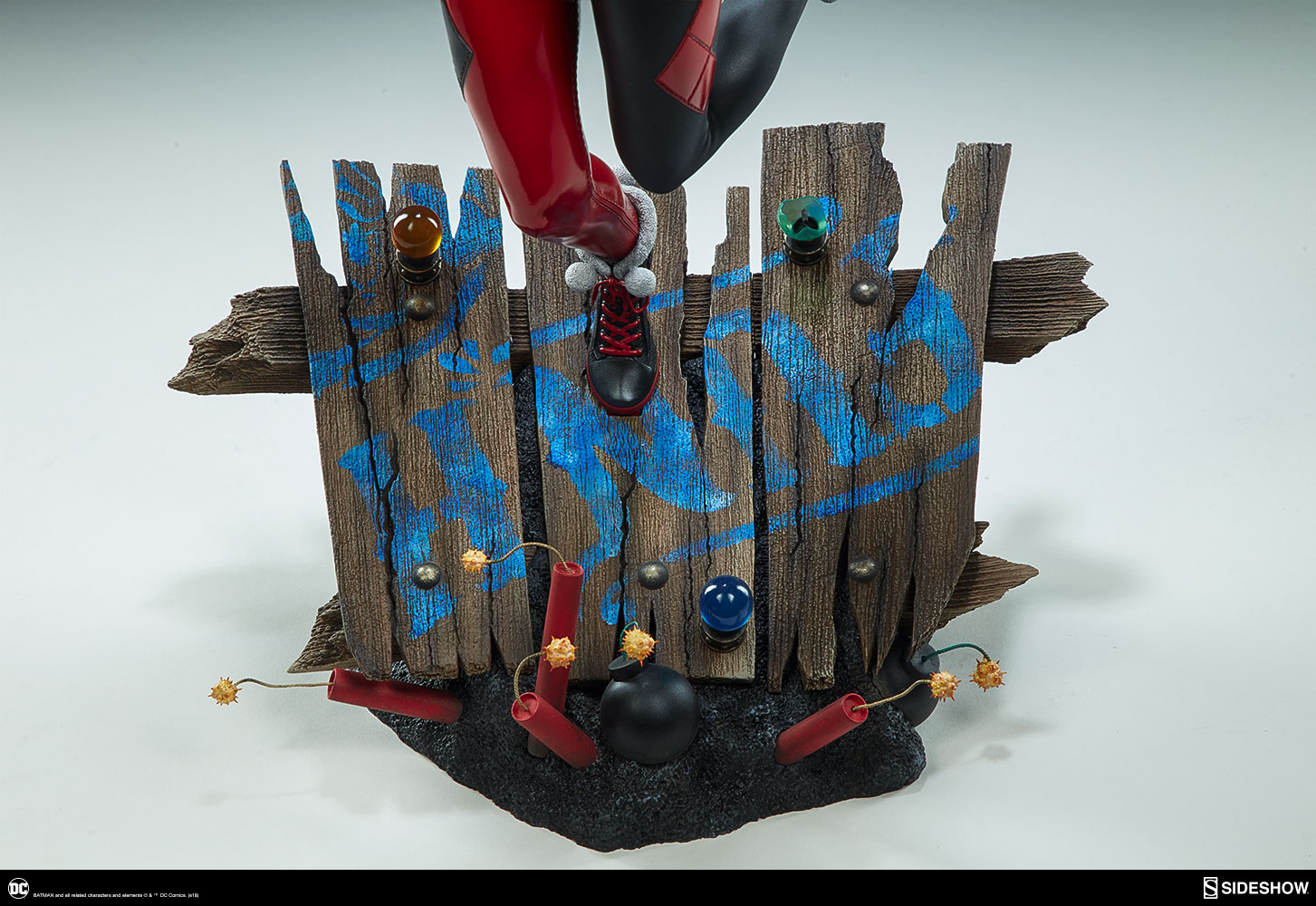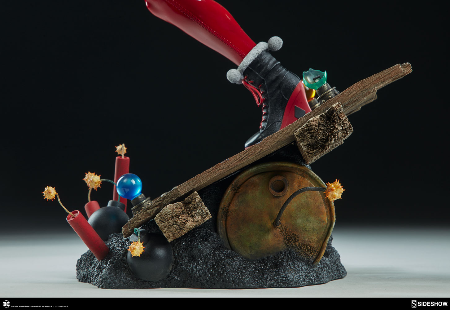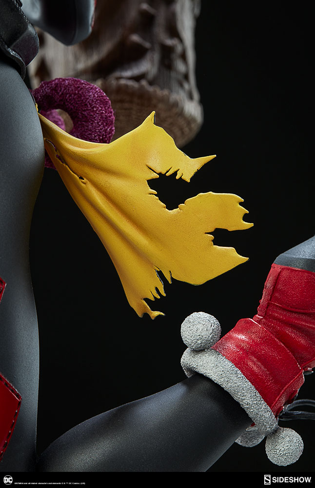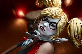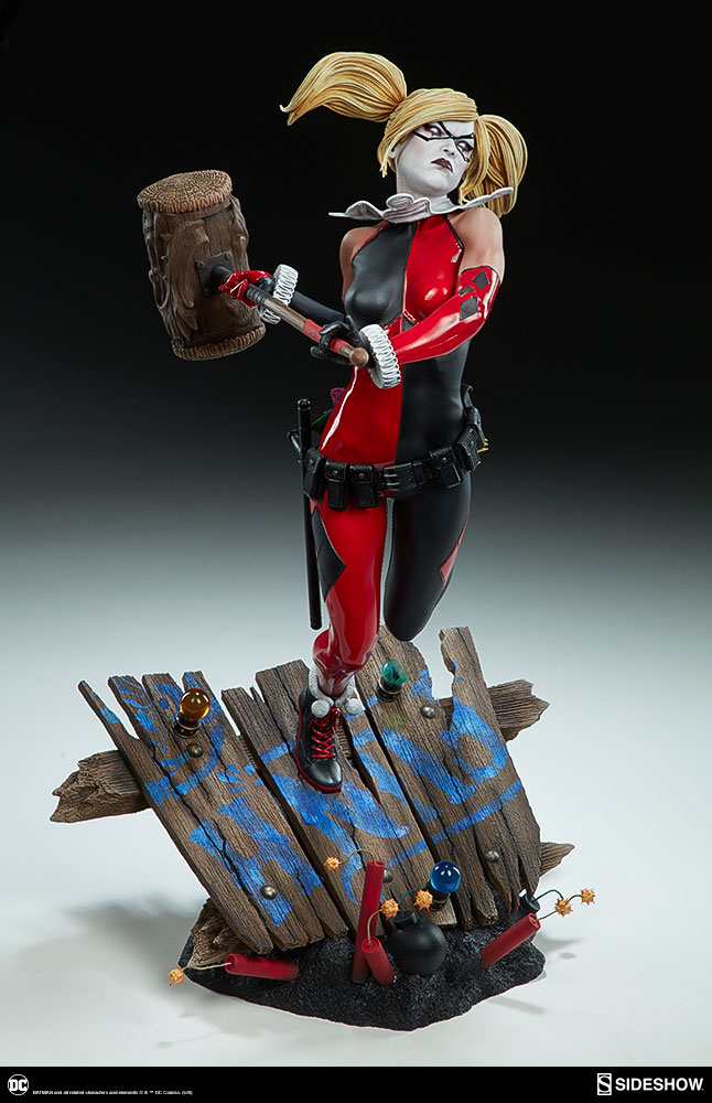 ABOUT THIS PREMIUM FORMAT™ FIGURE“That’s when everything went ka-blooey!” No fooling! Sideshow is proud to present the Harley Quinn Premium Format™Figure, ready to paint Gotham red and black with her antics. Harley Quinn measures 20” tall, leaping off a derelict funhouse base packed with gunpowder and crackling explosives. This resin figure has an entirely sculpted costume decked out with diamond patterns and frills, all in Harley’s signature red, black, and white style. The Harley Quinn Premium Format Figure includes two interchangeable portraits so that you can display your favorite face of Gotham’s maid of mischief! Her pouting unmasked portrait features her classic white makeup, a thin domino mask, and blonde hair pulled back into pigtails. Her masked portrait features a gleeful grin framed by her iconic harlequin hood, white makeup, and domino mask. A girl’s gotta accessorize! Harley Quinn is wearing a stolen Gotham PD utility belt complete with a nightstick, a pair of purple Joker cuffs, tatters from Robin’s cape, and a little green in her pocket courtesy of Poison Ivy. Harley is ready to crack a few jokes and a few skulls with her massive hammer, detailed with stylized portraits of her darling hyenas Bud and Lou. The Exclusive edition of the Harley Quinn Premium Format™ Figure includes a Bat-in-the-Box accessory, which can be displayed in proximity to the figure. It’s time to make the Bat go SPLAT! Put the ‘laughter’ back in ‘slaughter’ and add the Harley Quinn Premium Format™ Figure to your DC collection today!LicenseDC ComicsTypePremium Format™ FigureMaterialsResinManufacturerSideshow CollectiblesArtistsZane Yarbrough (Design)Alex Pascenko (Design)Zac Roane (Design)Ian MacDonald (Design) Nathan Mansfield (Sculpt)Steve Lord (Sculpt)Adam Smith (Mold & Cast)Chie Izuma (Paint)Holly Knevelbaard (Paint)The Sideshow Design and Development TeamADDITIONAL DETAILS & DIMENSIONSExpected to ShipJan 2019 - Mar 2019Item shown is a prototype. When shipped, the final production piece may differ in appearance.Product Size20 H (508mm) x 12 W (304.8mm) x 10 L (254mm)*Product Weight12.00 lbs (5.44 kg)*Dimensional WeightTBDInt'l Dim. WeightTBD* Size and weight are approximate values.SKU3004741UPC747720232273BATMAN and all related characters and elements © & ™ DC Comics. (s18)