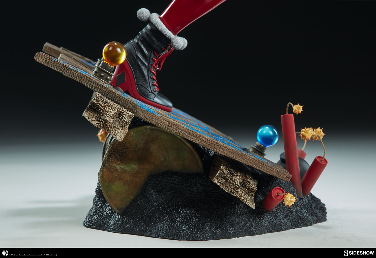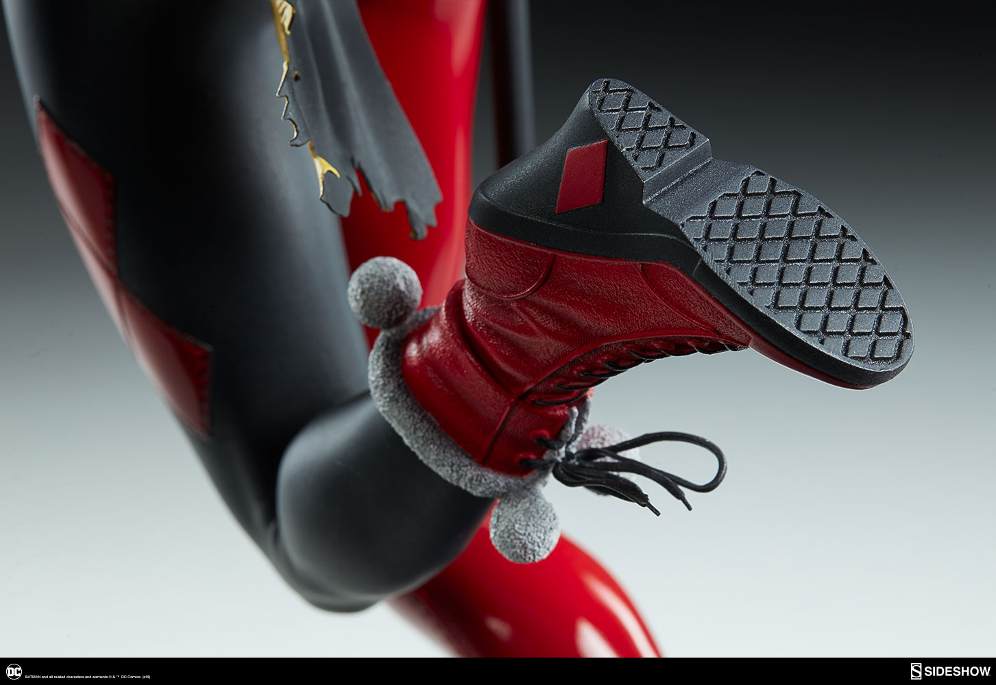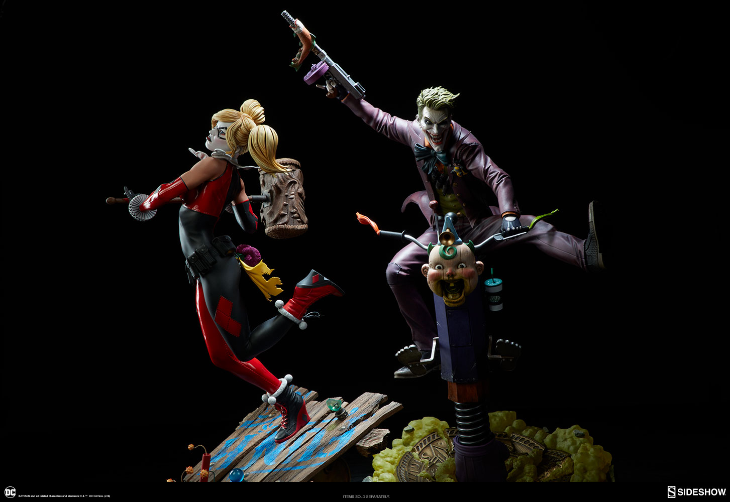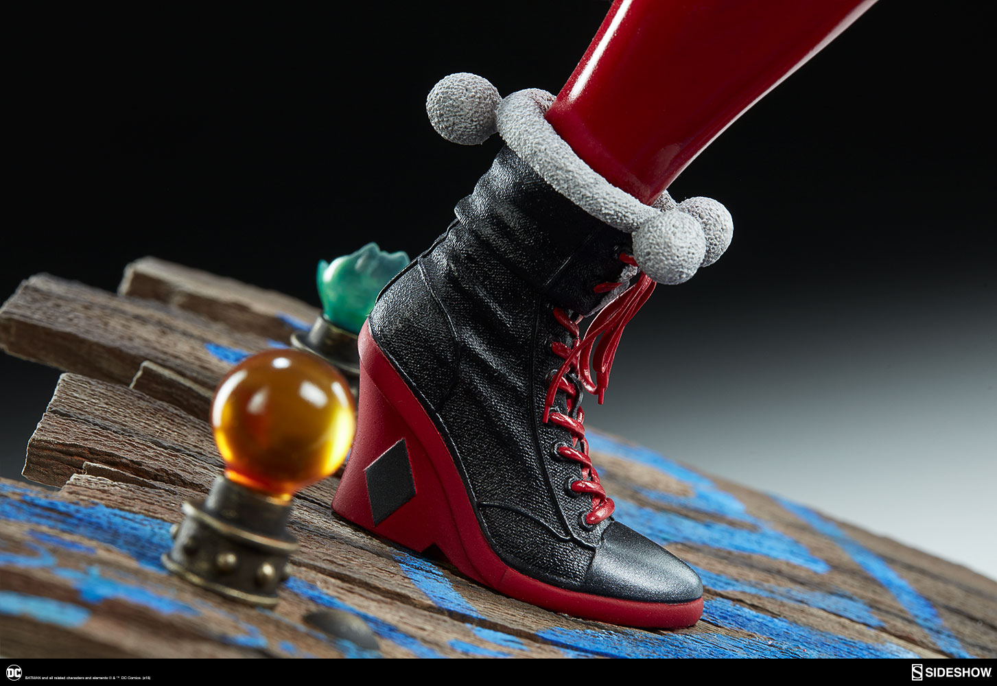 ABOUT THIS PREMIUM FORMAT™ FIGURE“That’s when everything went ka-blooey!” No fooling! Sideshow is proud to present the Harley Quinn Premium Format™Figure, ready to paint Gotham red and black with her antics. Harley Quinn measures 20” tall, leaping off a derelict funhouse base packed with gunpowder and crackling explosives. This resin figure has an entirely sculpted costume decked out with diamond patterns and frills, all in Harley’s signature red, black, and white style. The Harley Quinn Premium Format Figure includes two interchangeable portraits so that you can display your favorite face of Gotham’s maid of mischief! Her pouting unmasked portrait features her classic white makeup, a thin domino mask, and blonde hair pulled back into pigtails. Her masked portrait features a gleeful grin framed by her iconic harlequin hood, white makeup, and domino mask. A girl’s gotta accessorize! Harley Quinn is wearing a stolen Gotham PD utility belt complete with a nightstick, a pair of purple Joker cuffs, tatters from Robin’s cape, and a little green in her pocket courtesy of Poison Ivy. Harley is ready to crack a few jokes and a few skulls with her massive hammer, detailed with stylized portraits of her darling hyenas Bud and Lou. The Exclusive edition of the Harley Quinn Premium Format™ Figure includes a Bat-in-the-Box accessory, which can be displayed in proximity to the figure. It’s time to make the Bat go SPLAT! Put the ‘laughter’ back in ‘slaughter’ and add the Harley Quinn Premium Format™ Figure to your DC collection today!LicenseDC ComicsTypePremium Format™ FigureMaterialsResinManufacturerSideshow CollectiblesArtistsZane Yarbrough (Design)Alex Pascenko (Design)Zac Roane (Design)Ian MacDonald (Design) Nathan Mansfield (Sculpt)Steve Lord (Sculpt)Adam Smith (Mold & Cast)Chie Izuma (Paint)Holly Knevelbaard (Paint)The Sideshow Design and Development TeamADDITIONAL DETAILS & DIMENSIONSExpected to ShipJan 2019 - Mar 2019Item shown is a prototype. When shipped, the final production piece may differ in appearance.Product Size20 H (508mm) x 12 W (304.8mm) x 10 L (254mm)*Product Weight12.00 lbs (5.44 kg)*Dimensional WeightTBDInt'l Dim. WeightTBD* Size and weight are approximate values.SKU3004741UPC747720232273BATMAN and all related characters and elements © & ™ DC Comics. (s18)