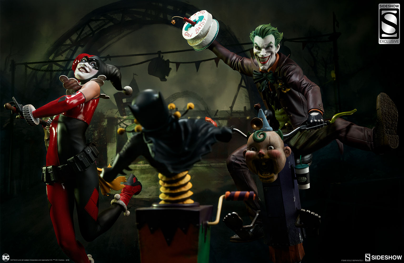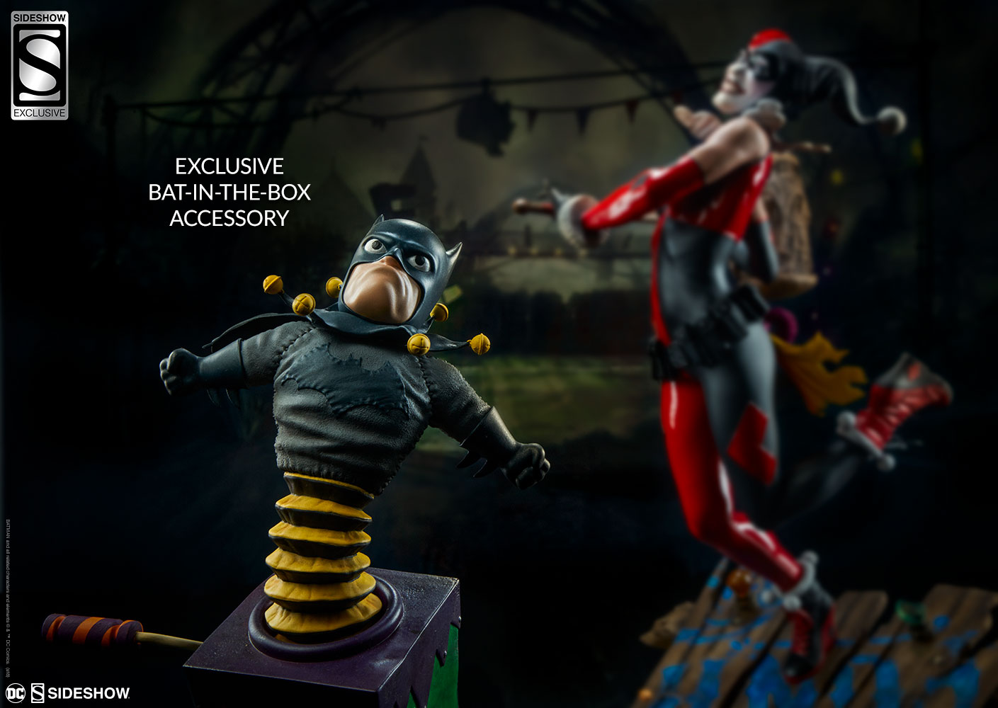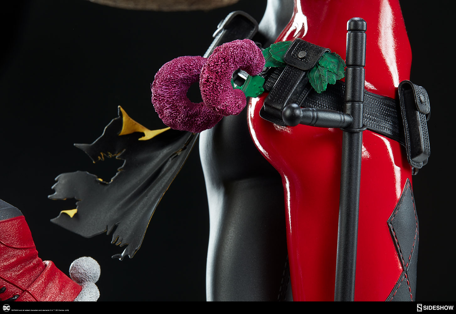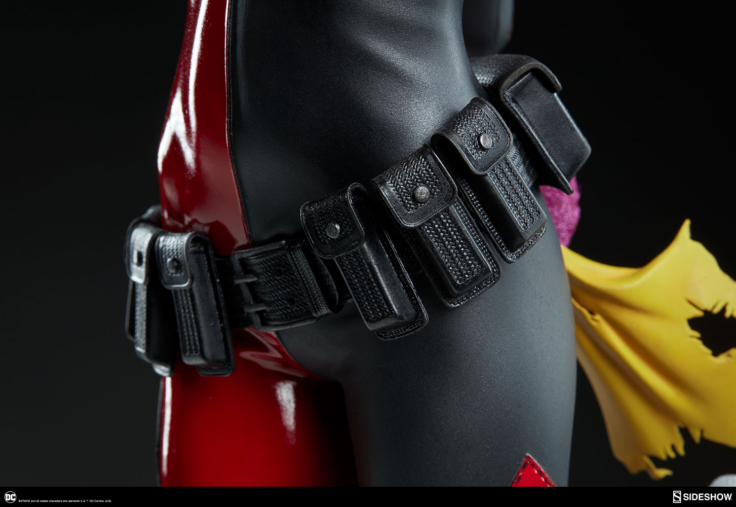 ABOUT THIS PREMIUM FORMAT™ FIGURE“That’s when everything went ka-blooey!” No fooling! Sideshow is proud to present the Harley Quinn Premium Format™Figure, ready to paint Gotham red and black with her antics. Harley Quinn measures 20” tall, leaping off a derelict funhouse base packed with gunpowder and crackling explosives. This resin figure has an entirely sculpted costume decked out with diamond patterns and frills, all in Harley’s signature red, black, and white style. The Harley Quinn Premium Format Figure includes two interchangeable portraits so that you can display your favorite face of Gotham’s maid of mischief! Her pouting unmasked portrait features her classic white makeup, a thin domino mask, and blonde hair pulled back into pigtails. Her masked portrait features a gleeful grin framed by her iconic harlequin hood, white makeup, and domino mask. A girl’s gotta accessorize! Harley Quinn is wearing a stolen Gotham PD utility belt complete with a nightstick, a pair of purple Joker cuffs, tatters from Robin’s cape, and a little green in her pocket courtesy of Poison Ivy. Harley is ready to crack a few jokes and a few skulls with her massive hammer, detailed with stylized portraits of her darling hyenas Bud and Lou. The Exclusive edition of the Harley Quinn Premium Format™ Figure includes a Bat-in-the-Box accessory, which can be displayed in proximity to the figure. It’s time to make the Bat go SPLAT! Put the ‘laughter’ back in ‘slaughter’ and add the Harley Quinn Premium Format™ Figure to your DC collection today!LicenseDC ComicsTypePremium Format™ FigureMaterialsResinManufacturerSideshow CollectiblesArtistsZane Yarbrough (Design)Alex Pascenko (Design)Zac Roane (Design)Ian MacDonald (Design) Nathan Mansfield (Sculpt)Steve Lord (Sculpt)Adam Smith (Mold & Cast)Chie Izuma (Paint)Holly Knevelbaard (Paint)The Sideshow Design and Development TeamADDITIONAL DETAILS & DIMENSIONSExpected to ShipJan 2019 - Mar 2019Item shown is a prototype. When shipped, the final production piece may differ in appearance.Product Size20 H (508mm) x 12 W (304.8mm) x 10 L (254mm)*Product Weight12.00 lbs (5.44 kg)*Dimensional WeightTBDInt'l Dim. WeightTBD* Size and weight are approximate values.SKU3004741UPC747720232273BATMAN and all related characters and elements © & ™ DC Comics. (s18)