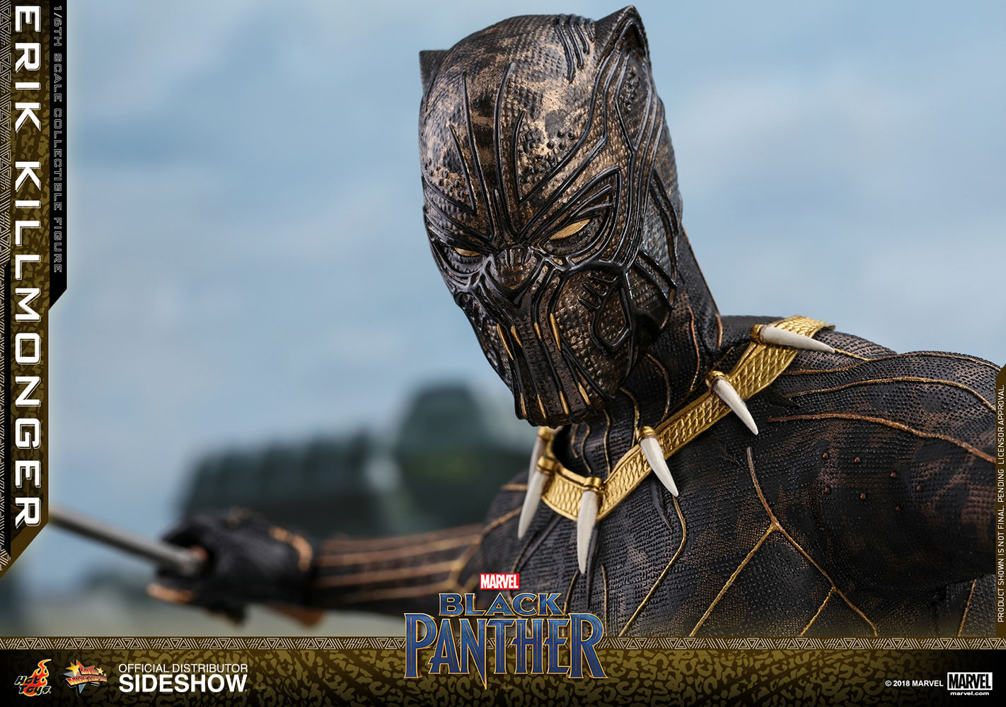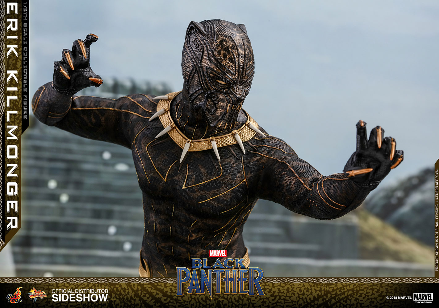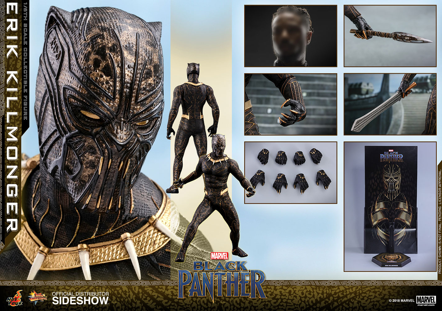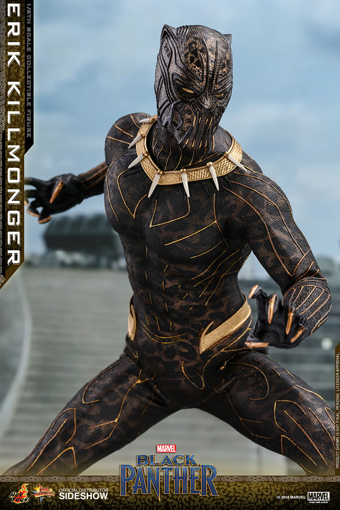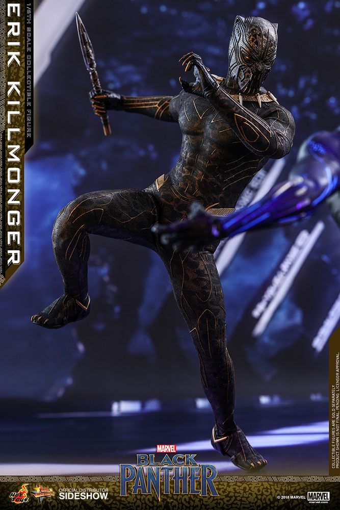 ABOUT THIS SIXTH SCALE FIGURE“The world’s going to start over and I’m going to be on top.”The latest blockbuster by Marvel Studios, Black Panther, has taken the world by storm! In this exciting new film, Erik Killmonger, a dissident member from Wakanda is a militant villain who vied with Black Panther for the throne.Following the launch of the Black Panther collectible figurine, Hot Toys is thrilled to present today the first cousin of King T’Challa, Erik Killmonger in sixth scale collectible figure.The screen–accurate collectible figure is specially crafted based on the appearance of Michael B. Jordan as Erik Killmonger in the film featuring two interchangeable heads which include a newly sculpted unmasked head sculpt with authentic likeness and all-new masked head with fangs and highly detailed textures, a newly developed muscular body, skillfully tailored Golden Jaguar suit with remarkable tailoring and golden accents, detail recreation of Erik Killmonger’s weapons, and a specially designed movie-themed figure stand!Now is the time to add the collectible figure of Black Panther’s formidable adversary, Erik Killmonger to your expanding Marvel Cinematic Universe collection! LicenseMarvelTypeSixth Scale FigureManufacturerHot ToysWHAT'S IN THE BOX?The Erik Killmonger Sixth Scale Collectible Figure specially features:One (1) newly developed interchangeable head sculpt with authentic and detailed likeness of Michael B. Jordan of Erik Killmonger in Black PantherOne (1) newly developed interchangeable Erik Killmonger masked head decorated with highly detailed textures and golden fangsApproximately 31.3 cm tallNewly developed muscular body with over 32 points of articulationsEight (8) pieces of interchangeable hands including: - One (1) pair of fists - One (1) pair of clenching hands - One (1) pair of clenching hands with claws - One (1) pair of hands for holding weaponsEach head sculpt is specially hand-paintedCostume:One (1) meticulously tailored black and gold colored Erik Killmonger’s Golden Jaguar Habit suitWeapons:One (1) swordOne (1) spearAccessory:Specially designed Black Panther themed hexagonal figure stand with character nameplate, movie logo and character backdropADDITIONAL DETAILS & DIMENSIONSExpected to ShipJul 2019 - Sep 2019Item shown is a prototype. When shipped, the final production piece may differ in appearance.Product Size12.32 H (312.93mm)*Dimensional WeightTBDInt'l Dim. WeightTBD* Size and weight are approximate values.SKU903413UPC4897011185835© 2018 MARVEL .© 2018 Hot Toys Limited. All Rights Reserved.Note: **Prototype shown is not final, pending licensor and talent approval
