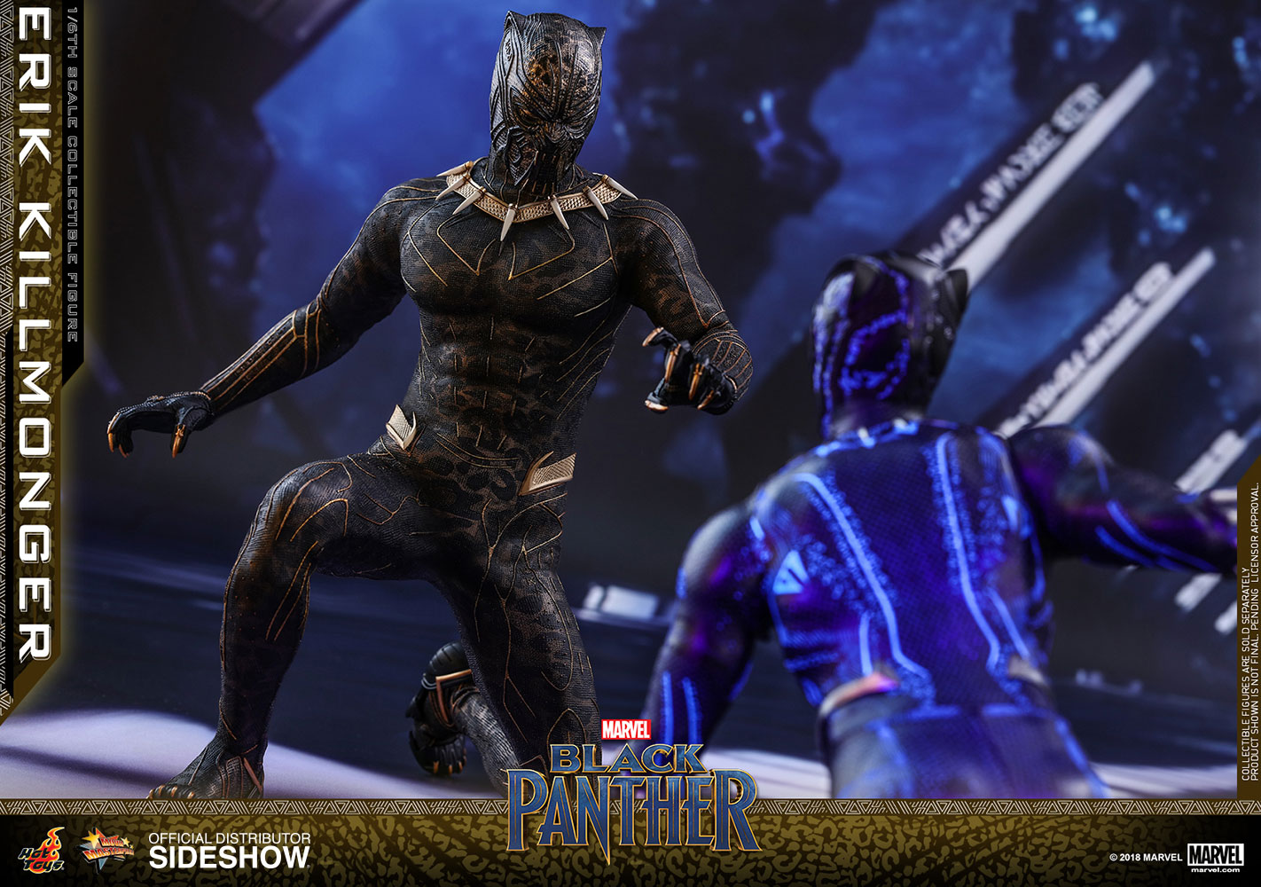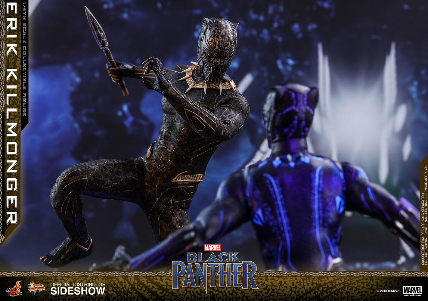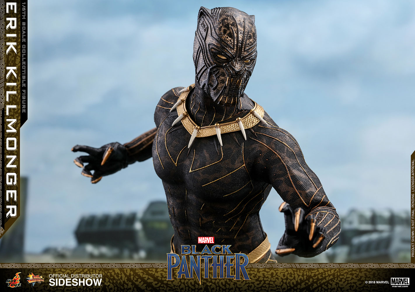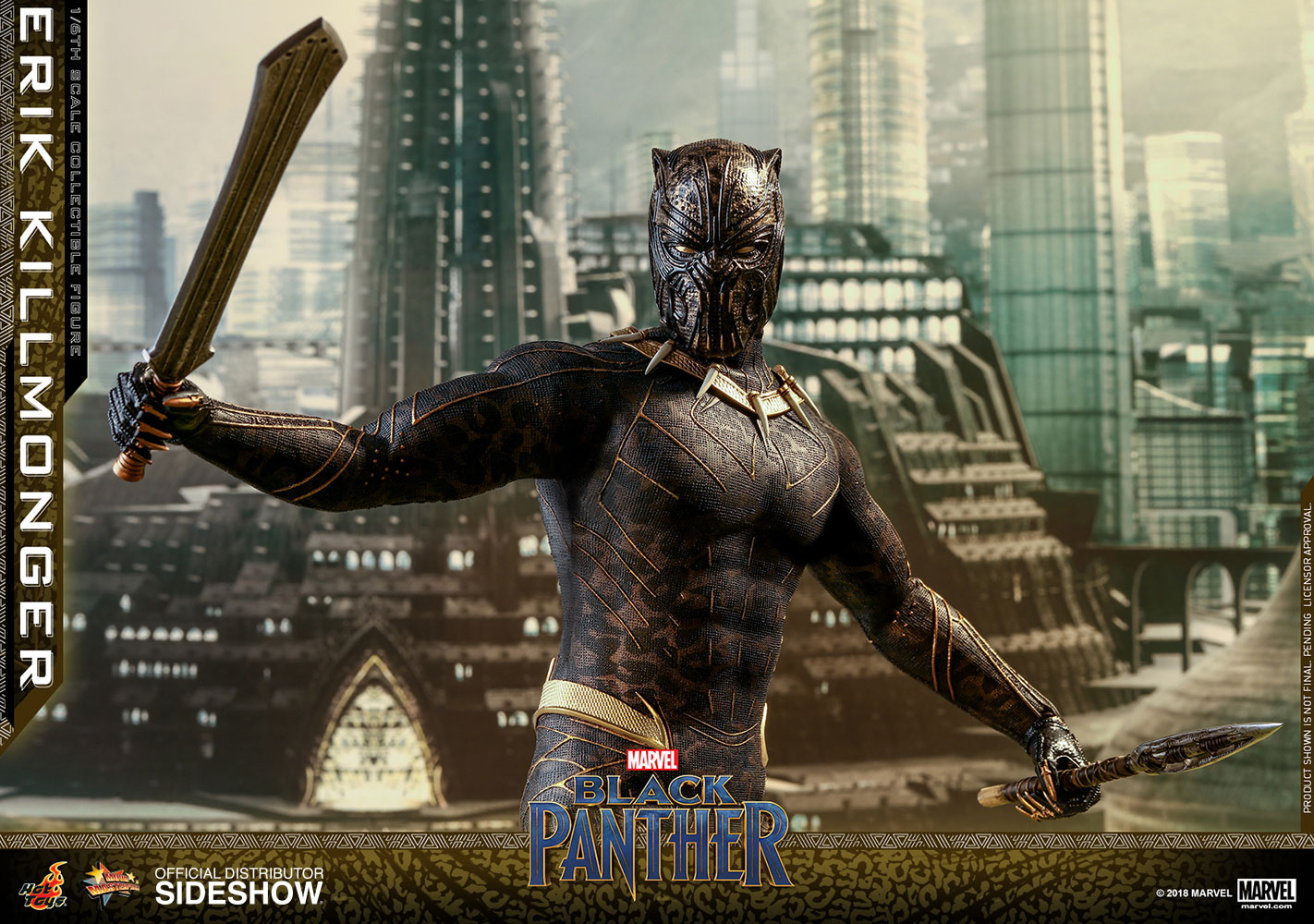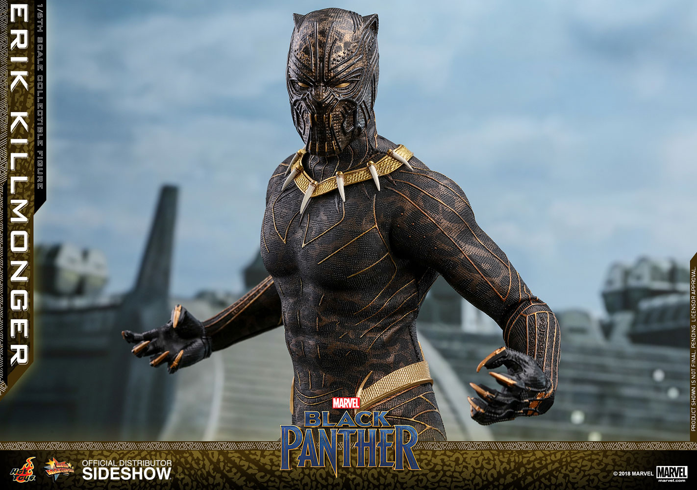 ABOUT THIS SIXTH SCALE FIGURE“The world’s going to start over and I’m going to be on top.”The latest blockbuster by Marvel Studios, Black Panther, has taken the world by storm! In this exciting new film, Erik Killmonger, a dissident member from Wakanda is a militant villain who vied with Black Panther for the throne.Following the launch of the Black Panther collectible figurine, Hot Toys is thrilled to present today the first cousin of King T’Challa, Erik Killmonger in sixth scale collectible figure.The screen–accurate collectible figure is specially crafted based on the appearance of Michael B. Jordan as Erik Killmonger in the film featuring two interchangeable heads which include a newly sculpted unmasked head sculpt with authentic likeness and all-new masked head with fangs and highly detailed textures, a newly developed muscular body, skillfully tailored Golden Jaguar suit with remarkable tailoring and golden accents, detail recreation of Erik Killmonger’s weapons, and a specially designed movie-themed figure stand!Now is the time to add the collectible figure of Black Panther’s formidable adversary, Erik Killmonger to your expanding Marvel Cinematic Universe collection! LicenseMarvelTypeSixth Scale FigureManufacturerHot ToysWHAT'S IN THE BOX?The Erik Killmonger Sixth Scale Collectible Figure specially features:One (1) newly developed interchangeable head sculpt with authentic and detailed likeness of Michael B. Jordan of Erik Killmonger in Black PantherOne (1) newly developed interchangeable Erik Killmonger masked head decorated with highly detailed textures and golden fangsApproximately 31.3 cm tallNewly developed muscular body with over 32 points of articulationsEight (8) pieces of interchangeable hands including: - One (1) pair of fists - One (1) pair of clenching hands - One (1) pair of clenching hands with claws - One (1) pair of hands for holding weaponsEach head sculpt is specially hand-paintedCostume:One (1) meticulously tailored black and gold colored Erik Killmonger’s Golden Jaguar Habit suitWeapons:One (1) swordOne (1) spearAccessory:Specially designed Black Panther themed hexagonal figure stand with character nameplate, movie logo and character backdropADDITIONAL DETAILS & DIMENSIONSExpected to ShipJul 2019 - Sep 2019Item shown is a prototype. When shipped, the final production piece may differ in appearance.Product Size12.32 H (312.93mm)*Dimensional WeightTBDInt'l Dim. WeightTBD* Size and weight are approximate values.SKU903413UPC4897011185835© 2018 MARVEL .© 2018 Hot Toys Limited. All Rights Reserved.Note: **Prototype shown is not final, pending licensor and talent approval