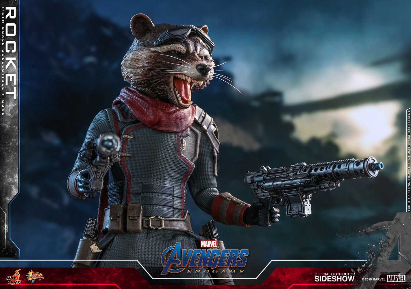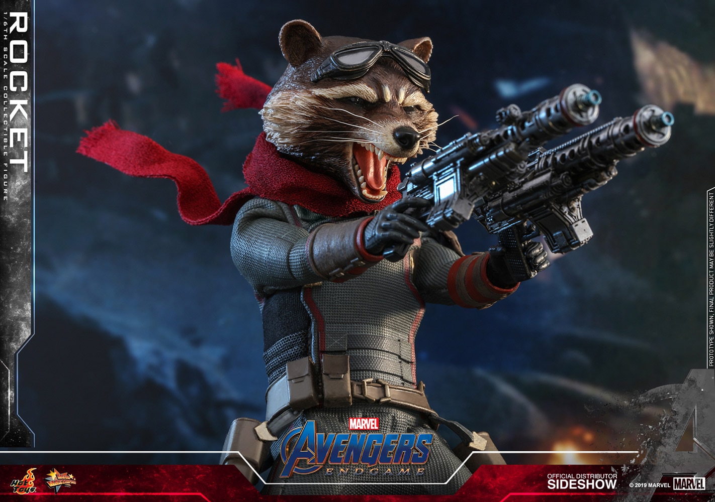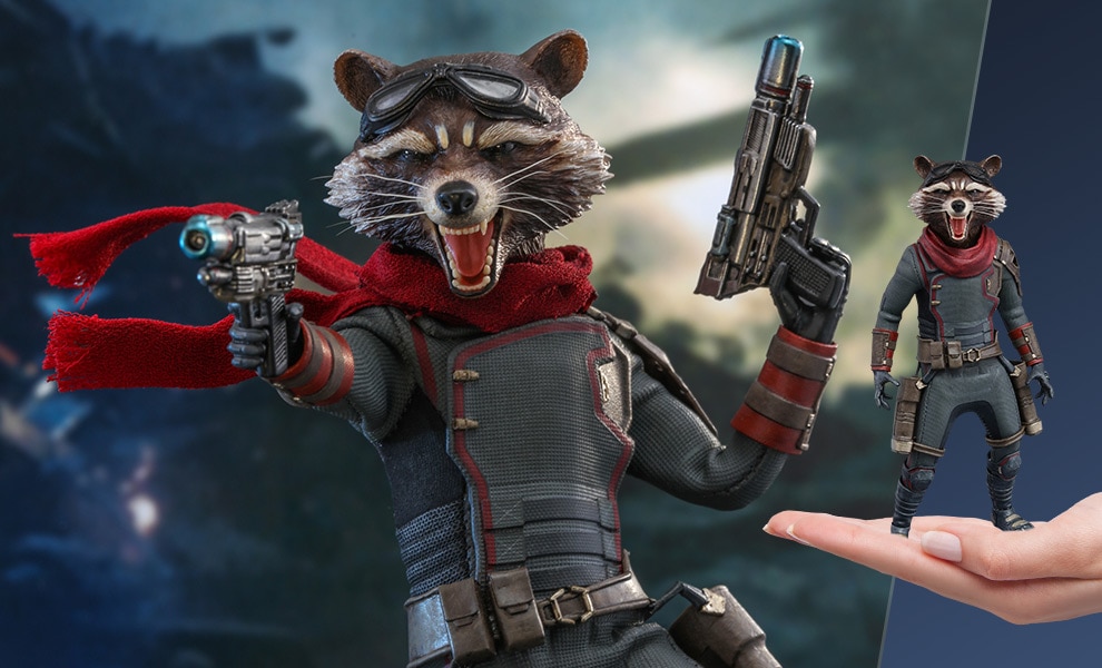 ABOUT THIS SIXTH SCALE FIGURE“Okay, who here hasn’t been to space? You better not throw up on my ship.”Getting paid is no longer a priority for this genetically altered furry criminal. Rocket might have a fresh lease on life, but that does not mean he will hold back on any of his ammunition, explosives or wisecracks when it comes to fighting for the lives of his newfound family.Sideshow and Hot Toys present the Rocket Sixth Scale Collectible Figure from Marvel Studios’ Avengers: Endgame.Masterfully crafted based on the unique physique of Rocket in the movie, the figure features a newly painted head portraying his roaring expression with striking likeness, a meticulously tailored costume with interchangeable scarves, a number of interchangeable hands, pistols and blasters, highly-detailed accessories including a Sixth Scale Nano Gauntlet, a pair of goggles, an Aether extraction, and a specially designed dynamic figure stand with movie logo.The Rocket Sixth Scale Collectible Figure is an essential addition to your Avengers: Endgame collection!BrandMarvelManufacturerHot ToysTypeSixth Scale FigureArtistsSo-Young Lee (Head Sculpt)JC. Hong (Paint) (Head Art Direction)WHAT'S IN THE BOX?The Rocket Sixth Scale Collectible Figure specially features:Newly painted roaring expression head sculpt with authentic and detailed likeness of Rocket from Avengers: EndgameMovie-accurate facial expression and detailed fur textureApproximately 16 cm tallNewly developed specialized body with over 20 points of articulationFive (5) pairs of interchangeable gloved hands including: - One (1) pair of relaxed hands- One (1) pair of hands for holding guns- One (1) left hand for holding Aether extractionEach head sculpt is specially hand-paintedCostume:One (1) grayish blue space suitOne (1) utility belt with pouchesOne (1) burgundy colored scarfOne (1) burgundy colored fabric scarfOne (1) pair of grayish blue colored bootsWeapons:Two (2) pistolsTwo (2) blastersAccessories:One (1) Nano GauntletOne (1) pair of gogglesOne (1) Aether extractionOne (1) Specially designed movie-themed dynamic figure stand movie logoADDITIONAL DETAILS & DIMENSIONSMaterialsProduct SizeHeight: 6.29 (159.77 mm) | *Dimensional Weight0.00 lbs (0 kg) [Intl. 0.00 lbs (0 kg)] ** Size and weight are approximate values. Learn moreSKU904925UPC4895228602572© 2019 Marvel. © 2019 Hot Toys Limited. All Rights Reserved.