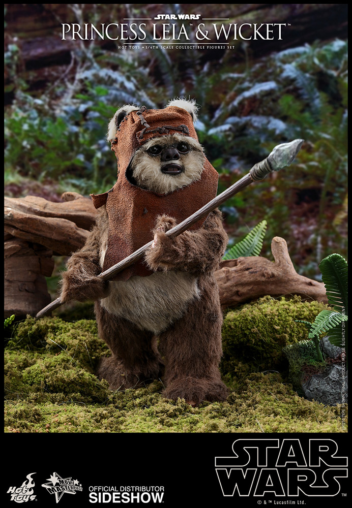 ABOUT THIS SIXTH SCALE FIGURE SET“You're a jittery little thing, aren't you?”In the final chapter of the original Star Wars trilogy, the Rebel Alliance penetrates the forest moon of Endor in order to shut down the deflector shield generator that is protecting the second Death Star. During the mission, Princess Leia is separated from her team and befriends Wicket the Ewok who proves to be great ally for the Rebel Alliance in the dangerous battle of Endor.Sidshow and Hot Toys present the Princess Leia and Wicket Sixth Scale Collectible Figure Set! The highly-accurate Princess Leia collectible figure is specially crafted based on the appearance of Leia Organa in Star Wars: Return of the Jedi. It features a stunning head sculpt with astonishing likeness and new hair sculpture, Leia’s Endor outfit, a camouflage pattern poncho, helmet, blaster, watch, diorama accessories and an Endor themed figure base.The Wicket collectible figure is finely crafted based on the appearance of Wicket featuring a highly detailed face sculpture, newly developed multiple layers of fabric hair with various shades of white and brown throughout whole body capturing Ewok’s unique appearance. Wicket also features a spear, drumsticks, a variety of hands, diorama accessory and an Endor themed figure base.Furthermore, this collectible figures set will exclusively include a stormtrooper and Death Star Trooper helmet with weathering effects.This amazing Star Wars Collectible Figure Set will surely be a great addition to any Star Wars Collection!BrandStar WarsManufacturerHot ToysTypeSixth Scale Figure SetArtistsSo Young Lee (Head Sculpt)E-Lee (Head Paint)JC. Hong (Head Paint) (Head Art Direction)WHAT'S IN THE BOX?The Princess Leia & Wicket Sixth Scale Collectible Set specially features:Princess Leia:Authentic and detailed likeness of Carrie Fisher as Princess Leia in Star Wars: Return of the Jedi Newly painted head sculpt with movie-accurate facial expression, make-up and detailed skin texture Highly detailed hair sculpture of Leia Organa with braided hair and bunHair sculpture is removable from head sculptBody with over 28 points of articulations Approximately 27 cm tallSix (6) pieces of interchangeable hands including: - One (1) pair of relaxed hands- One (1) pair of pistol holding hands- One (1) pair of gesture handsEach piece of head sculpt is specially hand-paintedCostume:One (1) helmet as worn on Endor One (1) camouflage pattern ponchoOne (1) light-green colored vestOne (1) yellow-colored middle sleeves topOne (1) pair of pale blue-colored pantsOne (1) black-colored utility belt with pistol holster One (1) pair of black-colored leather-like bootsWeapons:One (1) blasterAccessories:One (1) watchTwo (2) bushes diorama accessories attachable to the figure baseOne (1) Specially designed rectangular figure stand with character nameplate, movie logo and graphic cardWicket:Authentic and detailed likeness of Wicket in Star Wars: Return of the JediFace sculpt with highly-accurate facial expressionNewly developed multiple layers of weathered fabric hair with various shades of white and brown throughout whole bodyNewly developed body with over 23 points of articulationsApproximately 15.5 cm tallSix (6) pieces of interchangeable hands including: - One (1) pair of spear holding hands- One (1) pair of relaxed hands- One (1) gestured left hand with a snack- One (1) gestured left handCostume:One (1) brown-colored hood with weathering effectWeapons:One (1) spearAccessories:One (1) Stormtooper helmet with weathering effect*** Collectible Set OnlyOne (1) Death Star Trooper helmet with weathering effect*** Collectible Set OnlyTwo (2) drumsticksOne (1) diorama accessory attachable to the figure baseOne (1) Specially designed rectangular figure stand with character nameplate, movie logo and graphic card ADDITIONAL DETAILS & DIMENSIONSMaterialsProduct SizePrincess LeiaHeight: 10.62 (269.75 mm) | *Product SizeWicketHeight: 6.10 (154.94 mm) | *Dimensional Weight0.00 lbs (0 kg) [Intl. 0.00 lbs (0 kg)] ** Size and weight are approximate values.SKU905143UPC4895228602602© & TM Lucasfilm Ltd. © 2019 Hot Toys Limited. All Rights Reserved.