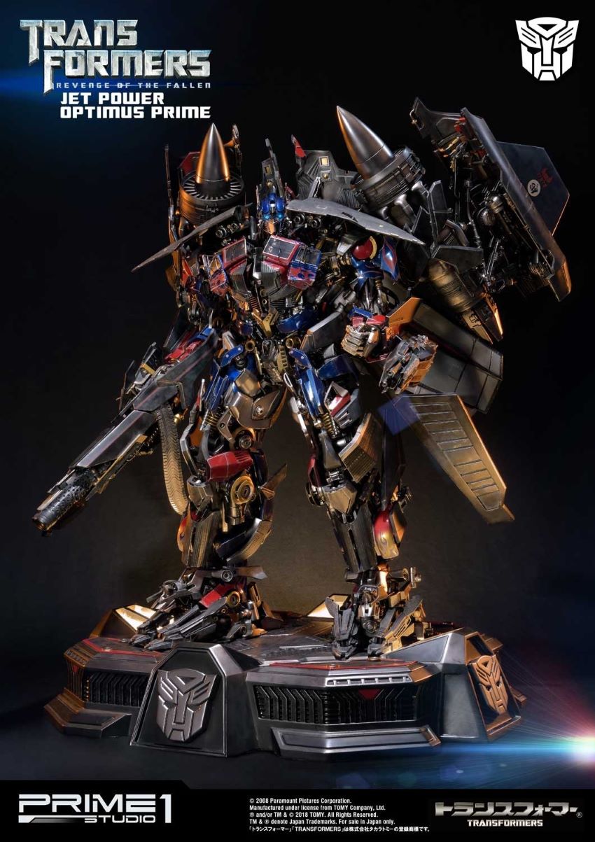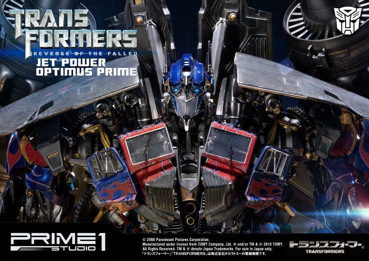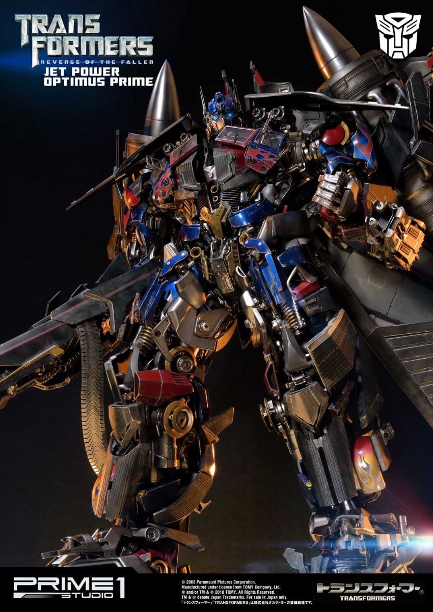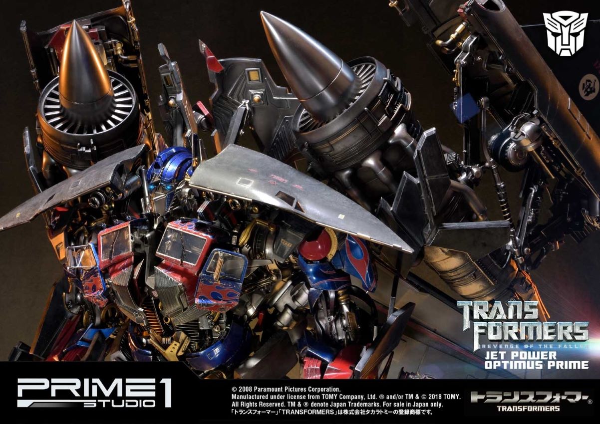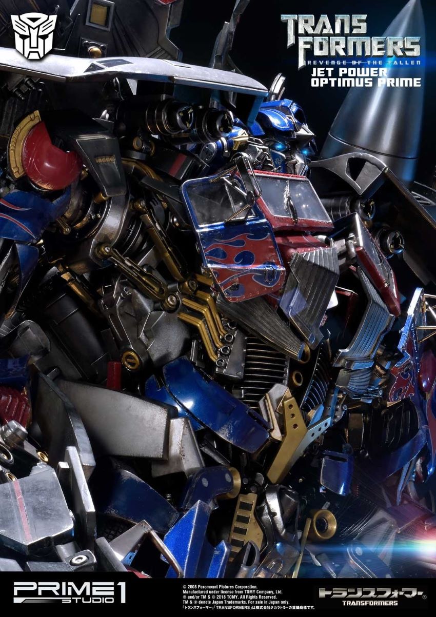 DescriptionsLet’s roll.”Prime 1 Studio is proud to present MMTFM-21: Jetpower Optimus Prime from The Transformers: Revenge of the Fallen. Transformers (ROTF) is a 2009 science fiction action film. It is the sequel to 2007’s Transformers, as well as the second installment in the live-action Transformers film series. Jetpower Optimus Prime is the upgrade form of Optimus Prime with Jetfire’s parts. In this form, Optimus possess various weapons, including a cannon on his arm, a machine gun, at least one of his swords from his normal mode and both afterburners on his back which can fire massive energy blasts as well. Specifications:Size approximately 37 inches tall [H:93.2cm W:72.4cm D:63.3cm]LED functions on eyes, cannon, afterburners & statue baseOne (1) alternate portraitNotice:Prototype samples shown.Product details could be subjected to change without further notice.HASBRO and its logo, TRANSFORMERS and all related characters are trademarks of Hasbro and are used with permission. © 2018 Hasbro. All Rights Reserved. © 2018 DreamWorks LLC and Paramount Pictures Corporation. Licensed by Hasbro.