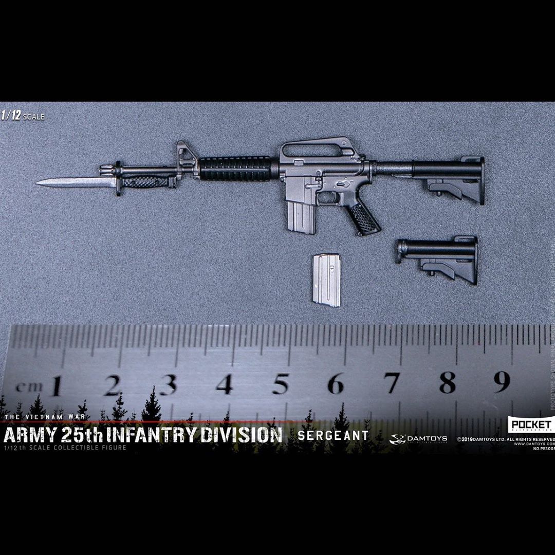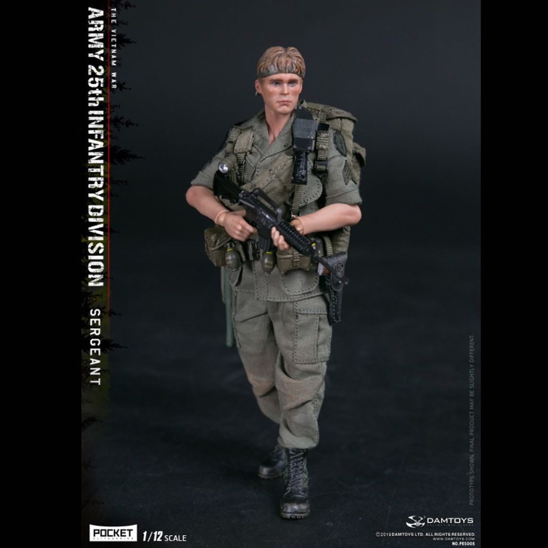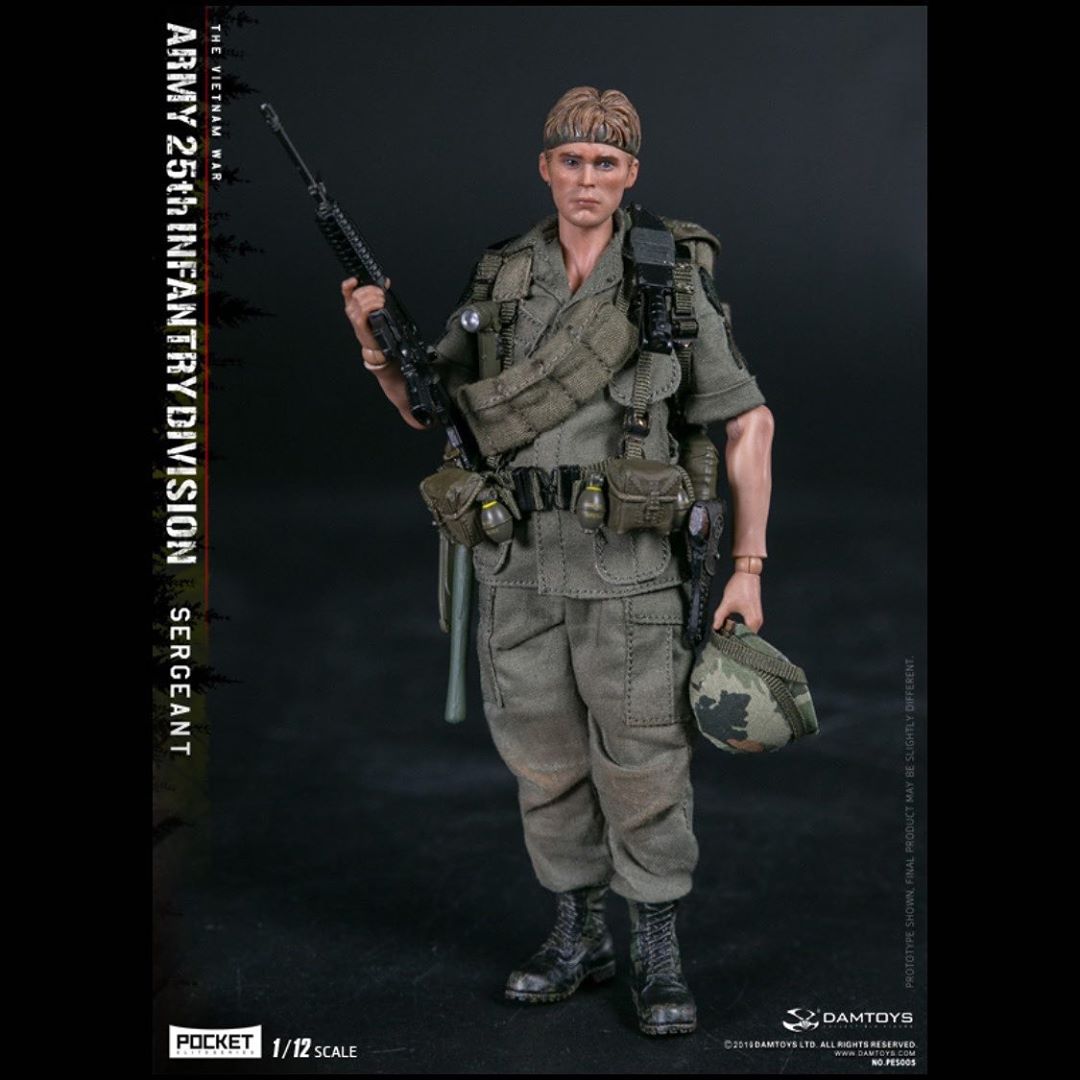 DAMTOYS : 1/12 POCKET ELITE SERIES:ARMY 25th Infantry Division Private SERGEANTNO.PES005BARCODE: 69705696296741/12 HEADSCULPTUREDAM 1/12 ACTION BADY(TYPE 2)1/12 ACTION BADY HANDS X8M1 HELMET(MITCHELL PATTERN HELMET COVER)1ST PATTERN OG 107 COAT (SLEEVE CUT)1ST PATTERN OG 107 COAT2ND PATTERN OG 107 PANTS3RD PATTERN JUNGLE BOOTSM1956 BELTM1956 H SUSPENDERSM1956 AMMO POUCH WITH M26 GRENADE X2M1956 CANTEENS POUCH X2M1956 E-TOOL WITH COVERJUNGLE FIRST AID KIT POUCHPISTOL HOLSTERARVN RUCKSACKROPEM7 BAYONETKA-BAR KNIFEFLASH LIGHTM3 BANDOLIER WITH M16 MAGM7A2 RIOT CS GRENADEINCEN TH GRENADEM1911A1 PISTOL(2 FORMS)MODEL 653 M16A1 CARBINEM16 MAG X2