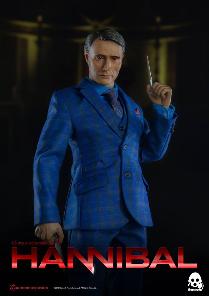 Dr. Hannibal Lecter collectible figure stands approximately 12” (30.5cm) tall, it's fully-articulated and highly detailed collectible, featuring likeness to the character portrayed in critically acclaimed TV series, including hand-stitched tailored 3-piece suit (Slacks, Vest and Coat), various extremely detailed accessories, Kill Suit, two Knives and three pairs of exchangeable hands.Dr. Hannibal Lecter purchased at Threezero Store comes with Stag Statue as the exclusive accessory.1/6th scale HANNIBAL Dr. Hannibal Lecter collectible details:12” (30.5cm) tall articulated figure featuring tailored 3-piece suit (slacks, vest, coat);Head sculpt with realistic likeness to the character portrayed in the TV series;Formal suit;Formal blue shirt;Vest;Silk tie;Pocket square;Handkerchief;Wingtip shoes;Two Knives;Wine Glass;Kill Suit (clear suit);Hannibal Flower Crown.Exchangeable hands:One pair of relaxed hands;One pair for holding wine glass;One pair for holding weapons hands.Threezero Store Exclusive:Stag Statue.