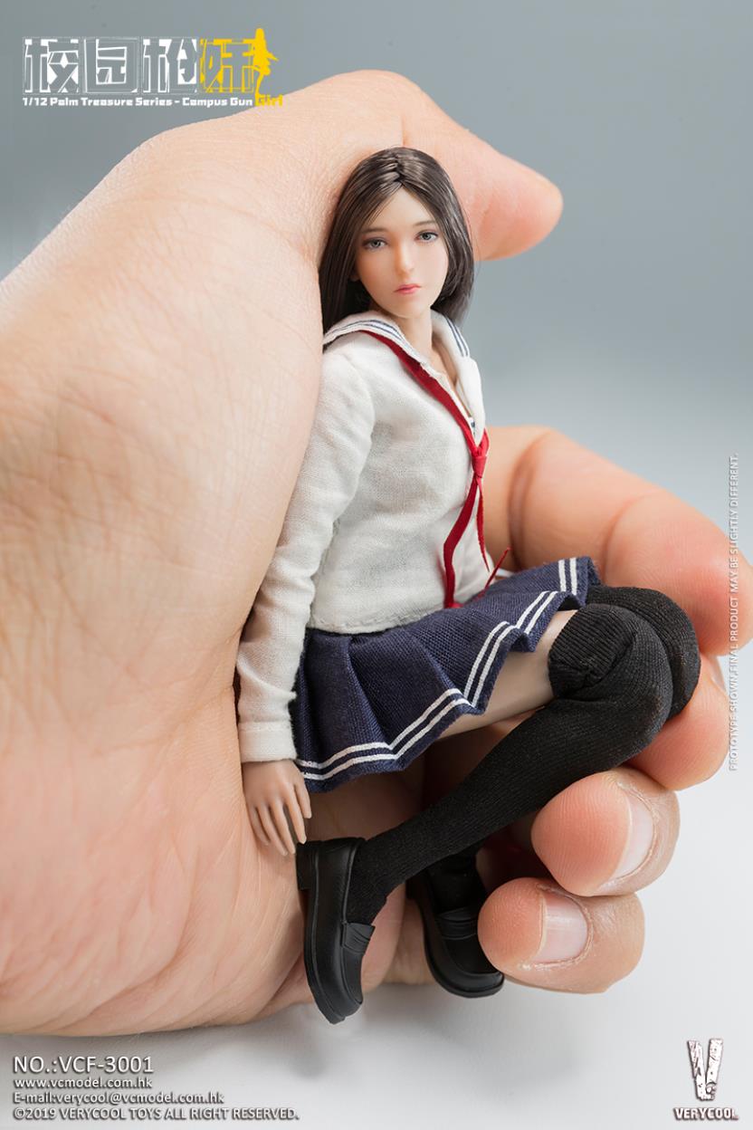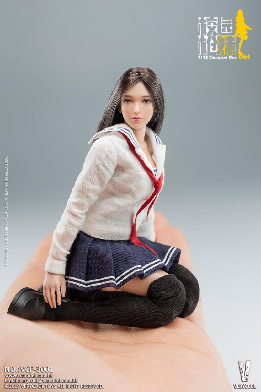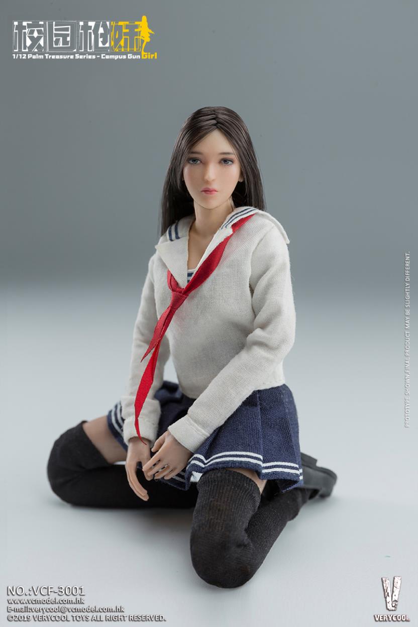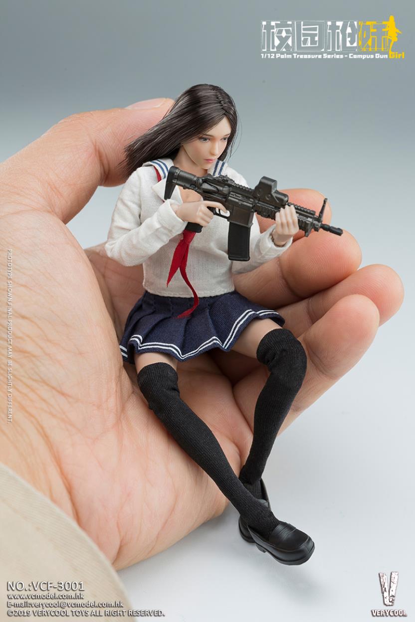 VERYCOOL: 1/12 Palm Treasure Series - Campus Gun Girl (CGG) Product No.: VCF-3001 Product List:- Emulational head sculpture- Campus uniform- Clothes( White)- Campus uniform-Short skirt(Blue)- Campus uniform-Little black shoes- Stockings(Black)- Red scarf- SIG MPX-K Sub-machine gun- SIG MPX-K Sub-machine gun - Red dot sight- Holding hand *2- Hook gun hand *2- Natural hand *2
