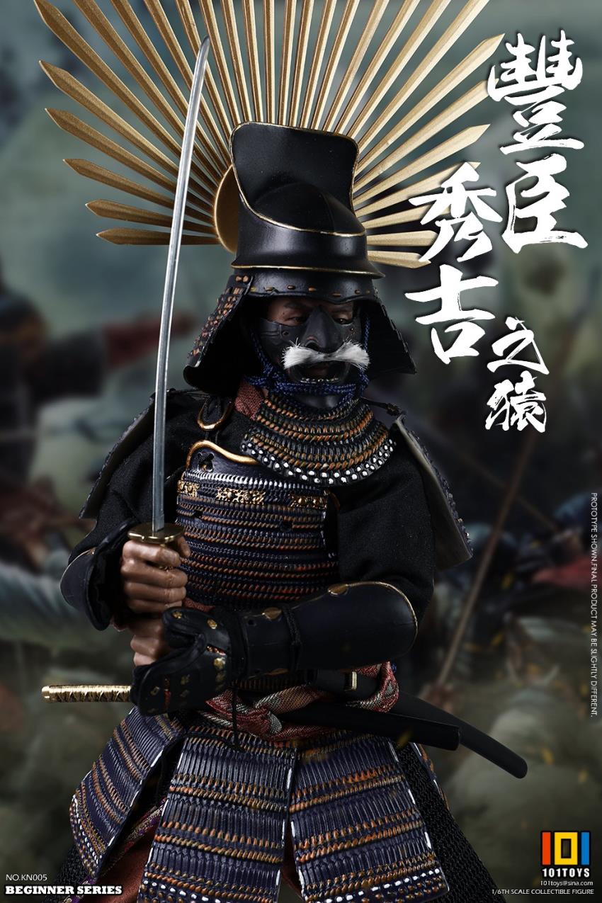 101TOYS 1/6 NO.KN005 Starting Point Series - Toyotomi Hideyoshi (Standard Edition)Main configuration:- Head carving- Body- 4 replacement handsClothing:- Tops- Pants- Belts- SandalsArmor:- Blue helmet- Blue Mask- Blue Nail- Blue Armor- Blue Shoulder- Blue Arm- Blue Leg- Red BeltWeapon:- Long knife (with scabbard)- Short knife (with scabbard)101TOYS 1 /6 NO.KN005 BEGINNER SERIES APE-Toyotomi Hideyoshi (STANDARD VERSION)Main Parts- One (1) head sculpt- One (1) body- Four (4) interchangeable palmsCostumes- One (1) coat- One (1) pair Of trousers- One (1) belt- One (1) pair of socks with sandalsArmors- One (1) blue helmet with buck horns- One (1) blue mask- One (1) blue neck armor- One (1) blue body armor- One (1) pair of blue shoulder armors- One (1) pair Of blue bracelets- One (1) pair of blue cuisses- One (1) red rope beltWeapons- One (1) long sword with scabbard- One (1) short sword with scabbard