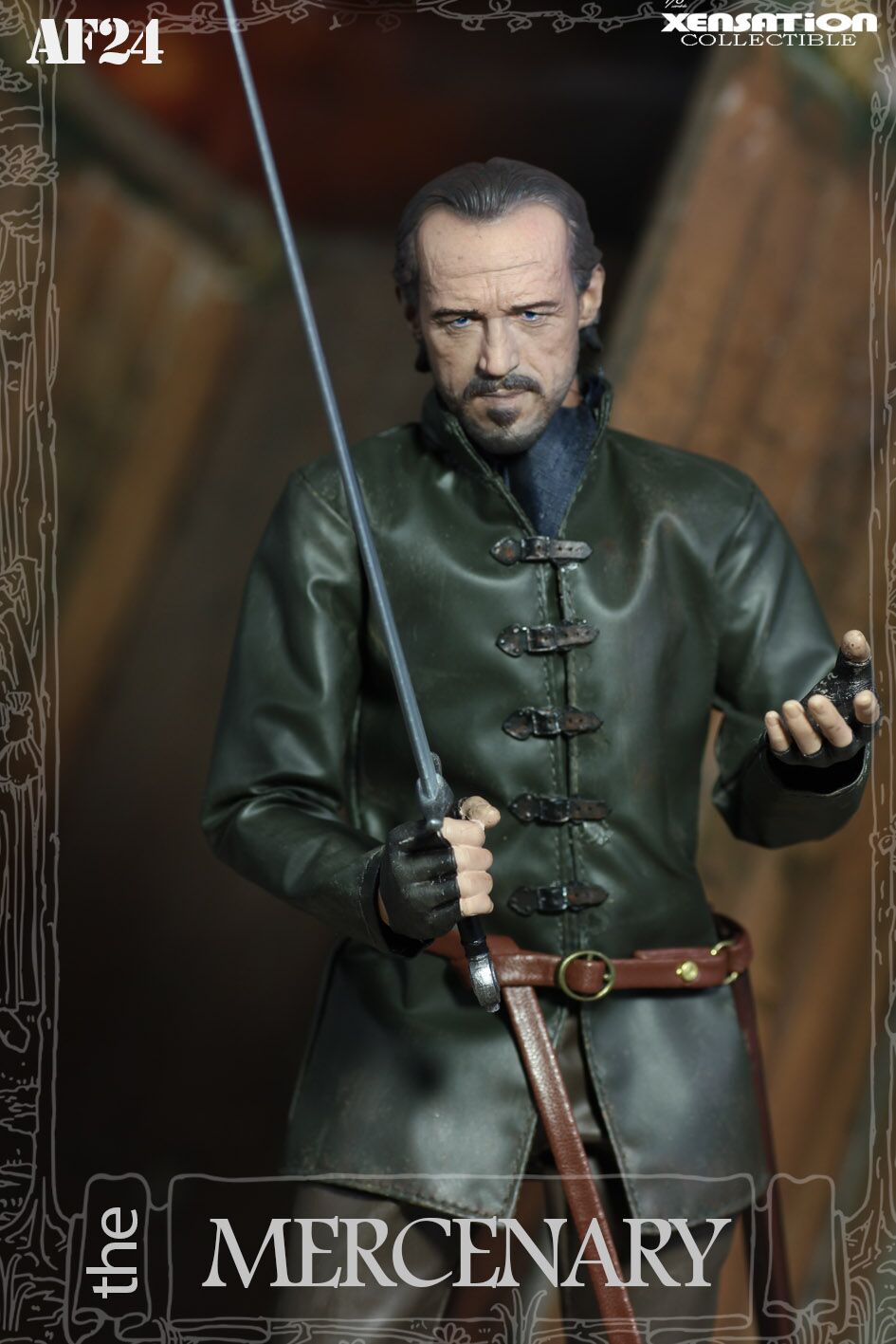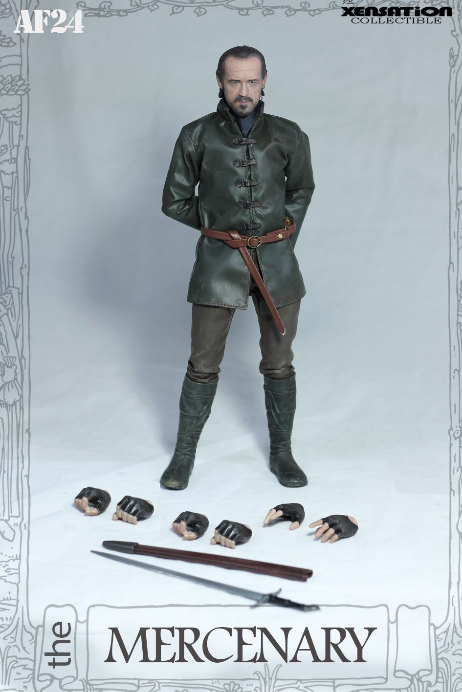Xensation: 1 / 6th Scaled: The Mercenary (Product ID: AF24)One detailed head sculpt (sideway gaze, with rooted beard appearance)One male action bodyOne blue scarfOne green faux-leather shirtOne pair of brown pantsOne beltSix exchangeable handsOne die-cast swordOne sheath